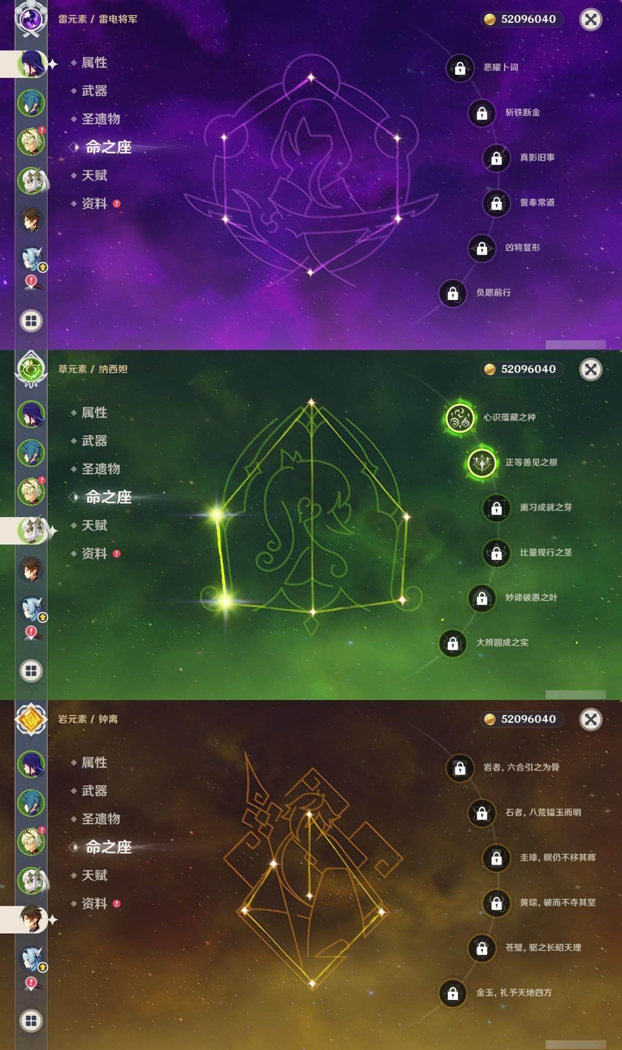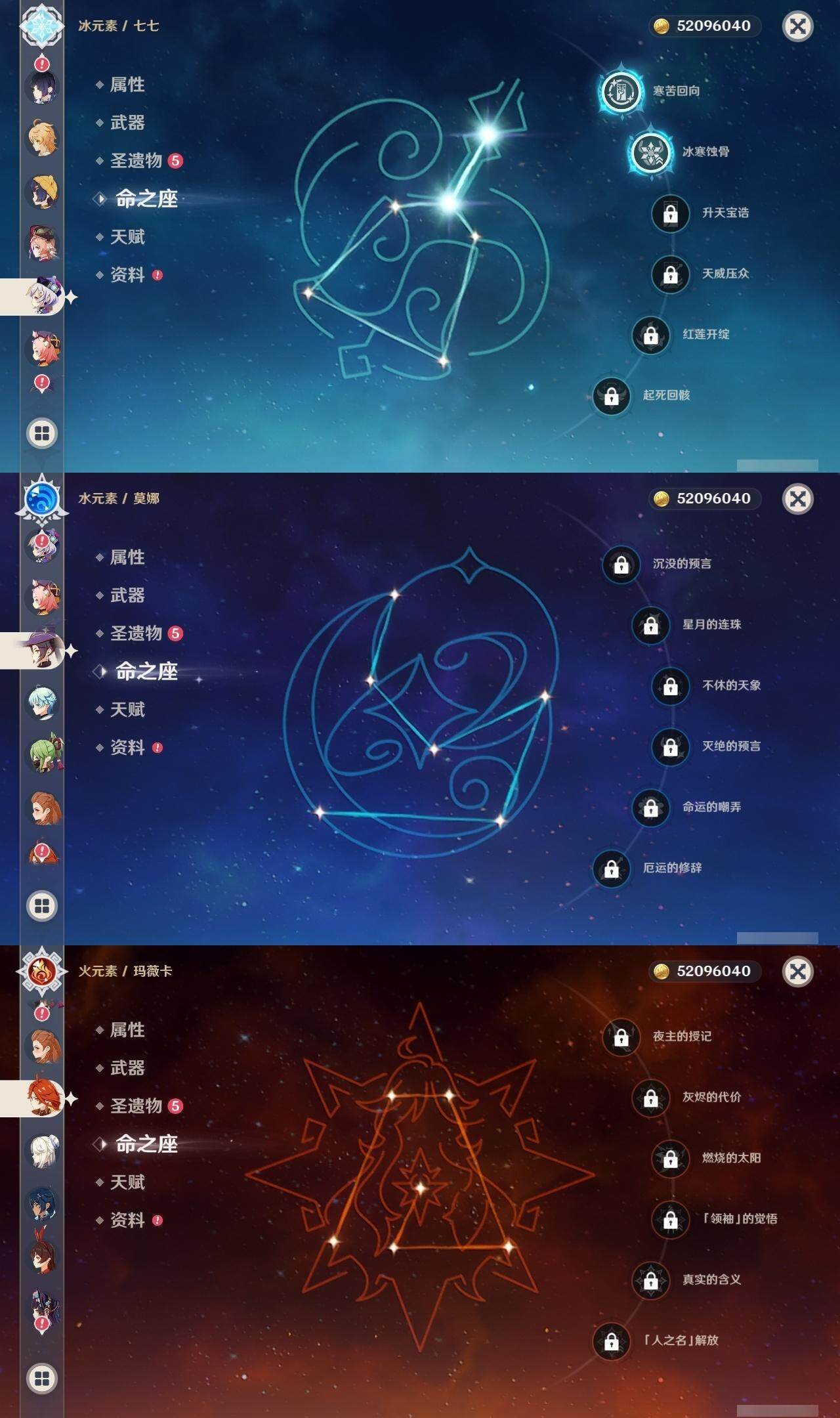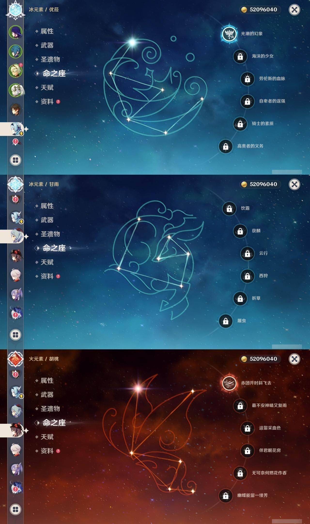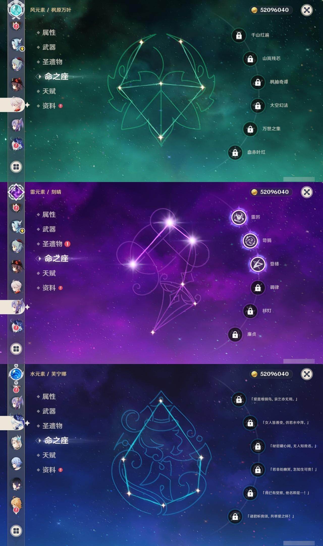0命芙宁娜,1命那维莱特,0命迪希雅,2命纳西妲,0命夜兰,0命神里绫人,1命优菈,0命雷电将军,0命枫原万叶,0命钟离,1命胡桃,0命甘雨,3命刻晴,2命七七,1命琴,0命莫娜,0命玛薇卡,精1千夜浮梦,精1薙草之稻光,精1苍古自由之誓,精1松籁响起之时,精1护摩之杖,精1阿莫斯之弓,精1天空之傲