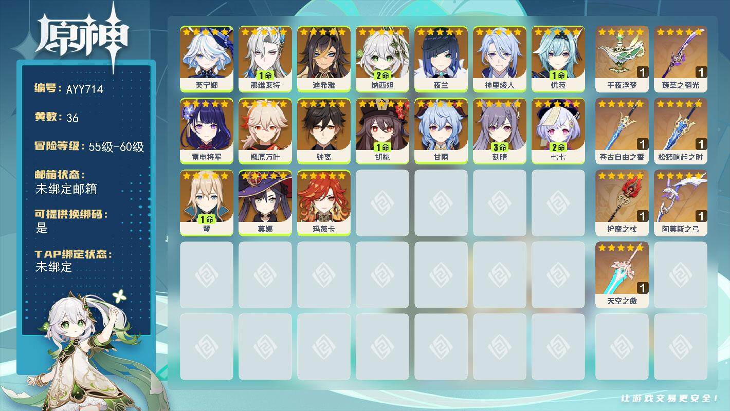 [17619045]58级/36黄/男主/17个五星角色/8个五星武器 0命芙宁娜,1命那维莱特,0命迪希雅,2命纳西妲,0命夜兰,0命神里绫人,1命优菈,0命雷电将军,0命枫原万叶,0命钟离,1命胡桃,0命甘雨,3命刻晴,2命七七,1命琴,0命莫娜,0命玛薇卡,精1千夜浮梦,精1薙草之稻光,精1苍古自由之誓,精1松籁响起之时,精1护摩之杖,精1阿莫斯之弓,精1天空之傲