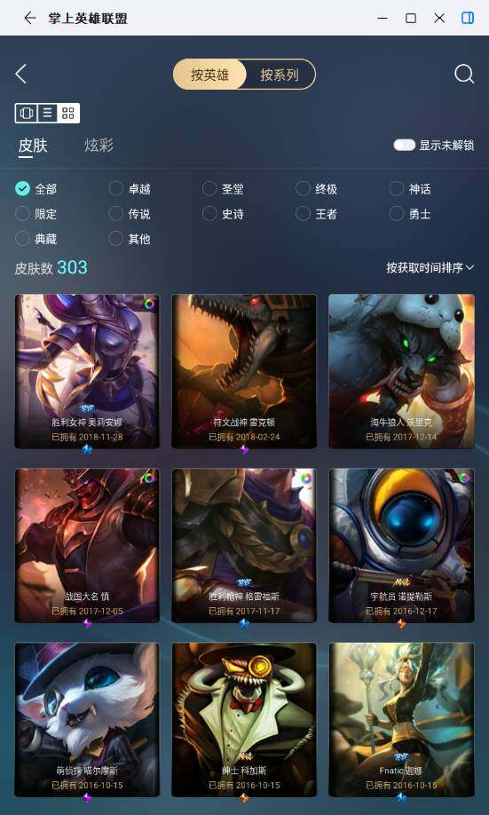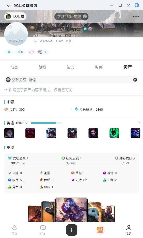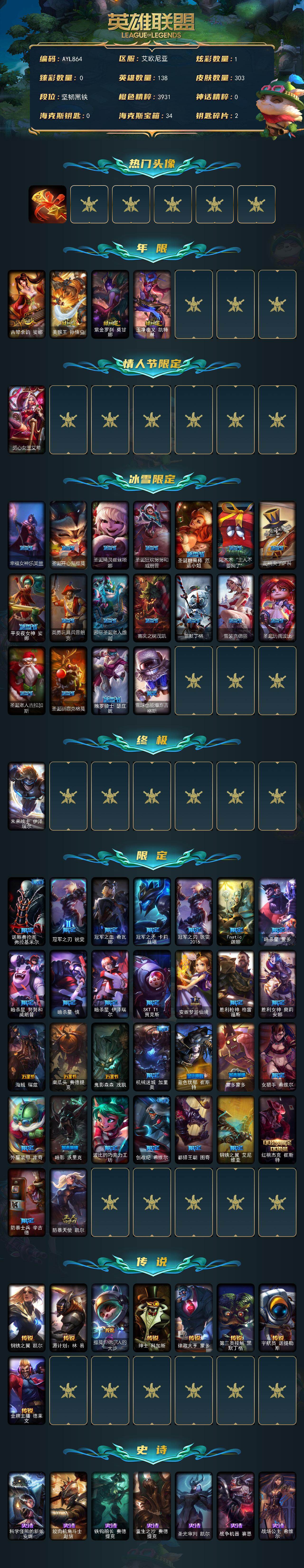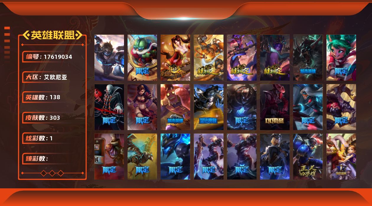 [17619034]未定级段位-138英雄-303皮肤-1炫彩-1终极-0神话-53限定-8传说-82史诗
