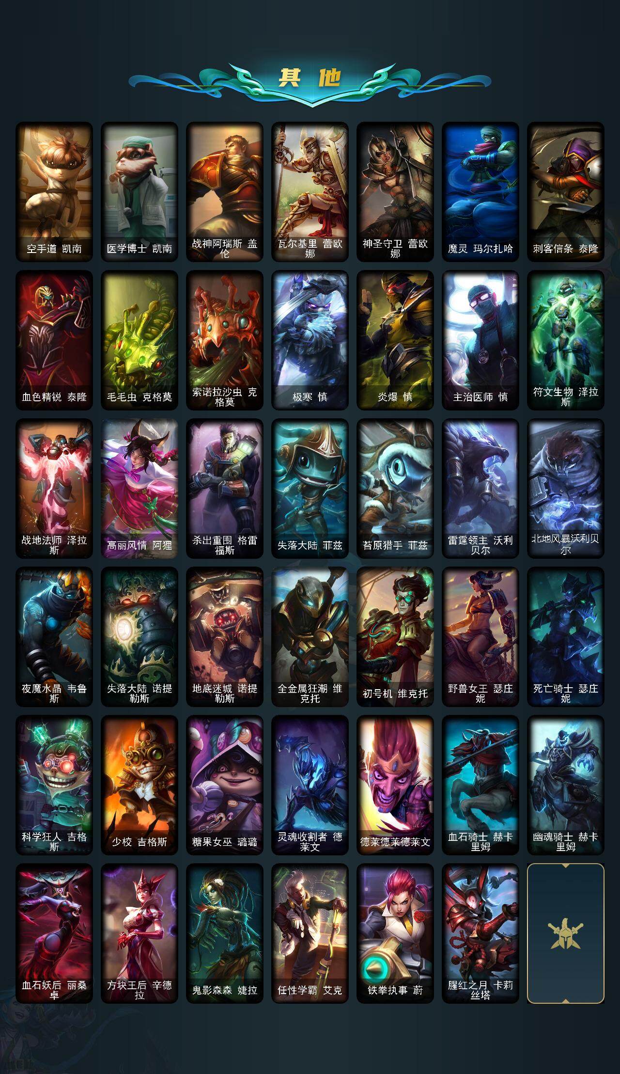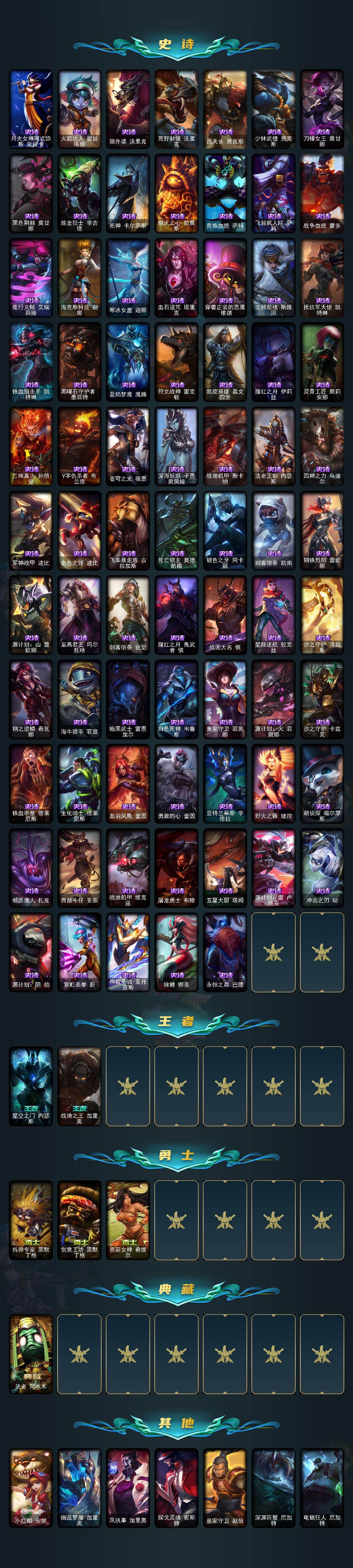 【史诗皮肤】:科学怪熊的新娘安妮,绞肉机角斗士赵信,铁钩船长费德提克,重生之沙费德提克,圣光审判凯尔,战争机器赛恩,战场公主希维尔,月光女神阿忒弥斯索拉卡,火箭达人崔丝塔娜,狼外婆沃里克,荒野豺狼沃里克,百夫长贾克斯,少林武僧贾克斯,刀锋女王莫甘娜,黑色荆棘莫甘娜,炼金狂士辛吉德,死神卡尔萨斯,熔火之心拉莫斯,贵族血统萨科,飞越疯人院萨科,战争血统蒙多,夜行义贼艾瑞莉娅,海克斯科技迦娜,寒冰女皇迦娜,血石诅咒塔里克,穿着正装的恶魔维迦,北领前线斯维因,抵抗军天使凯特琳,铁血狙击手凯特琳,黑曜石守护者墨菲特,蓝焰梦魔魔腾,符文战神雷克顿,凯旋英雄嘉文四世,腥红之月伊莉丝,灵骨工匠奥莉安娜,三昧真火孙悟空,V字仇杀者布兰德,苍穹之光薇恩,深海妖姬卡西奥佩娅,战地机甲斯卡纳,法老王朝内瑟斯,四神之力乌迪尔,军神战甲波比,血色之锤波比,飞车暴走族古拉加斯,死亡领主莫德凯撒,银色之牙阿卡丽,刺客信条凯