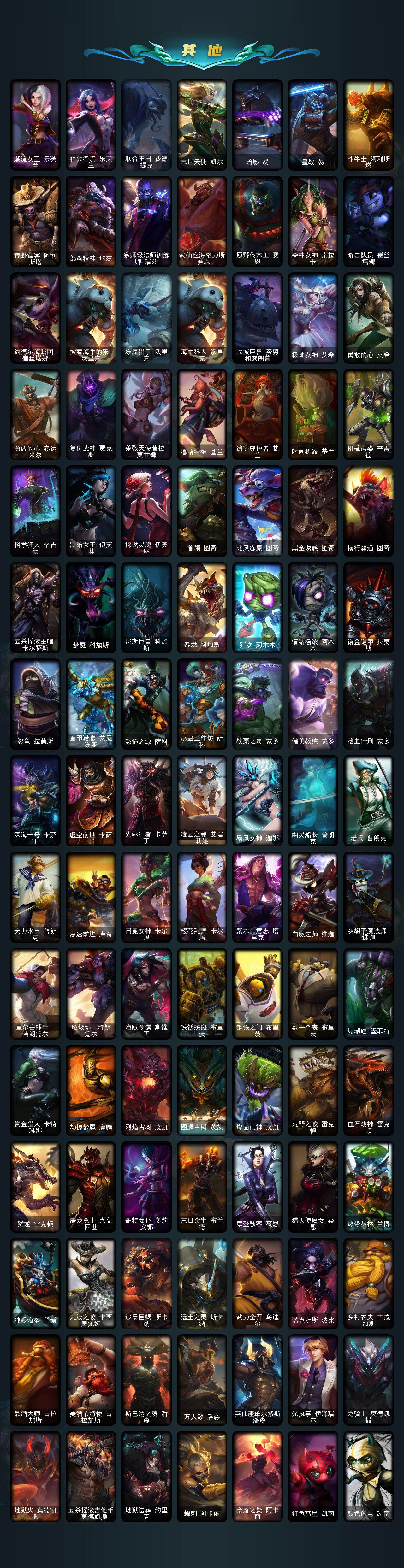 【冰雪限定】:幸福女神乐芙兰,圣诞开心鬼提莫,圣诞精灵崔丝塔娜,圣诞狂欢努努和威朗普,圣诞糖果棒厄运小姐,阿木木“主人不要我了”,胡桃夹子萨科,平安夜女神娑娜,英勇玩具兵普朗克,邪恶圣诞老人维迦,喜庆之树茂凯,雪默丁格,雪装奈德丽,圣诞玩偶波比,圣诞老人古拉加斯,圣诞驯鹿克格莫,魄罗骑士瑟庄妮,雪球也能爆炸吉格斯