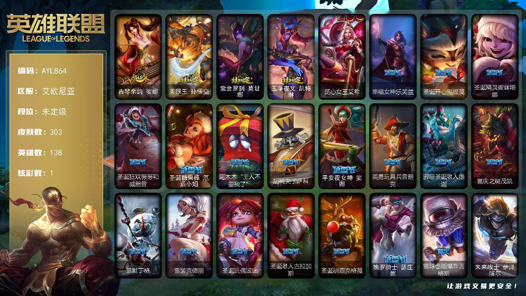 [17619034]未定级段位-138英雄-303皮肤-1炫彩-1终极-0神话-53限定-8传说-82史诗 【热门头像】:卡特琳娜的匕首头像 【年限皮肤】:古琴余韵娑娜,美猴王孙悟空,紫金罗刹莫甘娜,玉净夜叉凯特琳 【情人节限定】:觅心女王艾希 【冰雪限定】:幸福女神乐芙兰,圣诞开心鬼提莫,圣诞精灵崔丝塔娜,圣诞狂欢努努和威朗普,圣诞糖果棒厄运小姐,阿木木“主人不要我了”,胡桃夹子萨科,平安夜女神娑娜,英勇玩具兵普朗克,邪恶圣诞老人维迦,喜庆之树茂凯,雪默丁格,雪装奈德丽,圣诞玩偶波比,圣诞老人古拉加斯,圣诞驯鹿克格莫,魄罗骑士瑟庄妮,雪球也能爆炸吉格斯 【终极皮肤】:未来战士伊泽瑞尔 【限定皮肤】:诺斯费拉图弗拉基米尔,冠军之刃锐雯,冠军之血希瓦娜,冠军之矛卡莉丝塔,冠军之刃锐雯2016,Fnatic迦娜,暗杀星蒙多,暗杀星努努和威朗普,暗杀星慎,暗杀星伊泽瑞尔,SKTT1贾克斯,安妮梦游仙境,胜利枪神格雷福斯,胜利女神奥莉安娜,海贼瑞兹,南瓜头费德提克,鬼影森森茂凯,机械迷城加里奥,蓝色忧郁崔斯特,蒙多蒙多,女猎手希维尔,外星装甲库奇,暗影沃里克,波比的巧克力工坊,创战纪希维尔,都铎王朝图奇,钢铁之翼艾尼维亚,红桃杰克崔斯特,防暴士兵辛吉德,防暴天使凯尔 【传说皮肤】:钢铁之翼凯尔,源计划林易,提莫约德尔人的一大步,绅士科加斯,律政大亨蒙多,第三类接触黑默丁格,宇航员诺提勒斯,金牌主播德莱文 【史诗皮肤】:科学怪熊的新娘安妮,绞肉机角斗士赵信,铁钩船长费德提克,重生之沙费德提克,圣光审判凯尔,战争机器赛恩,战场公主希维尔,月光女神阿忒弥斯索拉卡,火箭达人崔丝塔娜,狼外婆沃里克,荒野豺狼沃里克,百夫长贾克斯,少林武僧贾克斯,刀锋女王莫甘娜,黑色荆棘莫甘娜,炼金狂士辛吉德,死神卡尔萨斯,熔火之心拉莫斯,贵族血统萨科,飞越疯人院萨科,战争血统蒙多,夜行义贼艾瑞莉娅,海克斯科技迦娜,寒冰女皇迦娜,血石诅咒塔里克,穿着正装的恶魔维迦,北领前线斯维因,抵抗军天使凯特琳,铁血狙击手凯特琳,黑曜石守护者墨菲特,蓝焰梦魔魔腾,符文战神雷克顿,凯旋英雄嘉文四世,腥红之月伊莉丝,灵骨工匠奥莉安娜,三昧真火孙悟空,V字仇杀者布兰德,苍穹之光薇恩,深海妖姬卡西奥佩娅,战地机甲斯卡纳,法老王朝内瑟斯,四神之力乌迪尔,军神战甲波比,血色之锤波比,飞车暴走族古拉加斯,死亡领主莫德凯撒,银色之牙阿卡丽,刺客信条凯