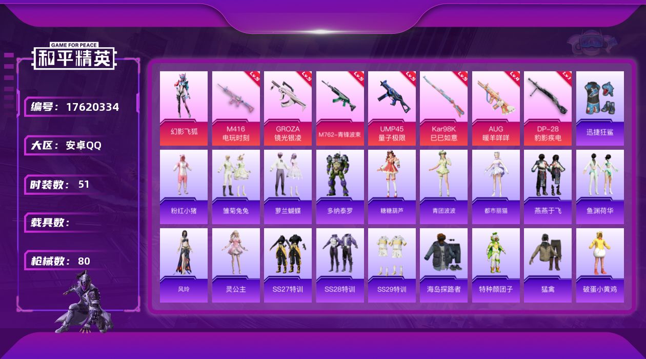 [17620334]安卓 手Q-1粉装-7特效枪-0载具-0粉色飞行器-24618热力值-5王牌印记-51套装-80枪皮