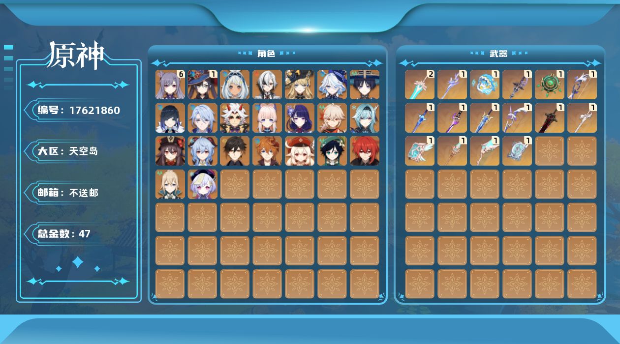 0命阿蕾奇诺,0命娜维娅,0命芙宁娜,0命流浪者,0命夜兰,0命神里绫人,0命荒泷一斗,0命优菈,0命雷电将军,0命枫原万叶,0命钟离,0命胡桃,0命甘雨,0命温迪,0命可莉,0命达达利亚,0命珊瑚宫心海,满命刻晴,0命七七,0命琴,1命莫娜,0命迪卢克,0命玛拉妮,精1赦罪,精1碧落之珑,精1若水,精1波乱月白经津,精1雾切之回光,精1松籁响起之时,精1四风原典,精1天空之脊,精1天空之翼,精1阿莫斯之弓,精1天空之卷,精1风鹰剑,精1狼的末路,精2天空之傲,精1冲浪时光,精1苍耀