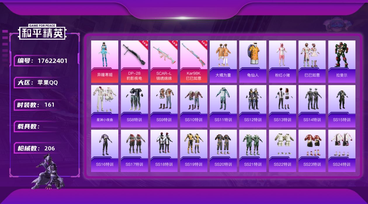 [17622401]可二次【特价出售/店主推荐】苹果 手Q-1粉装-4特效枪-0载具-1粉色飞行器-61017热力值-6王牌印记-161套装-206枪皮