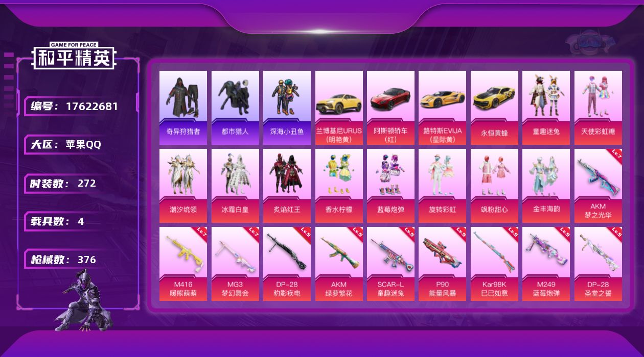 [17622681]苹果 手Q-无敌战神框-10粉装-13特效枪-4载具-3粉色飞行器-123294热力值-13王牌印记-272套装-376枪皮