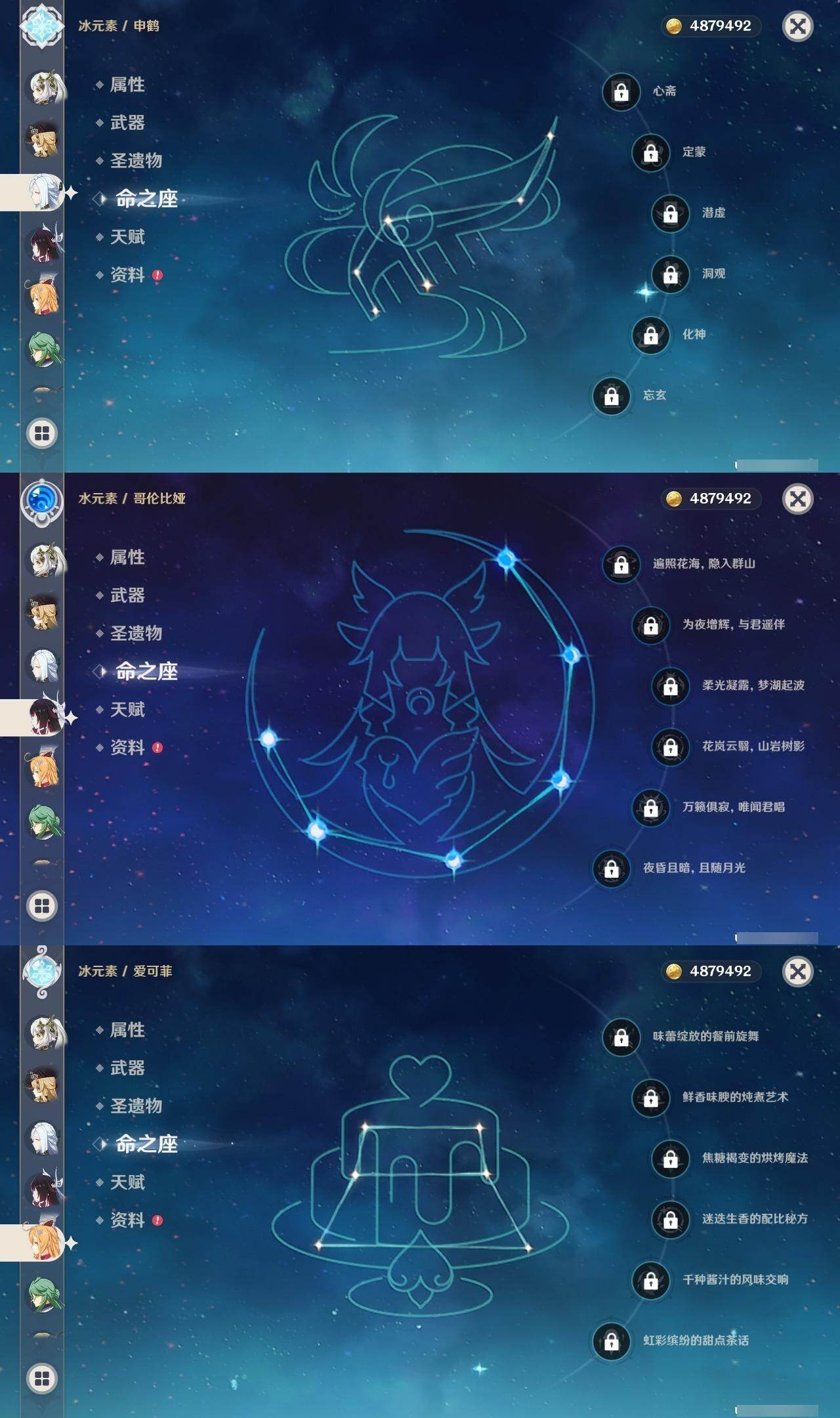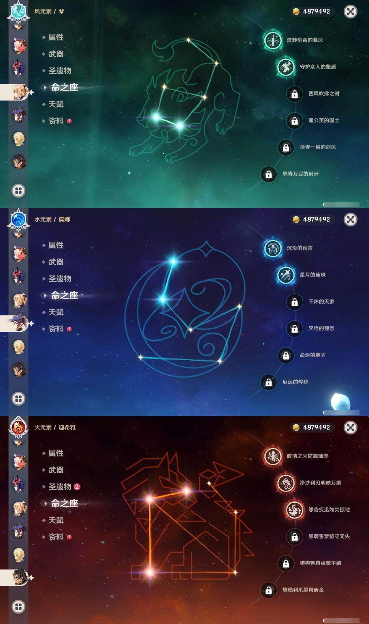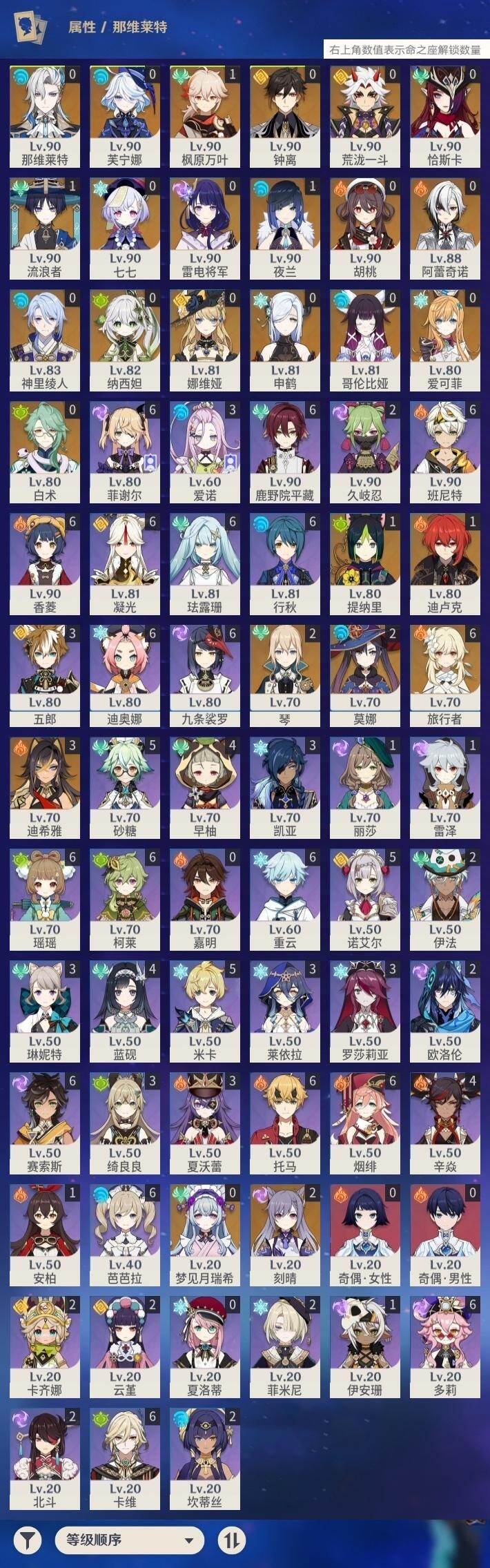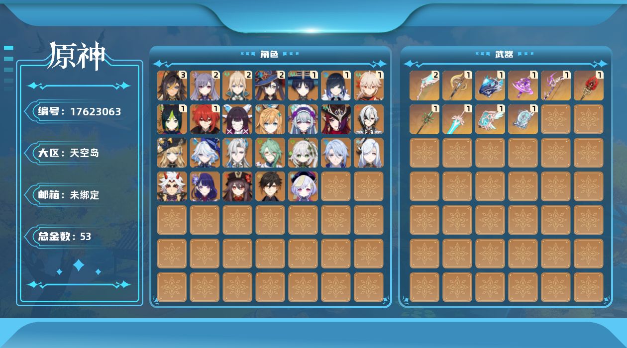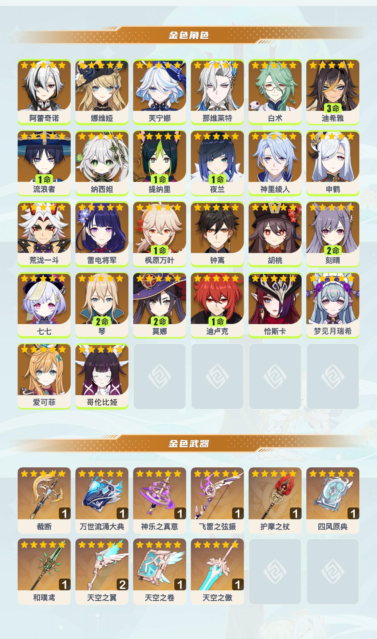 0命阿蕾奇诺,0命娜维娅,0命芙宁娜,0命那维莱特,0命白术,3命迪希雅,1命流浪者,0命纳西妲,1命提纳里,1命夜兰,0命神里绫人,0命申鹤,0命荒泷一斗,0命雷电将军,1命枫原万叶,0命钟离,0命胡桃,2命刻晴,0命七七,2命琴,2命莫娜,1命迪卢克,0命恰斯卡,0命梦见月瑞希,0命爱可菲,0命哥伦比娅,精1裁断,精1万世流涌大典,精1神乐之真意,精1飞雷之弦振,精1护摩之杖,精1四风原典,精1和璞鸢,精2天空之翼,精1天空之卷,精1天空之傲