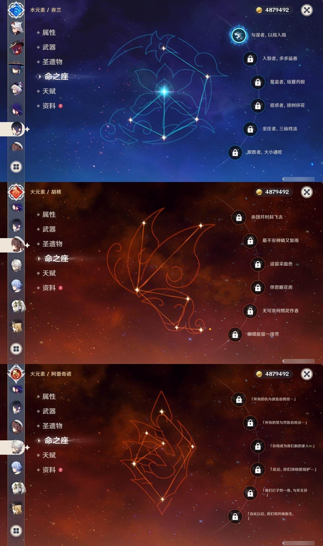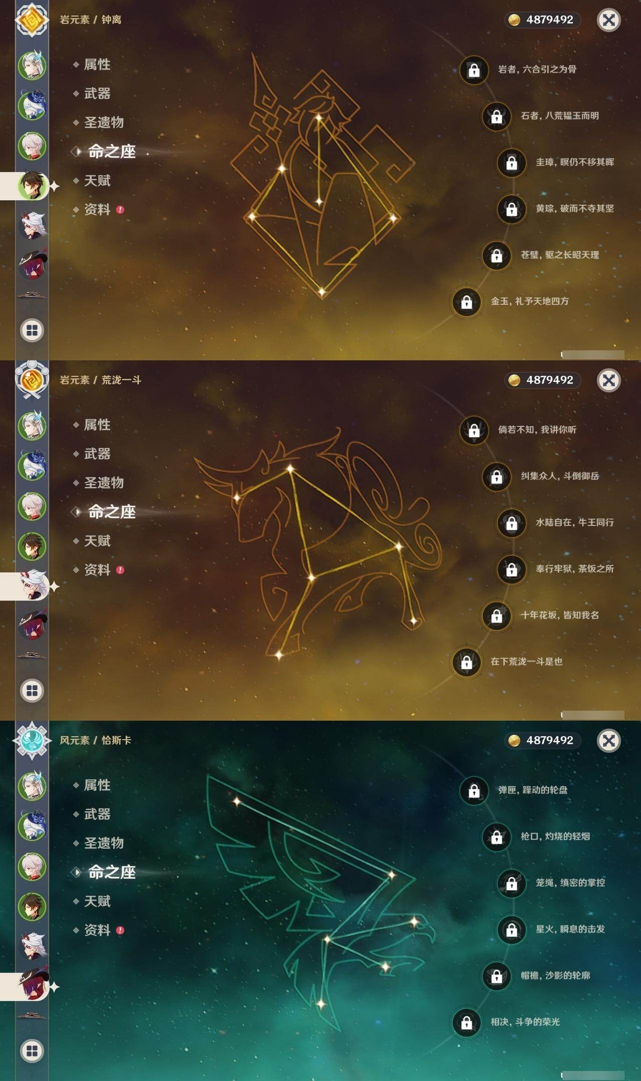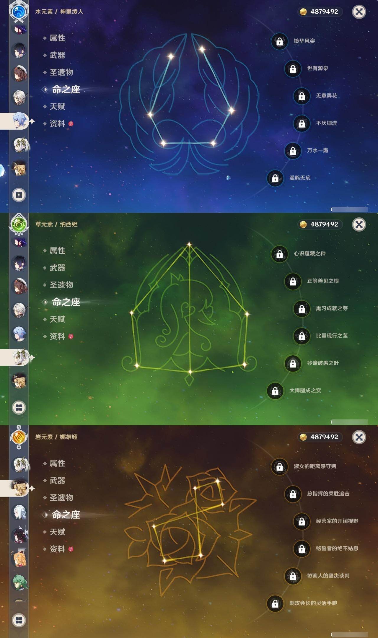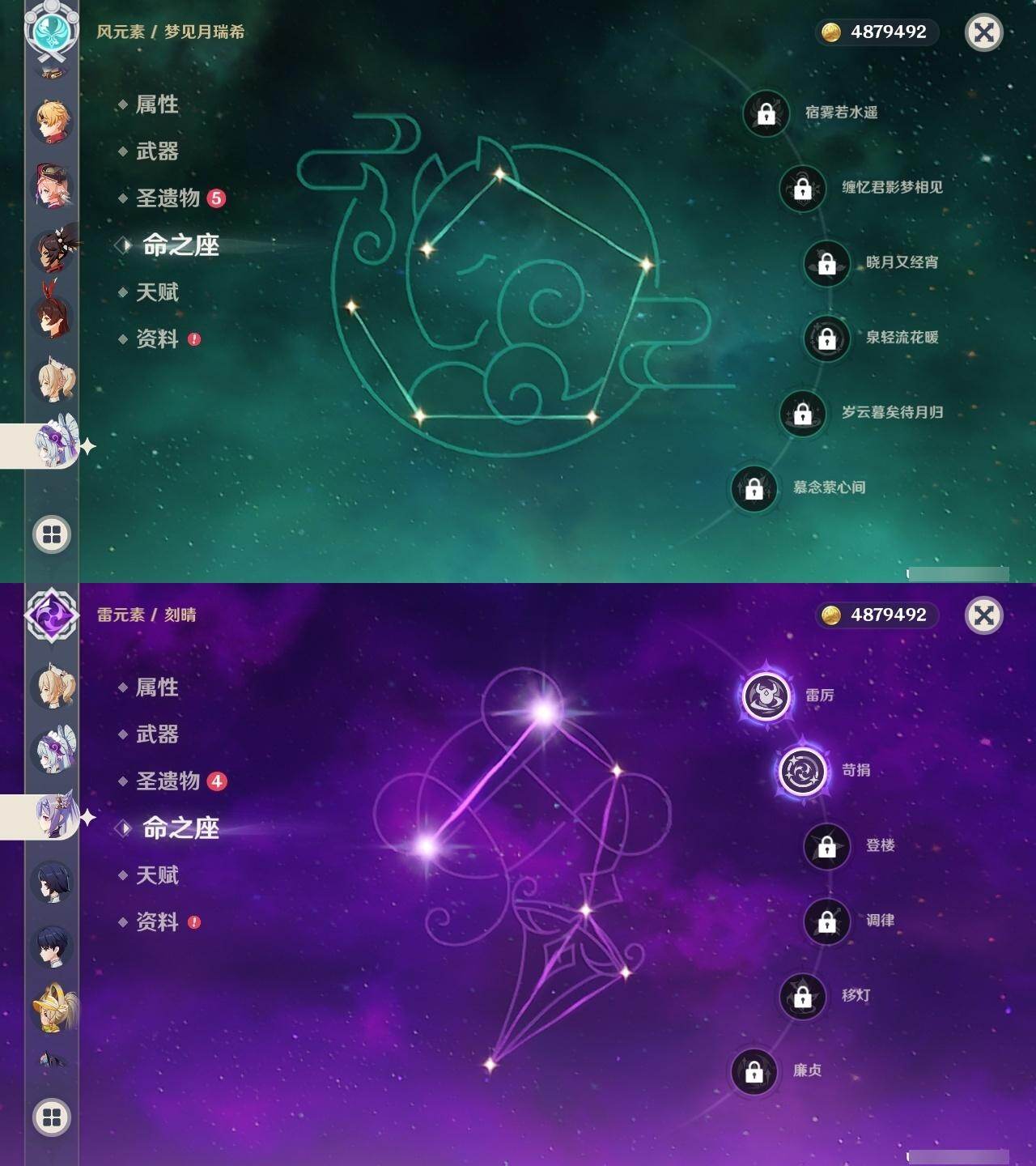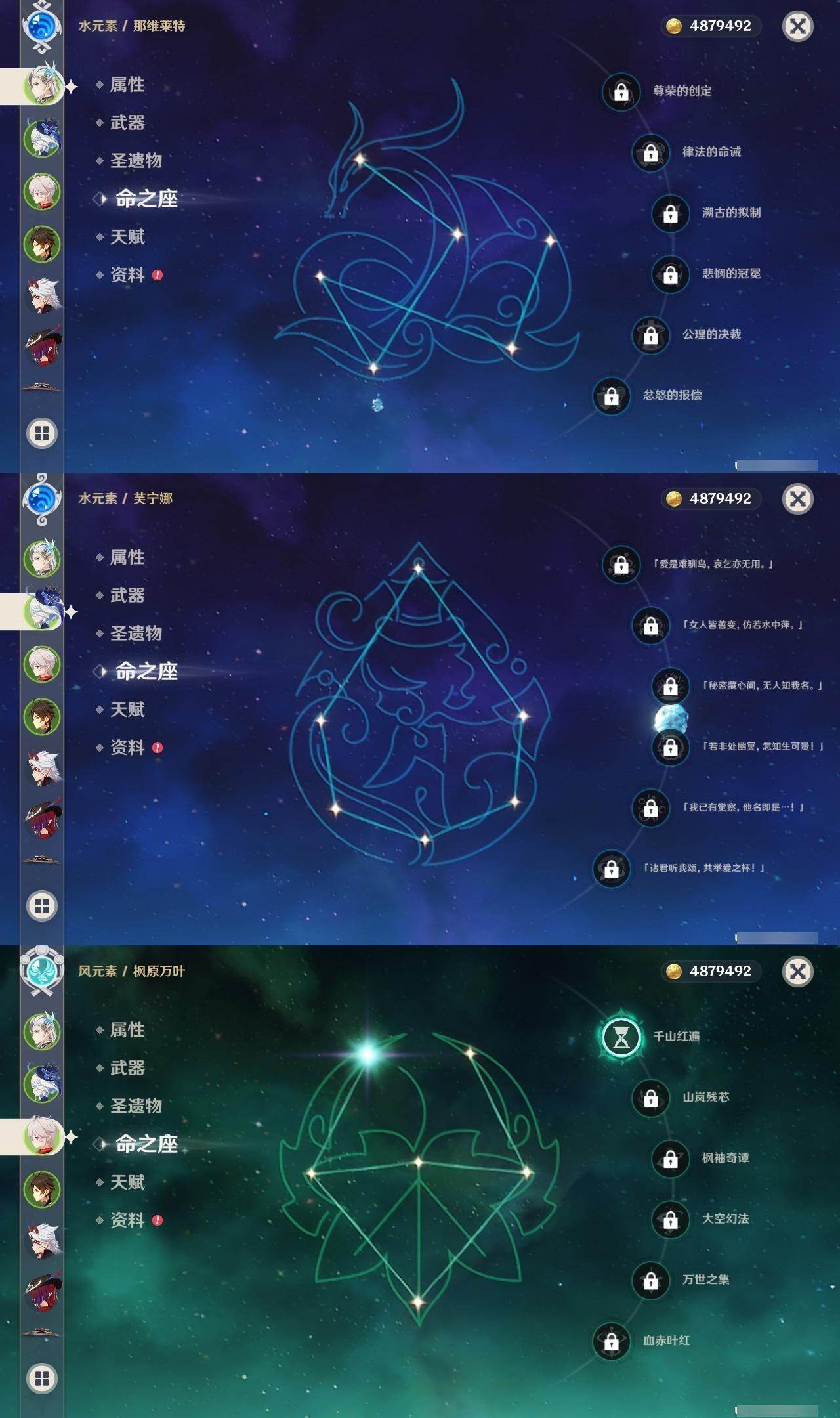 0命阿蕾奇诺,0命娜维娅,0命芙宁娜,0命那维莱特,0命白术,3命迪希雅,1命流浪者,0命纳西妲,1命提纳里,1命夜兰,0命神里绫人,0命申鹤,0命荒泷一斗,0命雷电将军,1命枫原万叶,0命钟离,0命胡桃,2命刻晴,0命七七,2命琴,2命莫娜,1命迪卢克,0命恰斯卡,0命梦见月瑞希,0命爱可菲,0命哥伦比娅,精1裁断,精1万世流涌大典,精1神乐之真意,精1飞雷之弦振,精1护摩之杖,精1四风原典,精1和璞鸢,精2天空之翼,精1天空之卷,精1天空之傲