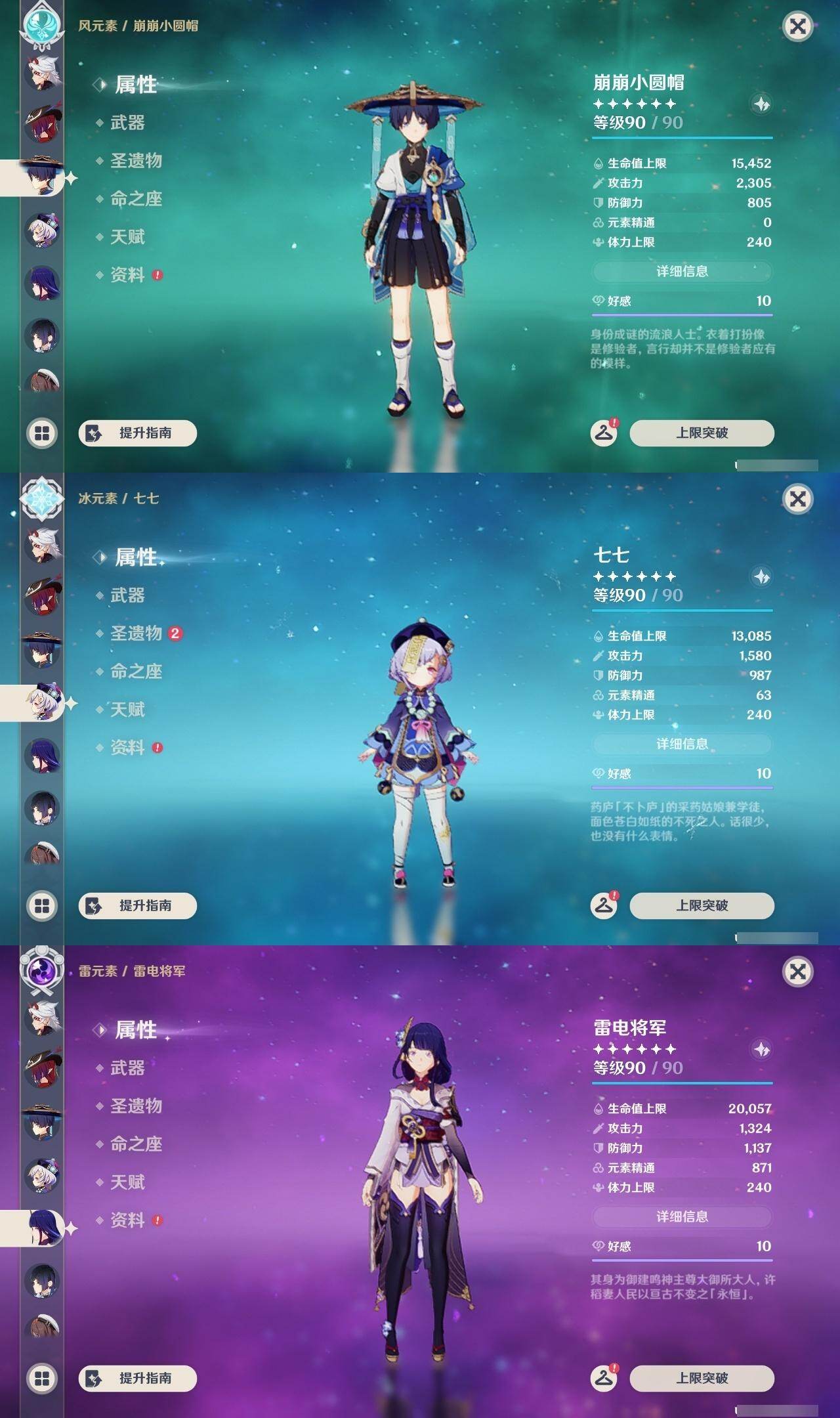 枫原万叶,钟离,荒泷一斗,七七,雷电将军,胡桃,申鹤,迪卢克,琴,莫娜,刻晴