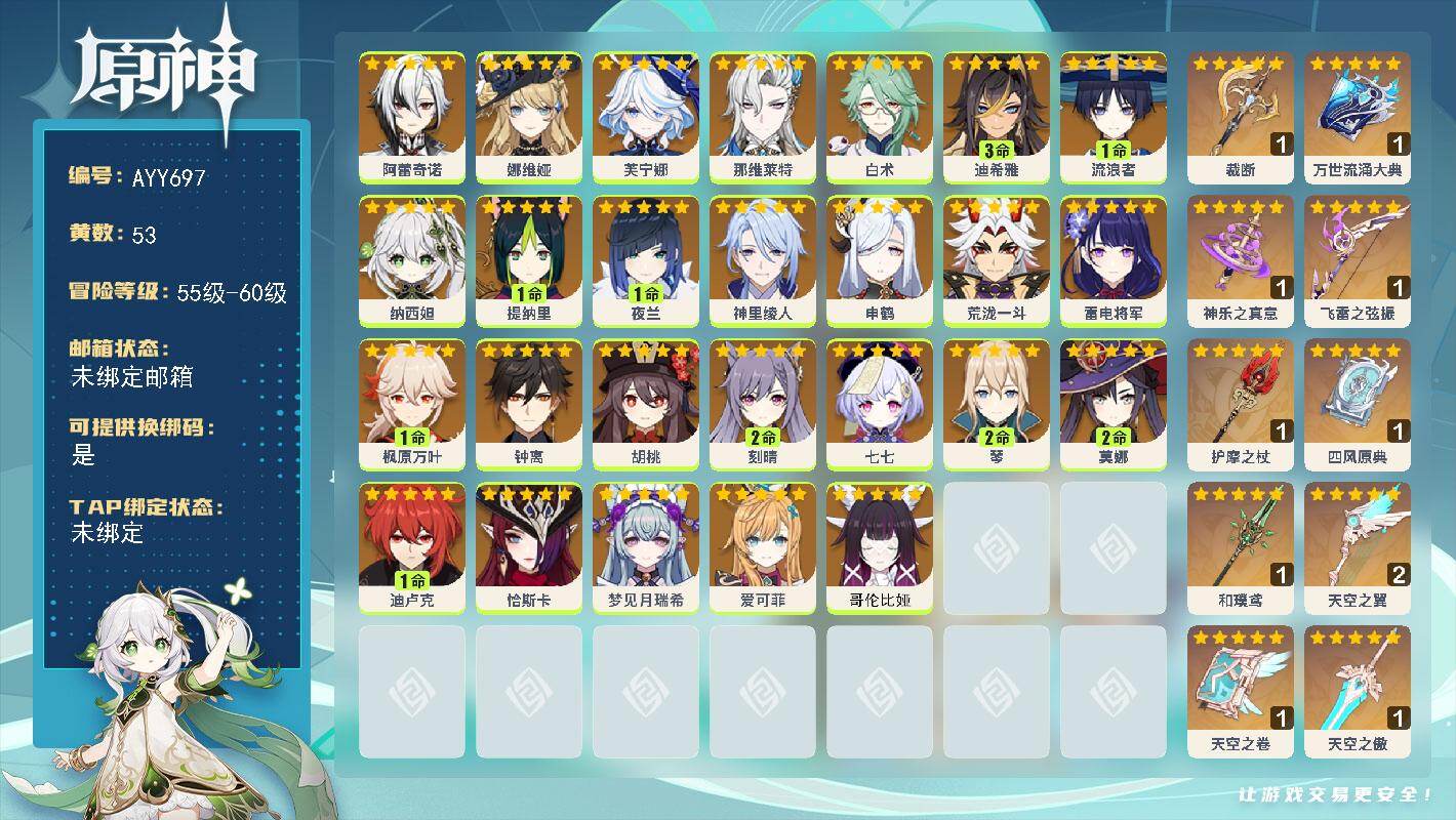 [17623063]【店主推荐捡漏号】60级/53黄/女主/26个五星角色/12个五星武器 0命阿蕾奇诺,0命娜维娅,0命芙宁娜,0命那维莱特,0命白术,3命迪希雅,1命流浪者,0命纳西妲,1命提纳里,1命夜兰,0命神里绫人,0命申鹤,0命荒泷一斗,0命雷电将军,1命枫原万叶,0命钟离,0命胡桃,2命刻晴,0命七七,2命琴,2命莫娜,1命迪卢克,0命恰斯卡,0命梦见月瑞希,0命爱可菲,0命哥伦比娅,精1裁断,精1万世流涌大典,精1神乐之真意,精1飞雷之弦振,精1护摩之杖,精1四风原典,精1和璞鸢,精2天空之翼,精1天空之卷,精1天空之傲