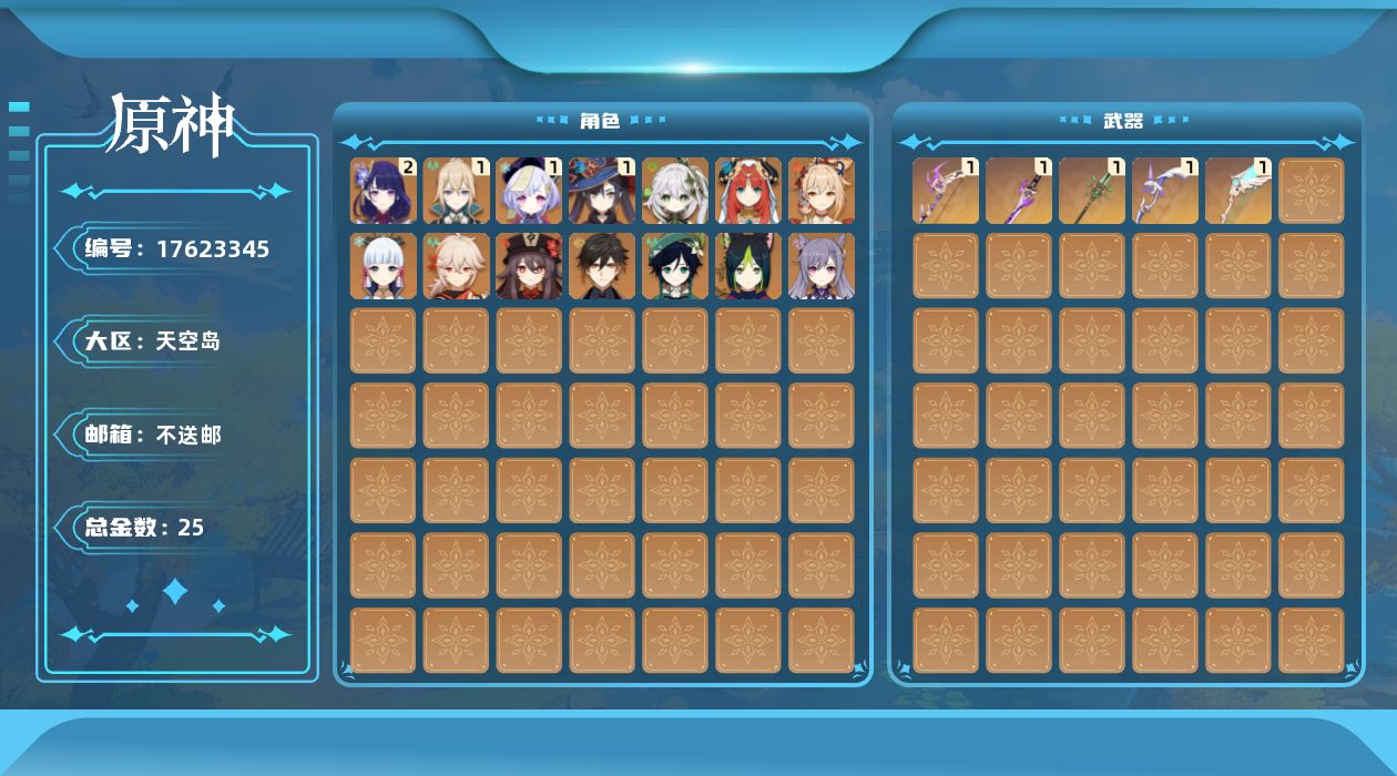 0命纳西妲,0命妮露,0命提纳里,2命雷电将军,0命枫原万叶,0命神里绫华,0命钟离,0命胡桃,0命宵宫,0命温迪,0命刻晴,1命七七,1命琴,1命莫娜,精1飞雷之弦振,精1雾切之回光,精1和璞鸢,精1天空之翼,精1阿莫斯之弓