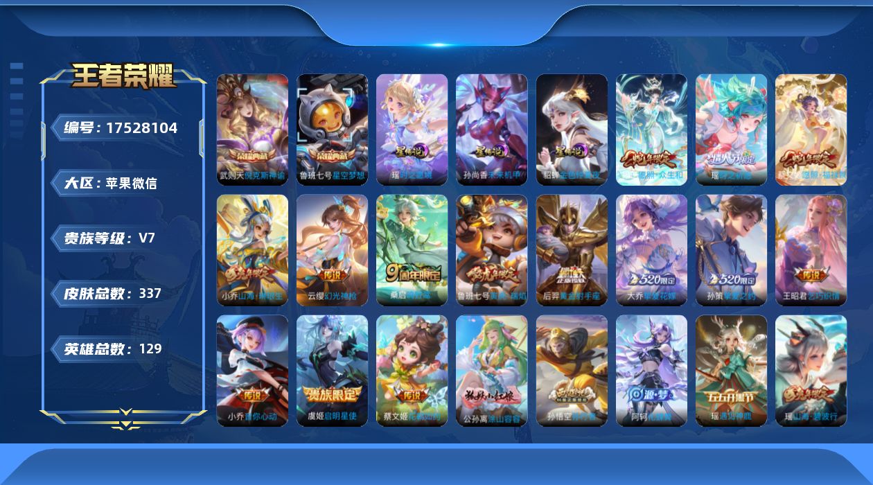 [17528104]苹果WX-V7-尊贵铂金III段位-129英雄-337皮肤-2典藏皮肤-1典藏英雄-14传说-103史诗 【英雄全皮】:鲁班大师全皮,戈娅全皮,影全皮 【荣耀典藏】:武则天英雄,武则天倪克斯神谕,鲁班七号星空梦想 【传说皮肤】:妲己愿照众生和,蔡文姬愿照福禄聚,云缨幻光神枪,桑启鸣野蒿,小乔山海琳琅生,大乔挚爱花嫁,孙策挚爱之约,蔡文姬花朝如约,瑶时之祈愿,鲁班七号寅虎瑞焰,王昭君乞巧织情,小乔音你心动,虞姬启明星使,后羿黄金射手座 【限定皮肤】:蒙犽顽岩魄,蔡文姬夏日便利店,大乔绒语心约,虞姬夏日便利店,姜子牙天穹之誓,狄仁杰阴阳师,小乔纯白花嫁,小乔山海琳琅生,赵云皇家上将,墨子神迹守卫,妲己热情桑巴,妲己时之彼端,孙尚香蔷薇恋人,鲁班七号寅虎瑞焰,庄周高山流水,钟无艳超时空战士,孙膑寅虎展翼,扁鹊奇幻香踪,白起夜都怪侠,芈月幻夜卜梦,周瑜真爱至上,元歌无心,夏侯惇匿光决锋者,甄姬女儿国国王,甄姬落雪兰心,狄仁杰魔术师,狄仁杰万华元夜,达摩星际陆战队,达摩沙漠行僧,项羽海滩派对,老夫子航海奇遇记,程咬金演武夺筹,王昭君午后时光,兰陵王金庭之子,孙悟空孙行者,后羿圣弓游侠,李元芳云中旅人,虞姬霸王别姬,虞姬启明星使,钟馗驱傩正仪,杨戬潮玩骑兵,干将莫邪真爱魔法,雅典娜黎明之约,鬼谷子五谷丰年,大乔挚爱花嫁,黄忠火炮绅士,苏烈千军破阵,百里玄策原初追逐者,梦奇顽趣,沈梦溪大漠名商,明世隐吟游魔法,裴擒虎擒涛扼浪,狂铁电玩高手,米莱狄胡桃异想国,瑶时之祈愿,瑶山海碧波行,孙策挚爱之约,猪八戒猪悟能,上官婉儿梁祝,嫦娥拒霜思,嫦娥暖冬兔眠,西施玲珑珍味,鲁班大师匿光启智者,鲁班大师探海日志,镜匿光追影者,桑启海盐诗旅,暃星界游侠,戈娅驭风魔法,艾琳女武神,艾琳流音漫舞,阿古朵江河有灵,张良古海寻踪,蒙犽百解令,蒙恬荣光圣徽,高渐离燃音魔法,妲己灵卜魔法,鬼谷子天穹祈灯,沈梦溪龙舞盛年,鲁班七号蔬乡物语,李元芳蔬乡物语,刘邦剑破天穹,镜青焰无极,项羽苍威无极,刘备异域游侠,周瑜熔金海岸 【年限皮肤】:鲁班七号寅虎瑞焰,孙膑寅虎展翼,小乔山海琳琅生,瑶山海碧波行,妲己愿照众生和,蔡文姬愿照福禄聚 【赛季限定】:狄仁杰万华元夜,程咬金演武夺筹,钟馗驱傩正仪,苏烈千军破阵,达摩沙漠行僧,兰陵王金庭之子,沈梦溪大漠名商,李元芳云中旅人,桑启海盐诗旅,裴擒虎擒涛扼浪,鲁班大师探海