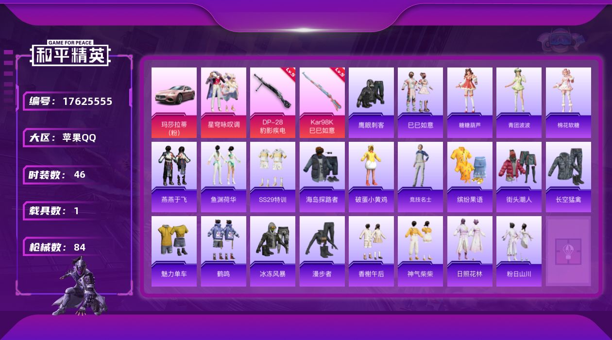 [17625555]苹果 手Q-1粉装-3特效枪-1载具-0粉色飞行器-21256热力值-6王牌印记-46套装-84枪皮