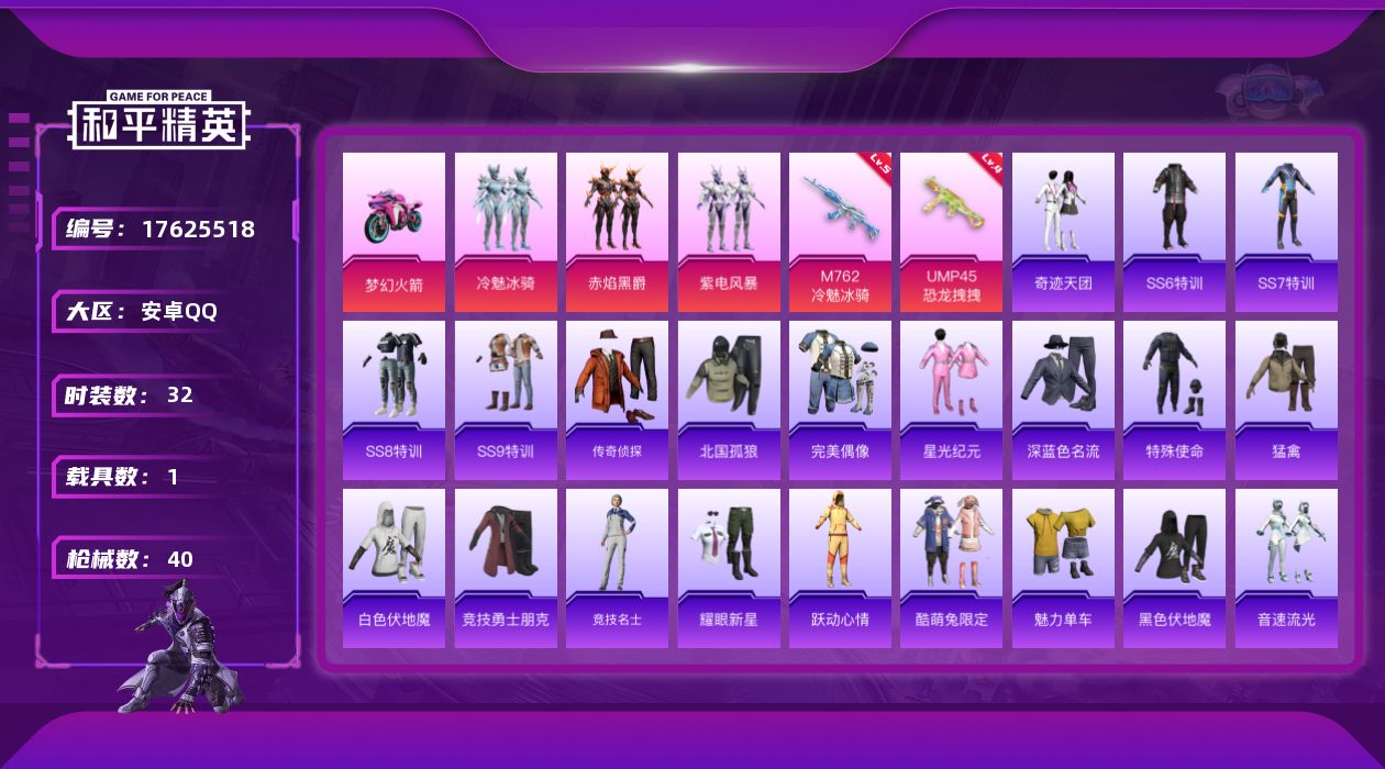 安卓 手Q-3粉装-4特效枪-1载具-1粉色飞行器-14813热力值-1王牌印记-32套装-40枪皮【粉色套装】:粉装-冷魅冰骑,粉装-赤焰黑爵,粉装-紫电风暴【粉色枪皮等级】:M762-冷魅冰骑(五级),UMP45-恐龙拽拽(四级),Mk14-福马献瑞(四级),AA12-G-萌骑幻想(二级)【粉色载具】:双人摩托-梦幻火箭【粉色枪皮】:M762-冷魅冰骑,UMP45-恐龙拽拽,Mk14-福马献瑞,AA12-G-萌骑幻想