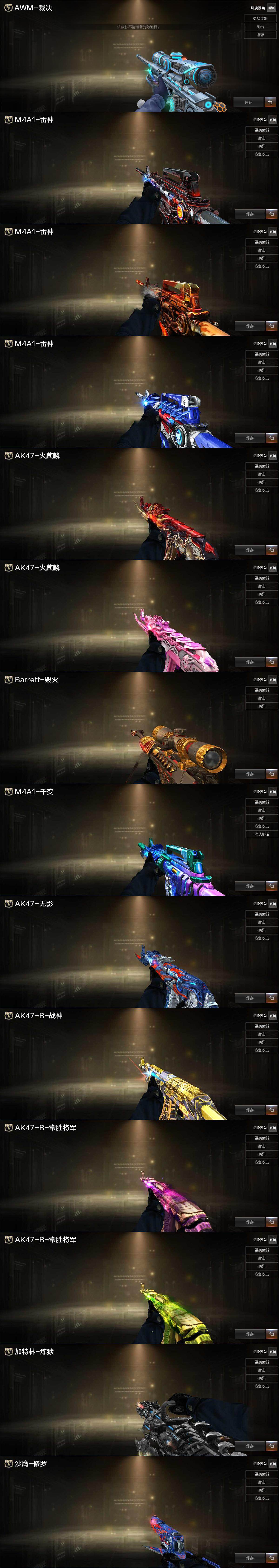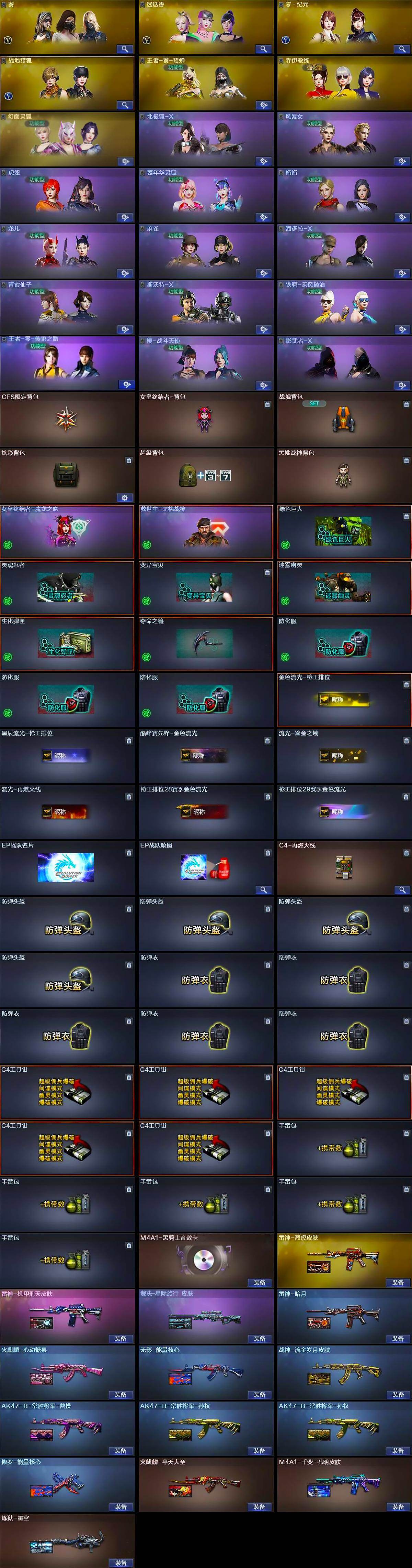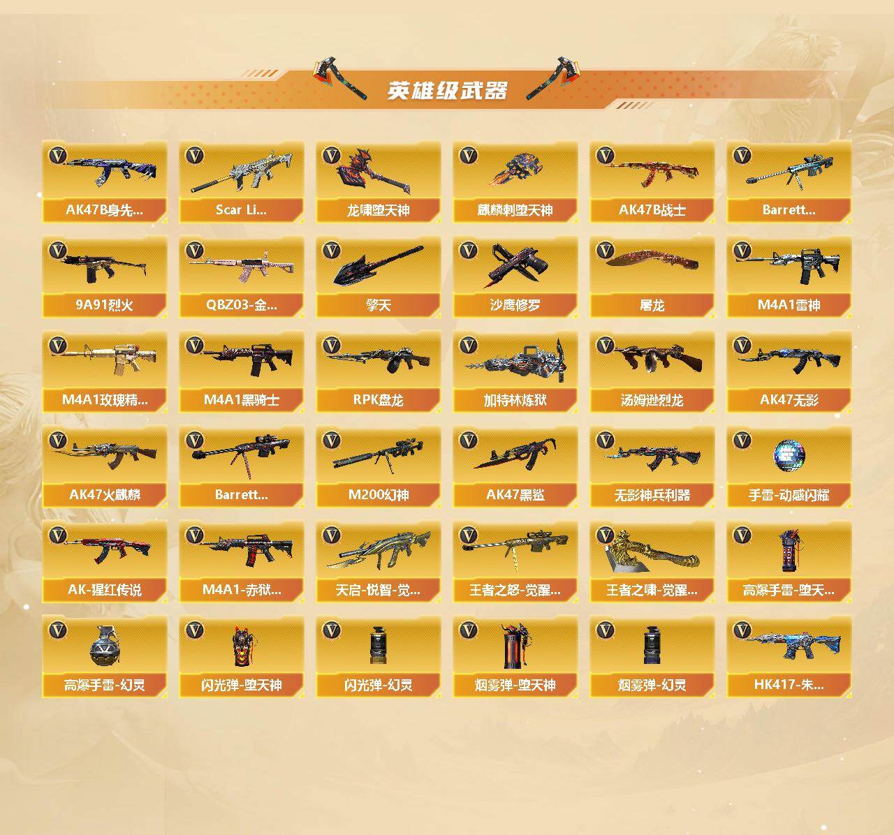 【英雄级武器】:AK47-火麒麟*2,M4A1-雷神,M4A1-黑骑士,AK47-无影*2,AK47-黑鲨,Scar Light-白虎,无影-神兵利器,M4A1-玫瑰精灵,QBZ03-金色蔷薇*2,9A91-烈火,天启-悦智-觉醒版,AK-47-猩红传说,AK47-B-常胜将军,HK417-朱雀-电竞之星,AK47-B-身先士卒,AK47-B-战士,Barrett-毁灭,M200-幻神,王者之怒-觉醒版,Barrett-暗月传说*2,RPK-盘龙*6,加特林-炼狱,汤姆逊-烈龙*7,沙鹰-修罗,天神-动感闪耀,屠龙,麒麟刺-堕天神,擎天*4,幻灵之锋,龙啸-堕天神,王者之啸-觉醒版,屠龙-电竞之星,高爆手雷-堕天神*4,高爆手雷-幻灵,手雷-动感闪耀,闪光弹-堕天神*4,闪光弹-幻灵,烟雾弹-堕天神*4,烟雾弹-幻灵,M4A1-赤狱骑士,AK47-竞魂无影,AN94-竞魂超新星