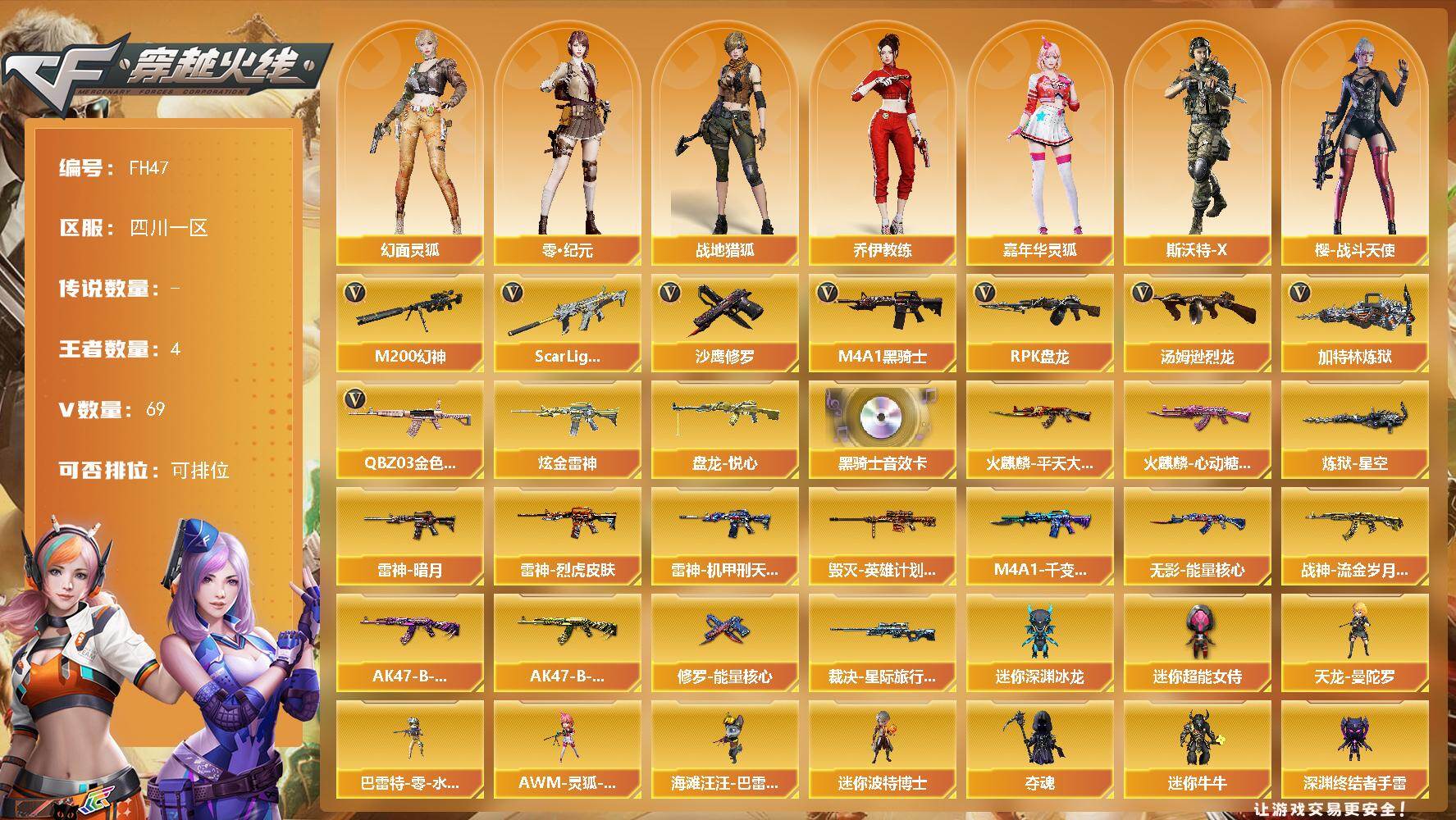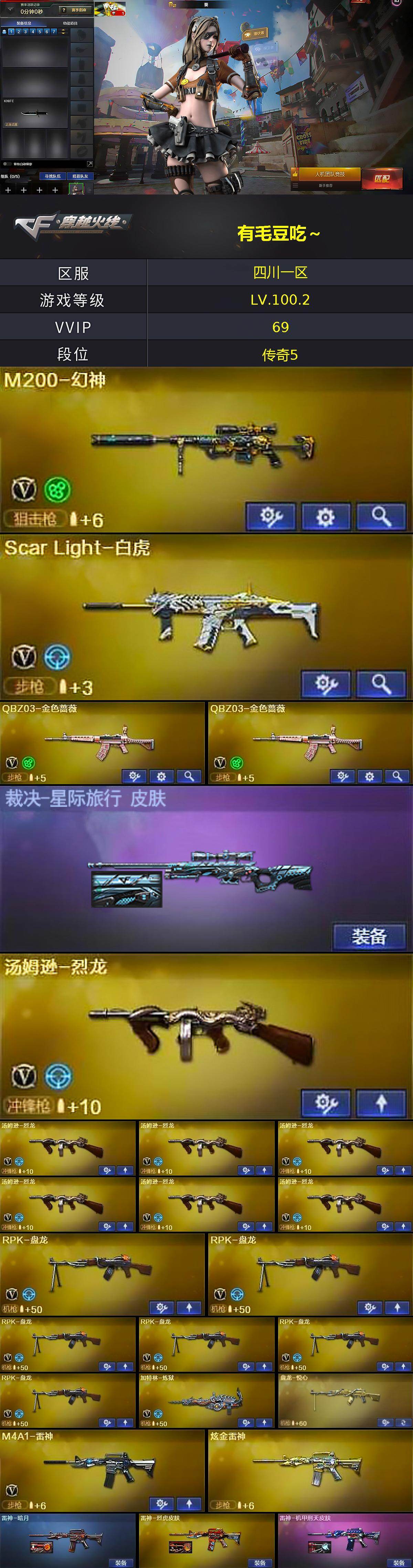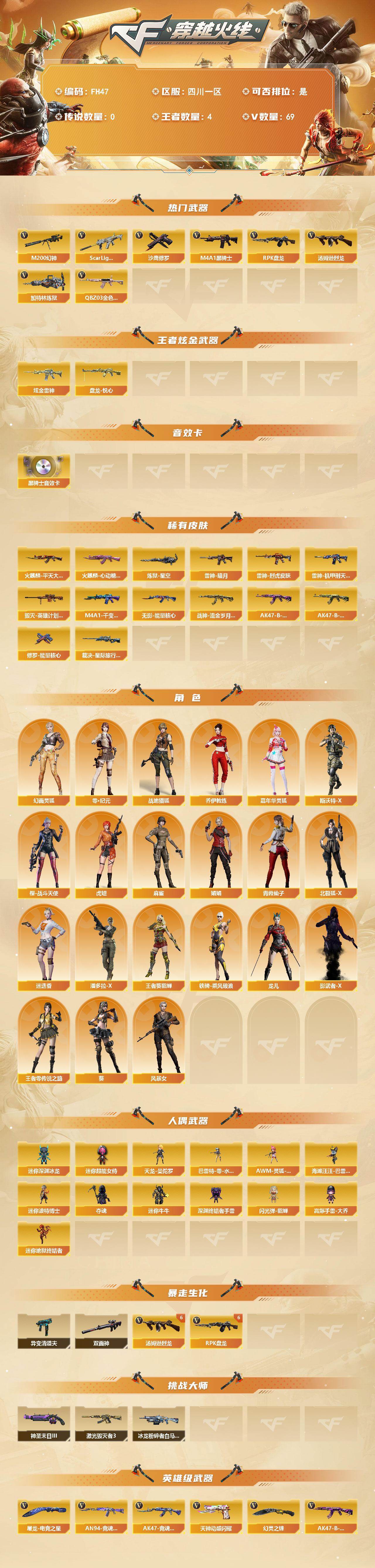 [17608225]四川一区-72V-4王者武器数-1炫金武器数 【热门武器】:QBZ03-金色蔷薇*2,Scar Light-白虎,M200-幻神,M4A1-黑骑士,汤姆逊-烈龙*7,RPK-盘龙*6,加特林-炼狱,沙鹰-修罗 【王者炫金武器】:盘龙-悦心,炫金雷神 【音效卡】:M4A1-黑骑士音效卡 【皮肤】:裁决-星际旅行 皮肤,雷神-暗月,雷神-烈虎皮肤,雷神-机甲刑天皮肤,火麒麟-平天大圣,火麒麟-心动糖果,毁灭-英雄计划 皮肤,M4A1-千变-孔明皮肤,无影-能量核心,战神-流金岁月皮肤,AK47-B-常胜将军-曹操,AK47-B-常胜将军-孙权*2,炼狱-星空,修罗-能量核心 【角色】:葵,迷迭香,零·纪元,战地猎狐,王者-葵-貂蝉,乔伊教练,幻面灵狐,北极狐-X,风暴女,虎妞,嘉年华灵狐,娟娟,龙儿,麻雀,潘多拉-X,青霞仙子,斯沃特-X,铁骑-乘风破浪,王者-零-传说之路,樱-战斗天使,影武者-X 【人偶武器】:天龙-曼陀罗,巴雷特-零-水下丽影,迷你地狱终结者,AWM-灵狐-15周年嘉年华,海滩汪汪-巴雷特,迷你深渊冰龙,迷你波特博士*2,夺魂,迷你牛牛,深渊终结者手雷,闪光弹-貂蝉,高爆手雷-大乔,迷你超能女侍 【暴走生化】:异变清道夫,双面神 【挑战大师】:冰龙粉碎者-白马银枪,激光毁灭者III,神圣爆裂者-末日III 【英雄级武器】:AK47-火麒麟*2,M4A1-雷神,M4A1-黑骑士,AK47-无影*2,AK47-黑鲨,Scar Light-白虎,无影-神兵利器,M4A1-玫瑰精灵,QBZ03-金色蔷薇*2,9A91-烈火,天启-悦智-觉醒版,AK-47-猩红传说,AK47-B-常胜将军,HK417-朱雀-电竞之星,AK47-B-身先士卒,AK47-B-战士,Barrett-毁灭,M200-幻神,王者之怒-觉醒版,Barrett-暗月传说*2,RPK-盘龙*6,加特林-炼狱,汤姆逊-烈龙*7,沙鹰-修罗,天神-动感闪耀,屠龙,麒麟刺-堕天神,擎天*4,幻灵之锋,龙啸-堕天神,王者之啸-觉醒版,屠龙-电竞之星,高爆手雷-堕天神*4,高爆手雷-幻灵,手雷-动感闪耀,闪光弹-堕天神*4,闪光弹-幻灵,烟雾弹-堕天神*4,烟雾弹-幻灵,M4A1-赤狱骑士,AK47-竞魂无影,AN94-竞魂超新星 【源级武器】:源-千变,魂·火麒麟-百城,源-黑龙,御·黑龙-龙太