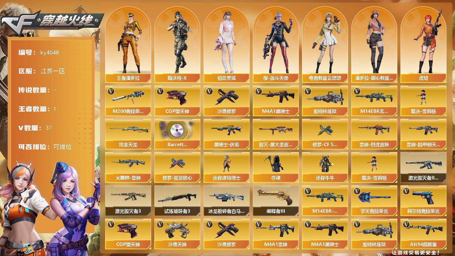 [17545381]【ky4548】江苏一区-37V-1王者-1炫金 【热门武器】:M14EBR-玄武,M200-竞技荣光,M4A1-黑骑士,加特林-炼狱,裁决-雪莉杨,COP-堕天神,沙鹰-修罗 【王者炫金武器】:炫金天龙 【音效卡】:Barrett-碧霄极光音效卡 【皮肤】:雷神-烈虎皮肤,雷神-机甲刑天皮肤,火麒麟-雷神,毁灭-黑大圣皮肤,黑骑士-伏羲,修罗-CF STAR,修罗-能量核心 【角色】:电竞教官-云悠悠,王者潘多拉,初恋灵狐,风暴女,虎妞,灵狐者-黄金海岸,潘多拉-X,潘多拉-甜心教官,青霞仙子,斯沃特-X,铁骑荣耀,樱-战斗天使 【人偶武器】:裁决-雪莉杨,迷你波特博士*2,夺魂,迷你牛牛 【挑战大师】:冰龙粉碎者-白马银枪,激光毁灭者III-白马银枪,激光毁灭者III*2,试炼破坏者III,阐释者III 【英雄级武器】:M4A1-雷神,M4A1-黑骑士,AN94-超新星,M14EBR-玄武,黑武士-锦绣游龙,M200-竞技荣光,王者蔷薇-觉醒版,加特林-炼狱,沙鹰-修罗,沙鹰-天神,COP-堕天神,柯尔特-竞技荣光*2,修罗-云海游龙,擎天-竞技荣光,高爆手雷-竞技荣光*7,闪光弹-竞技荣光*7,烟雾弹-竞技荣光*7,M4A1-赤狱骑士 【道具】:云山科技背包,云海游龙炫彩背包,背包-洛丽塔,超级背包,女皇终结者-魔龙之吻,救世主-黑桃战神,绿色巨人,灵魂忍者,迷雾幽灵,夺命之镰,防化服*3,金色流光-枪王排位,星辰流光-枪王排位,枪王排位28赛季金色流光,EP战队名片,防弹头盔*4,防弹衣*4,C4工具钳*3,手雷包*3 【特殊枪械】:1黑骑士,1炼狱