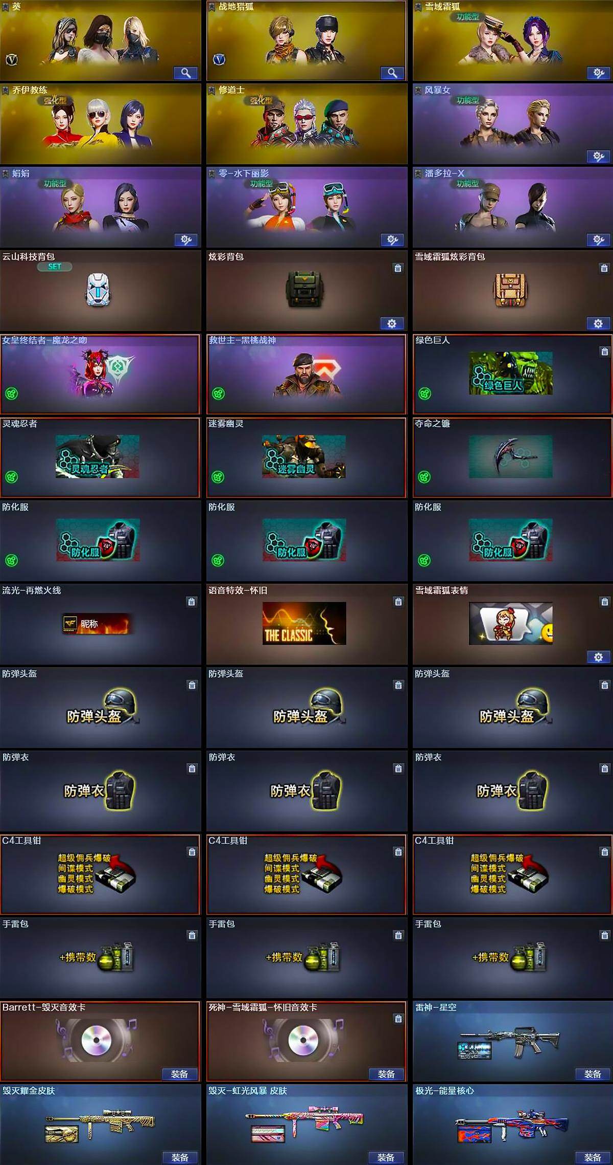 【道具】:云山科技背包,炫彩背包,雪域霜狐炫彩背包,女皇终结者-魔龙之吻,救世主-黑桃战神,绿色巨人,灵魂忍者,迷雾幽灵,夺命之镰,防化服*3,流光-再燃火线,语音特效-怀旧,雪域霜狐表情,防弹头盔*3,防弹衣*3,C4工具钳*3,手雷包*3