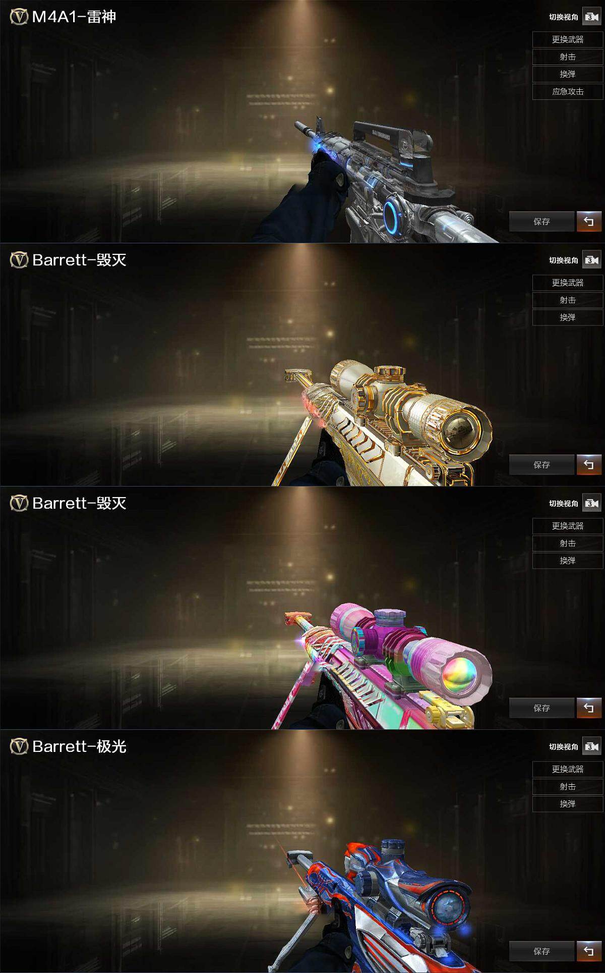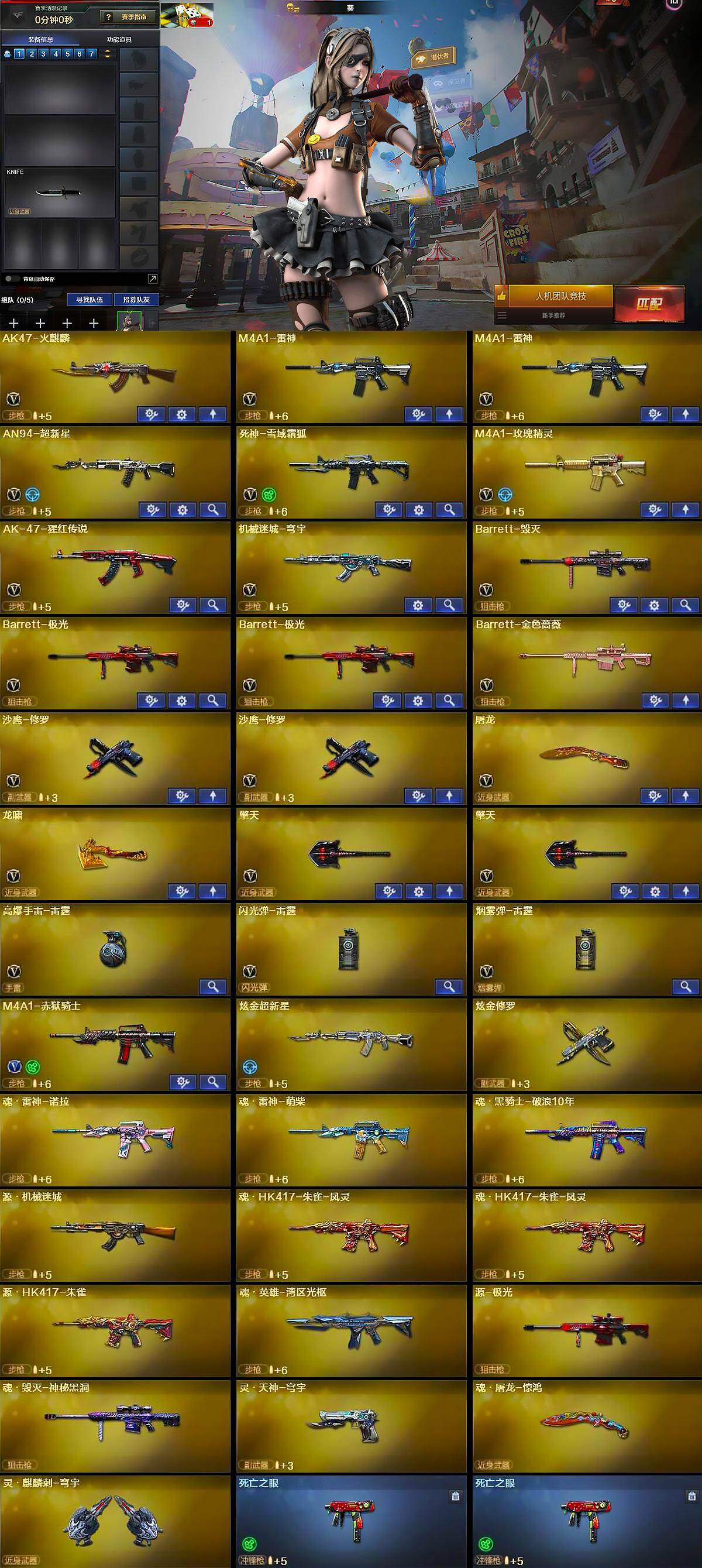 【英雄级武器】:AK47-火麒麟,M4A1-雷神*2,AN94-超新星,死神-雪域霜狐,M4A1-玫瑰精灵,AK-47-猩红传说,机械迷城-穹宇,Barrett-毁灭,Barrett-极光*2,Barrett-金色蔷薇,沙鹰-修罗*2,屠龙,龙啸,擎天*2,高爆手雷-雷霆,闪光弹-雷霆,烟雾弹-雷霆,M4A1-赤狱骑士