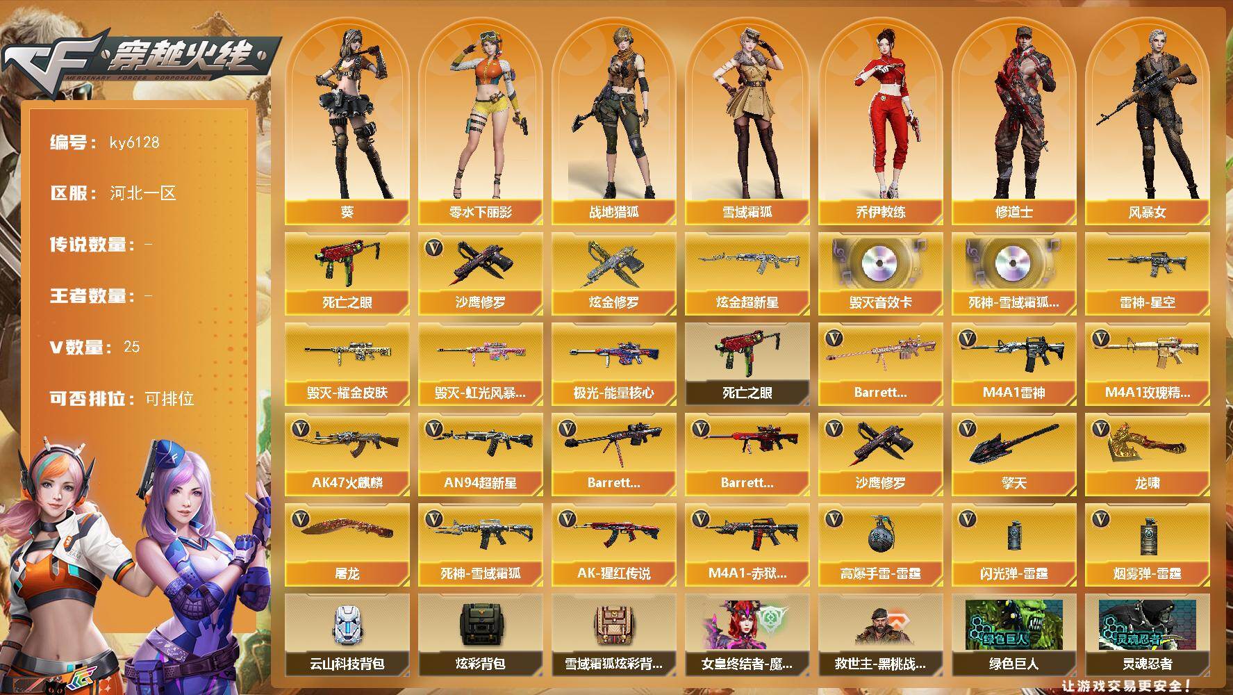 [17327647]【ky6128】河北一区-28V-0王者武器数-2炫金武器数 【热门武器】:死亡之眼*2,沙鹰-修罗*2 【王者炫金武器】:炫金超新星,炫金修罗 【音效卡】:Barrett-毁灭音效卡,死神-雪域霜狐-怀旧音效卡 【皮肤】:雷神-星空,毁灭耀金皮肤,毁灭-虹光风暴 皮肤,极光-能量核心 【角色】:葵,战地猎狐,雪域霜狐,乔伊教练,修道士,风暴女,娟娟,零-水下丽影,潘多拉-X 【暴走生化】:死亡之眼*2 【英雄级武器】:AK47-火麒麟,M4A1-雷神*2,AN94-超新星,死神-雪域霜狐,M4A1-玫瑰精灵,AK-47-猩红传说,机械迷城-穹宇,Barrett-毁灭,Barrett-极光*2,Barrett-金色蔷薇,沙鹰-修罗*2,屠龙,龙啸,擎天*2,高爆手雷-雷霆,闪光弹-雷霆,烟雾弹-雷霆,M4A1-赤狱骑士 【道具】:云山科技背包,炫彩背包,雪域霜狐炫彩背包,女皇终结者-魔龙之吻,救世主-黑桃战神,绿色巨人,灵魂忍者,迷雾幽灵,夺命之镰,防化服*3,流光-再燃火线,语音特效-怀旧,雪域霜狐表情,防弹头盔*3,防弹衣*3,C4工具钳*3,手雷包*3 【特殊枪械】:
