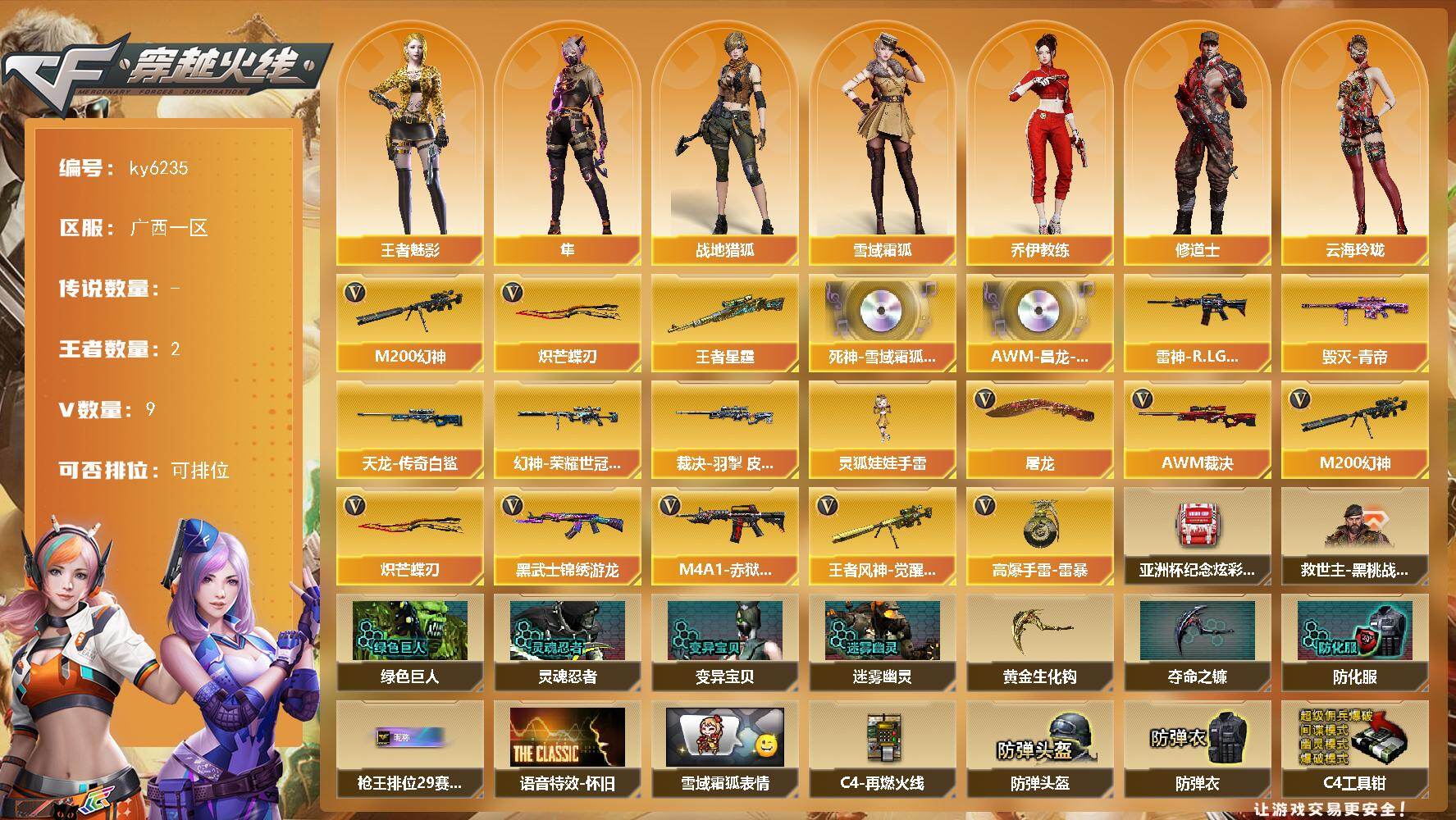 [17404169]【ky6235】广西一区-9V-2王者武器数-0炫金武器数 【热门武器】:M200-幻神,炽芒蝶刃 【王者炫金武器】:王者星霆 【音效卡】:死神-雪域霜狐-怀旧音效卡,AWM-昌龙-怀旧音效卡 【皮肤】:幻神-荣耀世冠白鲨2023 皮肤,裁决-羽掣 皮肤,雷神-R.LGD-CFPLS18冠军,毁灭-青帝,AWM-天龙-传奇白鲨 【角色】:隼,战地猎狐,王者-魅影,雪域霜狐,奇洋探员,乔伊教练,修道士,云海玲珑,芳心审判者,麻雀,潘多拉-甜心教官,兔囡囡,维纳斯,游珑儿,智影 【人偶武器】:灵狐娃娃手雷 【英雄级武器】:黑武士-锦绣游龙,AWM-裁决,M200-幻神,王者风神-觉醒版,屠龙,炽芒蝶刃,高爆手雷-雷暴,M4A1-赤狱骑士 【道具】:亚洲杯纪念炫彩背包,救世主-黑桃战神,黄金生化钩,绿色巨人,灵魂忍者,变异宝贝,迷雾幽灵,夺命之镰,防化服*2,枪王排位28赛季金色流光,枪王排位29赛季金色流光,语音特效-怀旧,雪域霜狐表情,C4-再燃火线,防弹头盔*2,防弹衣*2,C4工具钳*2,手雷包*2 【特殊枪械】: