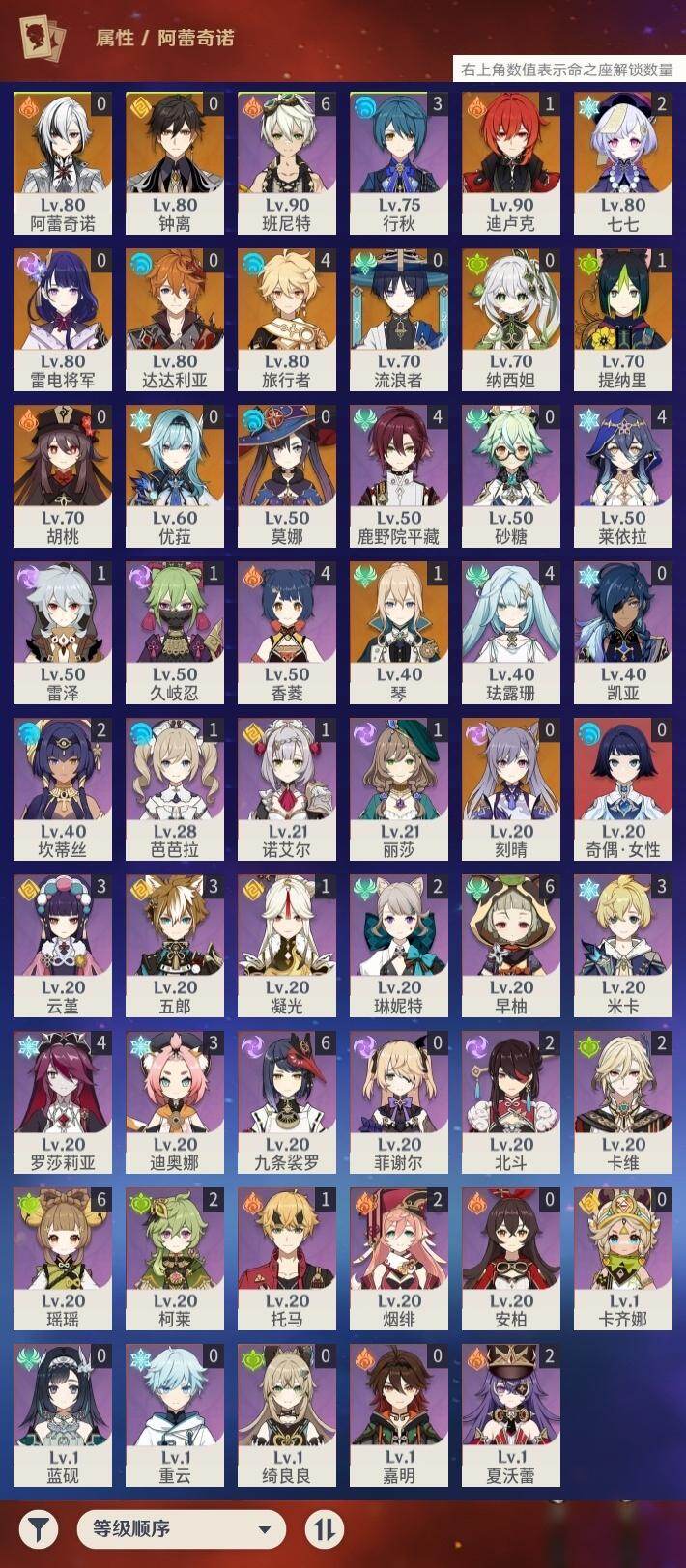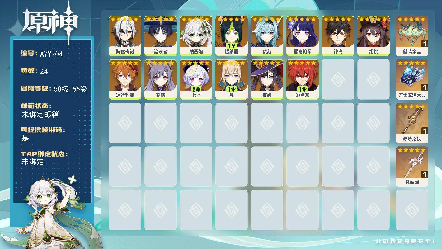 [17631345]55级/24黄/男主/14个五星角色/5个五星武器 0命阿蕾奇诺,0命流浪者,0命纳西妲,1命提纳里,0命优菈,0命雷电将军,0命钟离,0命胡桃,0命达达利亚,0命刻晴,2命七七,1命琴,0命莫娜,1命迪卢克,精1鹤鸣余音,精1万世流涌大典,精1赤沙之杖,精1风鹰剑