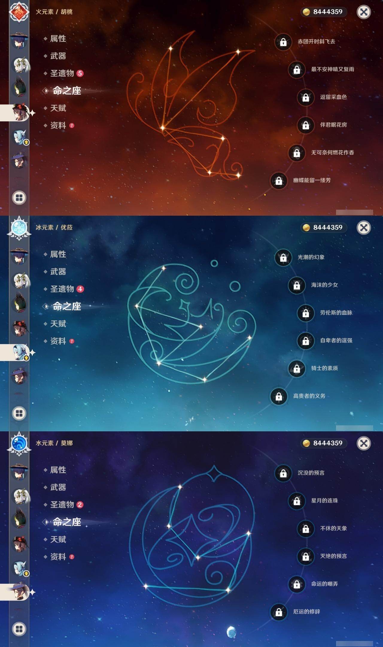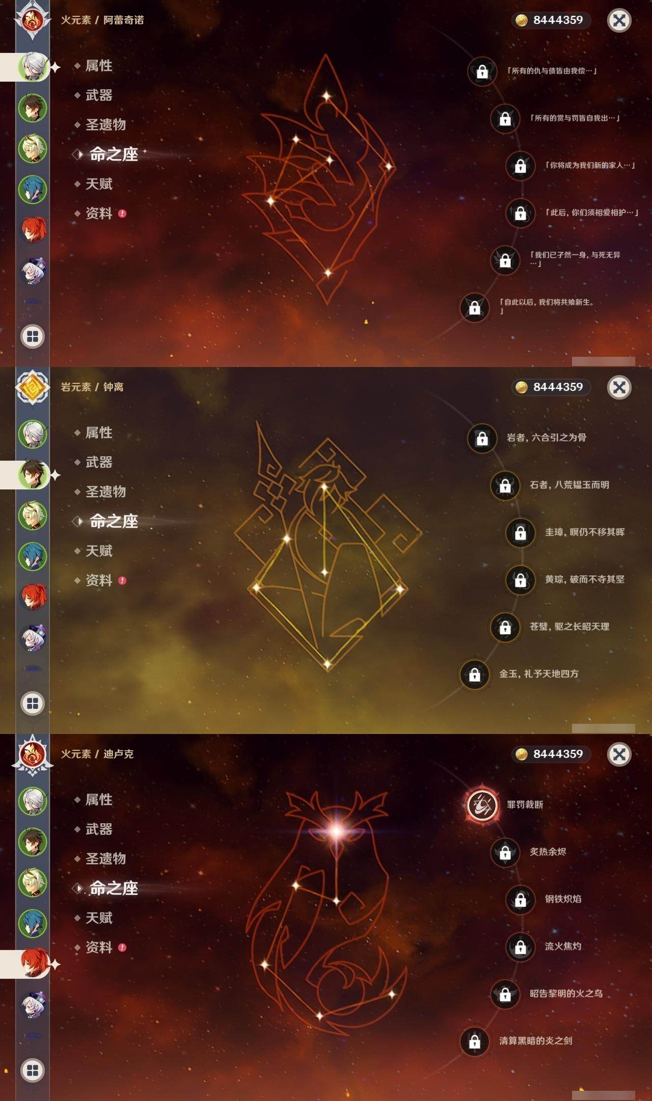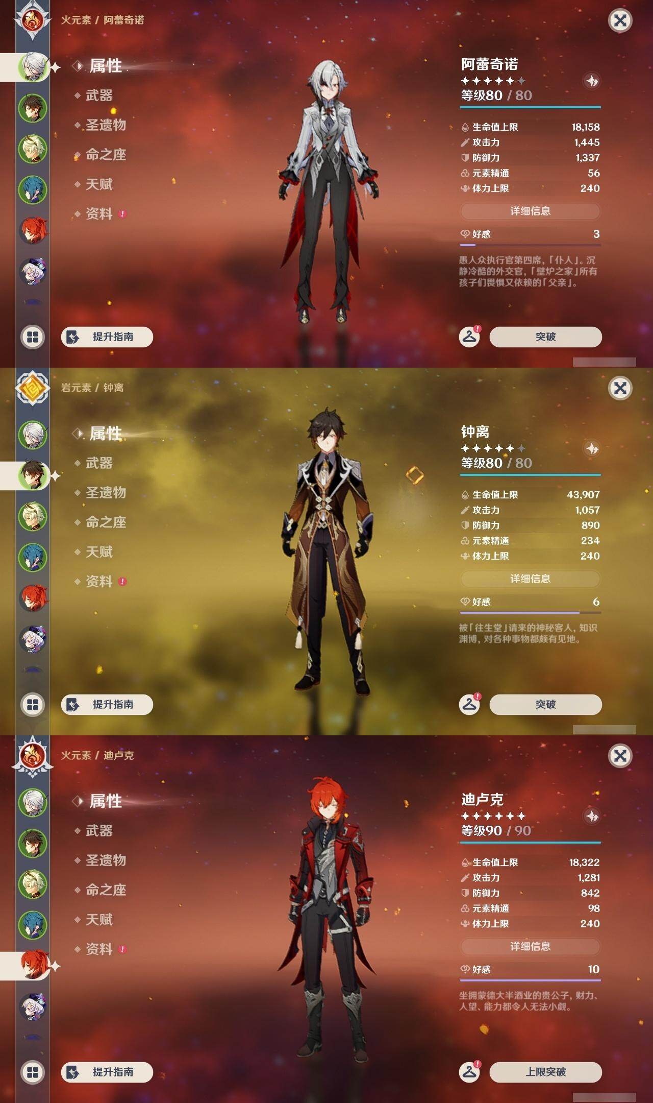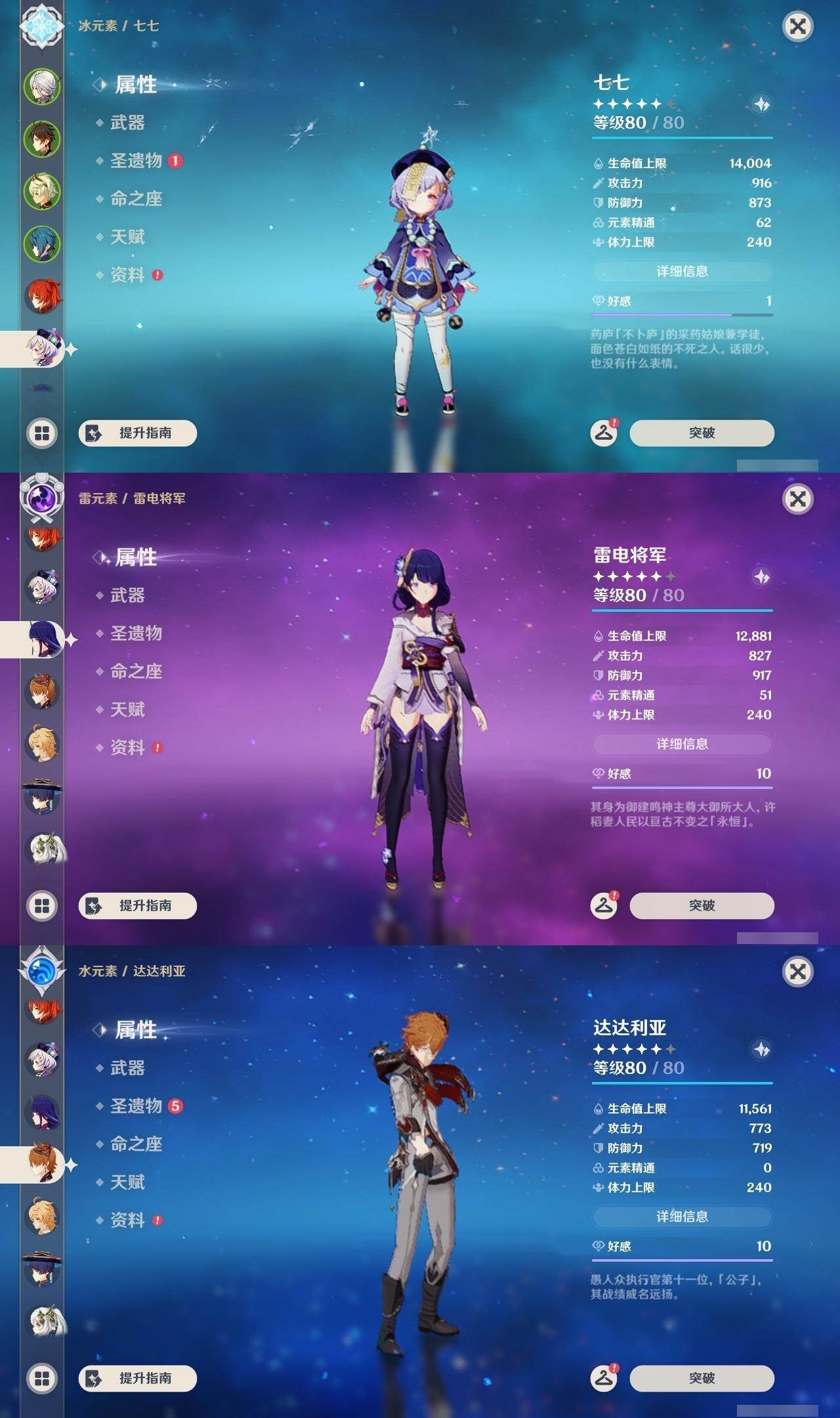 钟离,迪卢克,七七,雷电将军,达达利亚,胡桃,优菈,莫娜,琴,刻晴