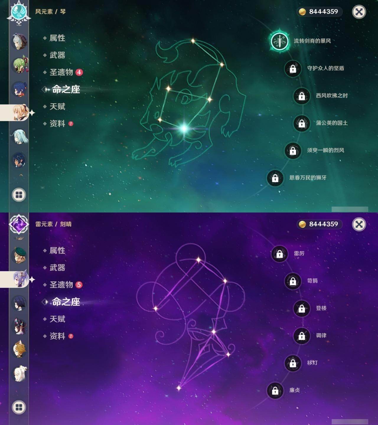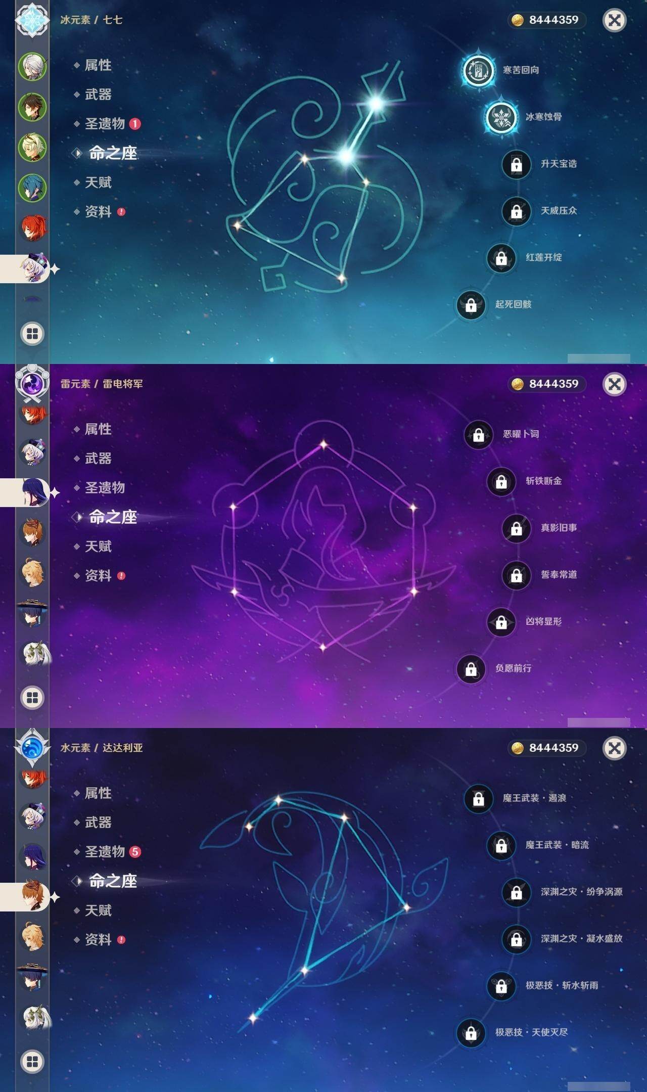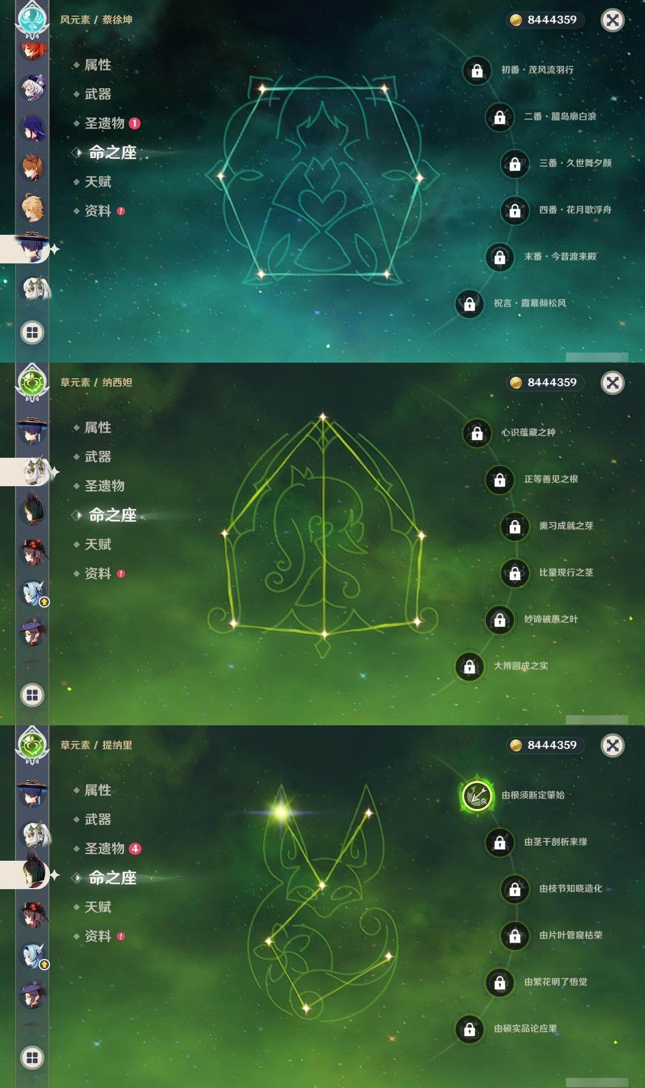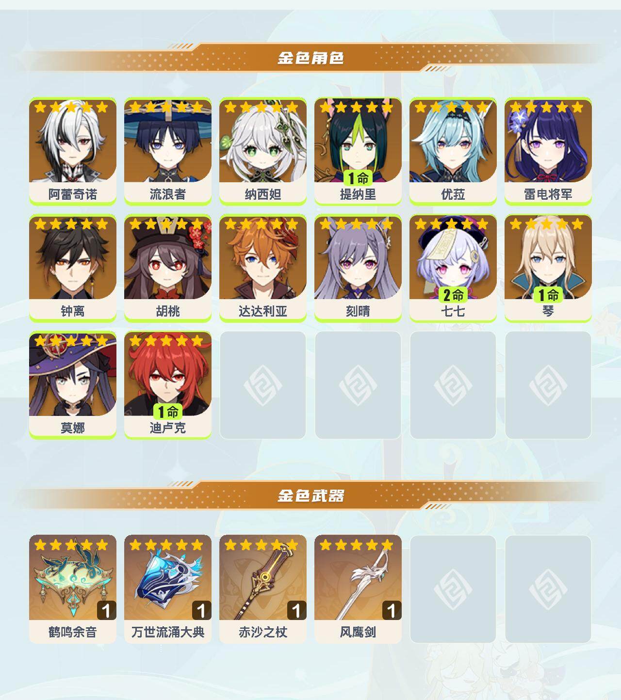 0命阿蕾奇诺,0命流浪者,0命纳西妲,1命提纳里,0命优菈,0命雷电将军,0命钟离,0命胡桃,0命达达利亚,0命刻晴,2命七七,1命琴,0命莫娜,1命迪卢克,精1鹤鸣余音,精1万世流涌大典,精1赤沙之杖,精1风鹰剑