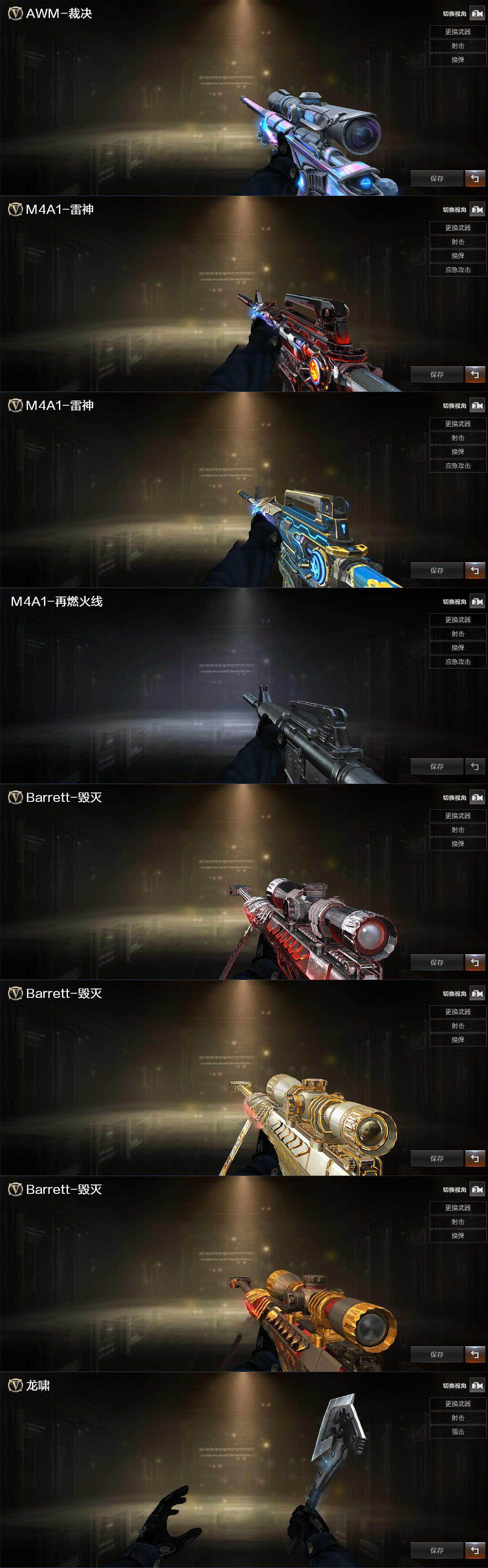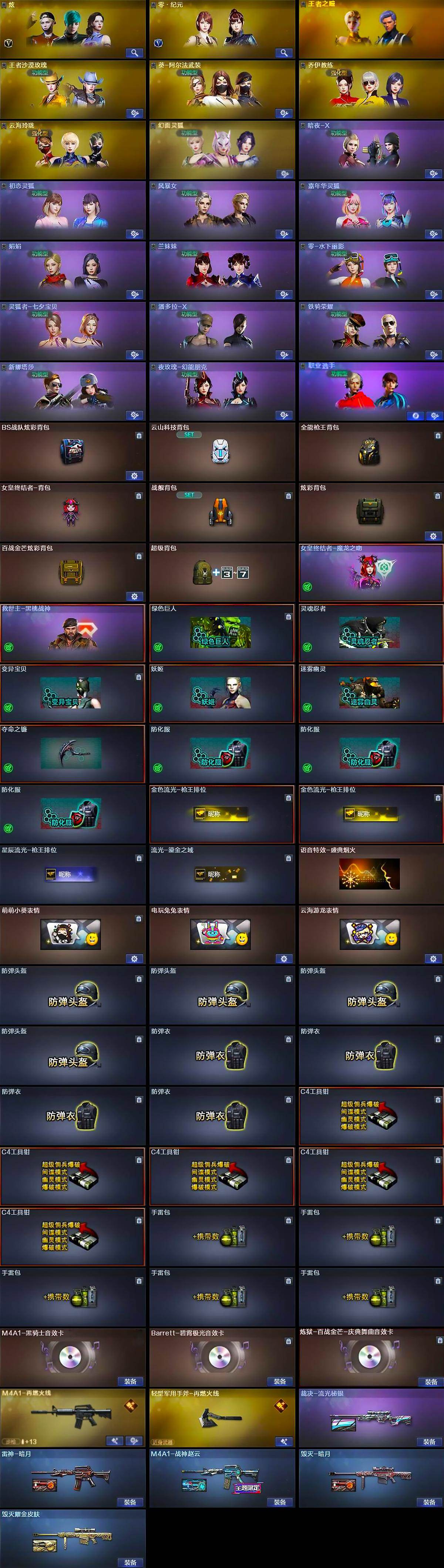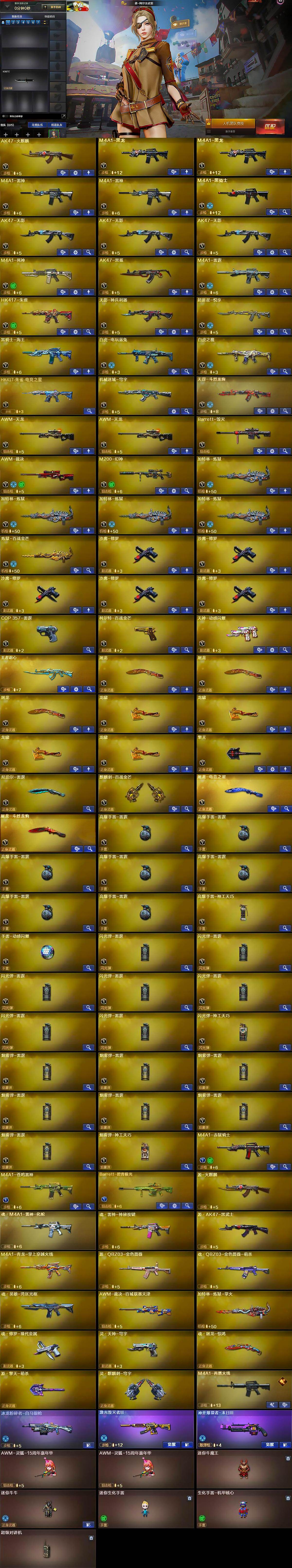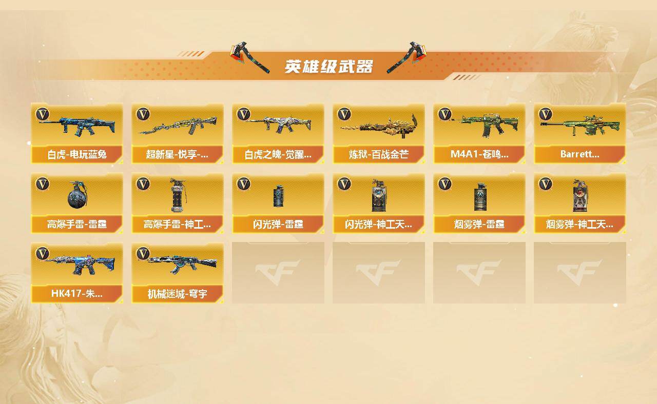 【英雄级武器】:AK47-火麒麟,M4A1-黑龙*2,M4A1-雷神*2,M4A1-黑骑士,AK47-无影*3,M4A1-死神,AK47-黑鲨,M4A1-雷霆,HK417-朱雀,无影-神兵利器,超新星-悦享-觉醒版,黑骑士-海王,白虎-电玩蓝兔,白虎之魄-觉醒版,HK417-朱雀-电竞之星,机械迷城-穹宇,天罚-斗烈龙驹,AWM-天龙*2,Barrett-毁灭,AWM-裁决,M200-幻神,加特林-炼狱*4,炼狱-百战金芒,沙鹰-修罗*5,COP-雷霆,柯尔特-百战金芒,天神-动感闪耀,屠龙*3,龙啸*4,擎天,尼泊尔-雷霆,麒麟刺-百战金芒,屠龙-电竞之星,屠龙-斗烈龙驹,高爆手雷-雷霆*7,高爆手雷-神工天巧,手雷-动感闪耀,闪光弹-雷霆*7,闪光弹-神工天巧,烟雾弹-雷霆*7,烟雾弹-神工天巧,M4A1-赤狱骑士,M4A1-苍鸣雷神,Barrett-碧霄极光