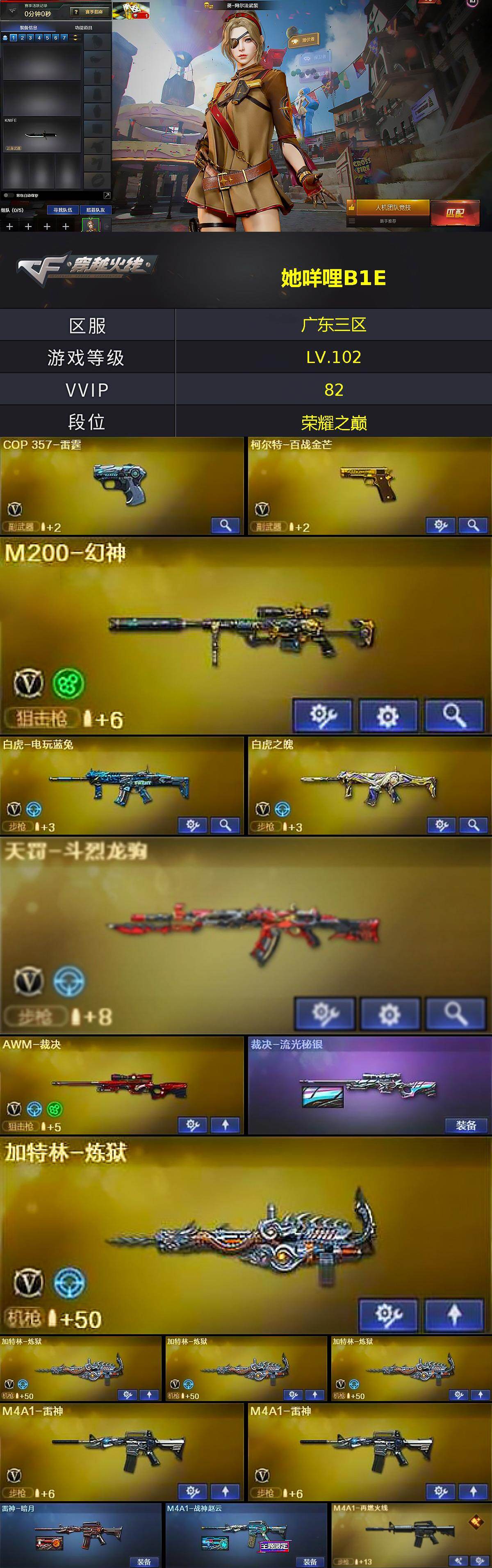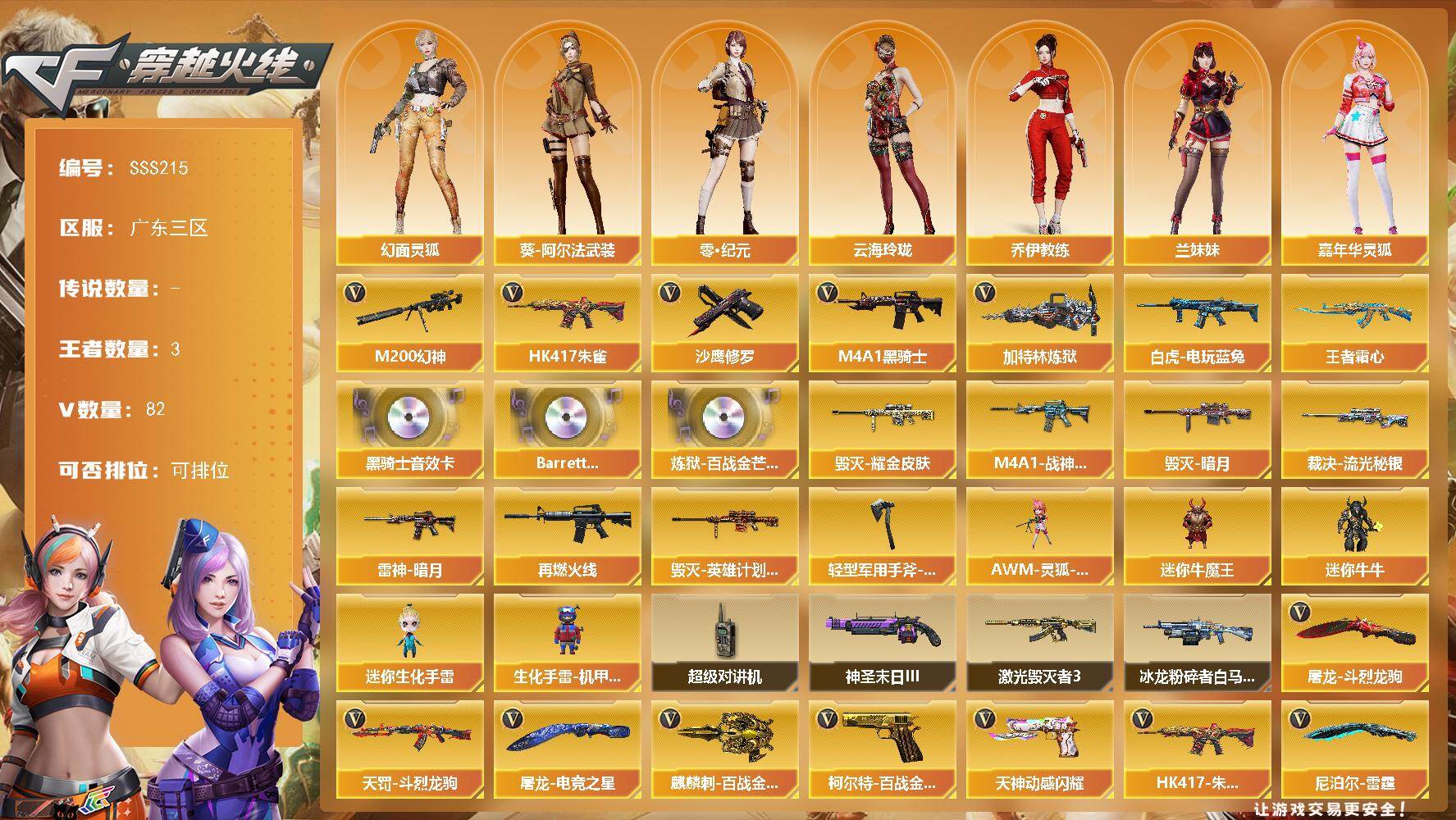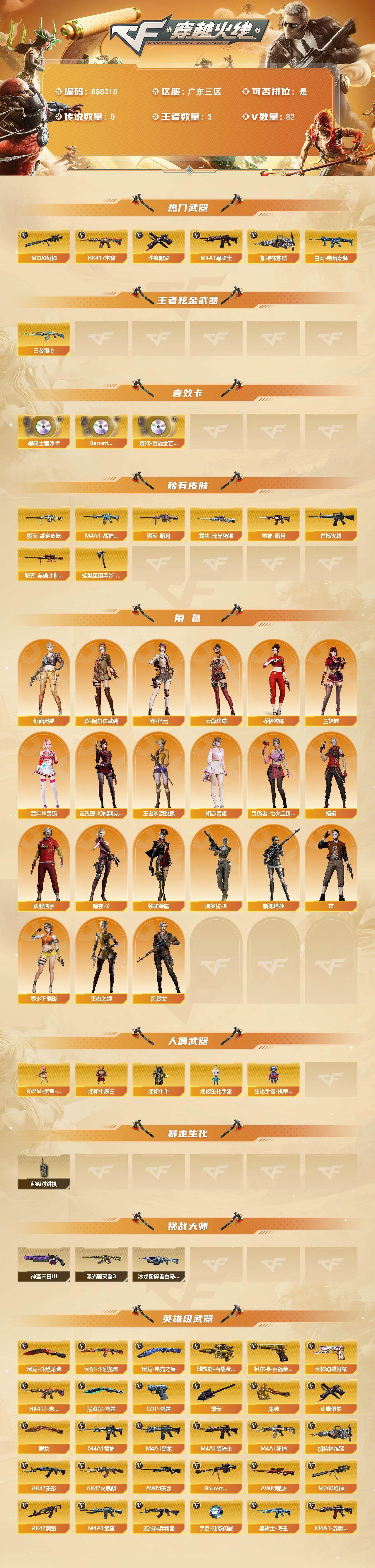 [17633086]广东三区-85V-3王者武器数-0炫金武器数 【热门武器】:HK417-朱雀,M200-幻神,白虎-电玩蓝兔,M4A1-黑骑士,加特林-炼狱*4,沙鹰-修罗*5 【王者炫金武器】:王者霜心 【音效卡】:M4A1-黑骑士音效卡,Barrett-碧霄极光音效卡,炼狱-百战金芒-庆典舞曲音效卡 【皮肤】:裁决-流光秘银,雷神-暗月,M4A1-战神赵云,M4A1-再燃火线,毁灭-暗月,毁灭耀金皮肤,毁灭-英雄计划 皮肤,轻型军用手斧-再燃火线 【角色】:炫,零·纪元,王者之瞳,王者沙漠玫瑰,乔伊教练,云海玲珑,葵-阿尔法武装,幻面灵狐,暗夜-X,初恋灵狐,风暴女,嘉年华灵狐,娟娟,兰妹妹,零-水下丽影,灵狐者-七夕宝贝,潘多拉-X,铁骑荣耀,新娜塔莎,夜玫瑰-幻能朋克,职业选手 【人偶武器】:AWM-灵狐-15周年嘉年华*2,迷你牛魔王,迷你牛牛,迷你生化手雷,生化手雷-机甲核心 【暴走生化】:超级对讲机 【挑战大师】:冰龙粉碎者-白马银枪,激光毁灭者III,神圣爆裂者-末日III 【英雄级武器】:AK47-火麒麟,M4A1-黑龙*2,M4A1-雷神*2,M4A1-黑骑士,AK47-无影*3,M4A1-死神,AK47-黑鲨,M4A1-雷霆,HK417-朱雀,无影-神兵利器,超新星-悦享-觉醒版,黑骑士-海王,白虎-电玩蓝兔,白虎之魄-觉醒版,HK417-朱雀-电竞之星,机械迷城-穹宇,天罚-斗烈龙驹,AWM-天龙*2,Barrett-毁灭,AWM-裁决,M200-幻神,加特林-炼狱*4,炼狱-百战金芒,沙鹰-修罗*5,COP-雷霆,柯尔特-百战金芒,天神-动感闪耀,屠龙*3,龙啸*4,擎天,尼泊尔-雷霆,麒麟刺-百战金芒,屠龙-电竞之星,屠龙-斗烈龙驹,高爆手雷-雷霆*7,高爆手雷-神工天巧,手雷-动感闪耀,闪光弹-雷霆*7,闪光弹-神工天巧,烟雾弹-雷霆*7,烟雾弹-神工天巧,M4A1-赤狱骑士,M4A1-苍鸣雷神,Barrett-碧霄极光 【源级武器】:源·火麒麟,魂·M4A1-雷神-化蛇,魂·雷神-神秘按键,源·AK47-黑武士,源·青龙,M4A1-青龙-掌上穿越火线,源-金色蔷薇,魂·QBZ03-金色蔷薇-萌杀,魂·英雄-湾区光枢,AWM-裁决-百城联赛天津,加特林-炼狱-掌火,魂·修罗-现代金属,灵·天神-穹宇,魂·屠龙-惊鸿,源·擎天-萌杀,魂·龙啸-秦师,灵