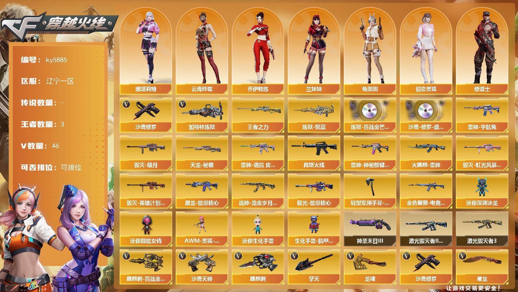 [17634195]【ky5885】辽宁一区-46V-3王者-0炫金 【热门武器】:加特林-炼狱,沙鹰-修罗*3 【王者炫金武器】:王者之力,炼狱-悦蓝*2 【音效卡】:炼狱-百战金芒-庆典舞曲音效卡,沙鹰-修罗-盛典舞曲音效卡 【皮肤】:金色蔷薇-电竞之星 皮肤,雷神-宇航兔皮肤,雷神-诺拉 皮肤,M4A1-再燃火线,雷神-神秘按键 皮肤,火麒麟-雷神,毁灭-暗月,毁灭-虹光风暴 皮肤,毁灭-英雄计划 皮肤,黑龙-能量核心*2,战神-流金岁月皮肤,天龙-秘银,极光-能量核心,轻型军用手斧-再燃火线 【角色】:零,葵,瞳,乔伊教练,修道士,云海玲珑,初恋灵狐,芳心审判者,风暴女,兰妹妹,灵狐者-X,灵狐者-黄金海岸,麻雀,娜塔莉娅,蜀雪,兔囡囡,雪莉杨-摸金校尉 【人偶武器】:AWM-灵狐-15周年嘉年华*2,迷你深渊冰龙,迷你生化手雷*2,生化手雷-机甲核心,迷你超能女侍 【挑战大师】:激光毁灭者III-白马银枪,激光毁灭者III,神圣爆裂者-末日III 【英雄级武器】:AK47-火麒麟*4,M4A1-黑龙,M4A1-雷神*3,AK47-机械迷城,黑骑士-海王,AWM-天龙*3,Barrett-毁灭*2,Barrett-极光*2,加特林-炼狱,炼狱-百战金芒,沙鹰-修罗*3,沙鹰-天神*3,屠龙*3,龙啸*2,擎天*2,麒麟刺,麒麟刺-百战金芒,M4A1-赤狱骑士,M4A1-苍鸣雷神,Barrett-碧霄极光*2 【道具】:BS战队炫彩背包,CFS限定背包,云山科技背包,冰冰企鹅背包-猛男专用,战舰背包,炫彩背包,百战金芒炫彩背包,背包-洛丽塔,超级背包,迷你冰龙背包,圣拳猎手-炽雪,女皇终结者-魔龙之吻,救世主-黑桃战神,黄金生化钩,绿色巨人,灵魂忍者*2,变异宝贝,迷雾幽灵,夺命之镰,防化服*3,枪王排位29赛季金色流光,语音特效-盛典烟火,萌萌小葵表情,动感闪耀表情,防弹头盔*3,防弹衣*3,C4工具钳*3,手雷包*3 【特殊枪械】:1炼狱