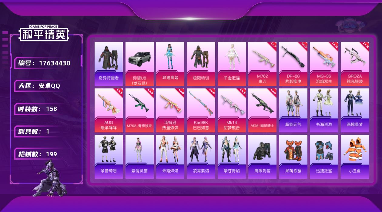 [17634430]安卓 手Q-3粉装-13特效枪-1载具-2粉色飞行器-58769热力值-9王牌印记-158套装-199枪皮 【热门品类】:套装-小丑鱼,套装-奇异狩猎者,套装-龟仙人,套装-暗影哥特,套装-红红火火 【粉色套装】:粉装-极限特训,角色-千金淑猫,角色-异瞳寒姬 【粉色枪皮等级】:AKM-幽焰骑士(三级),GROZA-镜光银凌(五级),AUG-暖羊咩咩(五级),M762-青锋波束(五级),M762-鬼刀(七级),汤姆逊-热量炸弹(五级),AKS-74U-森灵之息(五级),Kar98K-巳巳如意(五级),Mk14-甜梦熊击(五级),Mk14-福马献瑞(五级),AA12-G-萌骑幻想(三级),DP-28-豹影疾电(五级),MG-36-沧焰双生(五级) 【粉色载具】:仰望U8(龙石绿) 【粉色枪皮】:AKM-幽焰骑士,GROZA-镜光银凌,AUG-暖羊咩咩,M762-青锋波束,M762-鬼刀,汤姆逊-热量炸弹,AKS-74U-森灵之息,Kar98K-巳巳如意,Mk14-甜梦熊击,Mk14-福马献瑞,AA12-G-萌骑幻想,DP-28-豹影疾电,MG-36-沧焰双生 【粉色飞行器】:炫彩糖果飞行器,幽焰列车飞行器 【粉色降落伞】:幻影战神降落伞,拳皇·狂花道降落伞,BEARBRICK降落伞,幽焰骑士降落伞,千金淑猫降落伞,月影灵韵降落伞,星穹咏叹调降落伞,幻彩电音降落伞,无垠阁降落伞,异瞳寒姬降落伞,炫彩糖果降落伞 【稀有套装】:套装-龟仙人,套装-绒宝小鹅,套装-巳巳如意,套装-乐游熊熊,套装-超能元气,套装-雪国风尚,套装-炫彩糖果,套装-彩虹骑师,角色-罗莉,套装-马上有钱,套装-雏菊兔兔,套装-萝兰蝴蝶,套装-小熊娃娃,角色-狂花道·娜可露露,角色-狂花道·雅典娜,套装-先驱飞行员,套装-糖糖葫芦,套装-青团波波,套装-棉花软糖,角色-都市丽猫,角色-摩登魅猫,套装-燕燕于飞,套装-鱼渊荷华,套装-粉恋花,套装-紫幽梦,套装-蓝冰羽,套装-星渊小夜曲,套装-彩虹兔,套装-云朵鹅,套装-雪绒豹,套装-蓝海鲸歌,套装-朱霞炽焰,套装-凌霄紫焰,套装-擎苍青焰,角色-紫俏灵猫,套装-书海巡游,套装-画境星梦,套装-琴音绮想,套装-雨过天青,套装-红釉青花 【稀有枪皮】:AUG-冰晶雪宝,AKM-影袭,AKM-缤纷海域,AKM-龙的传人,SCAR-L-夜灯,SCAR-L-炫