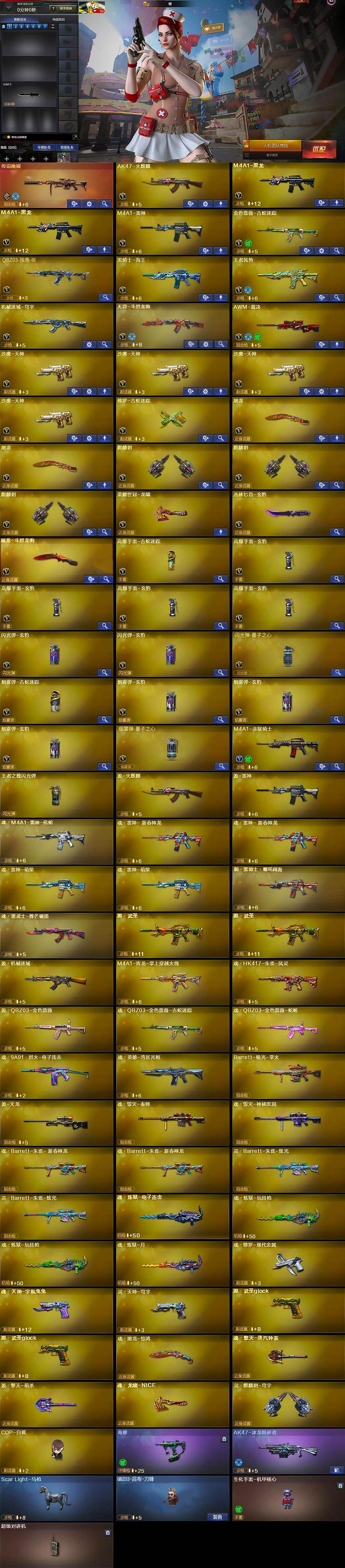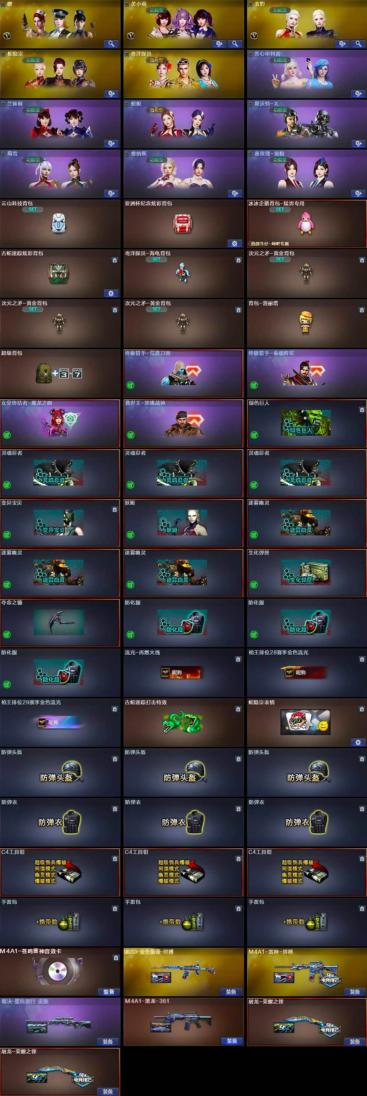 【英雄级武器】:AK47-火麒麟,M4A1-黑龙*2,M4A1-雷神,金色蔷薇-古蛇迷踪,QBZ03-独角-III,黑骑士-海王,王者风势-觉醒版,机械迷城-穹宇,天罚-斗烈龙驹,AWM-裁决,沙鹰-天神*4,修罗-古蛇迷踪,屠龙*2,麒麟刺*3,荣耀世冠-龙啸,丛林匕首-玄豹,屠龙-斗烈龙驹,高爆手雷-古蛇迷踪,高爆手雷-玄豹*4,闪光弹-玄豹*2,闪光弹-量子之心,烟雾弹-古蛇迷踪,烟雾弹-玄豹*3,烟雾弹-量子之心,M4A1-赤狱骑士