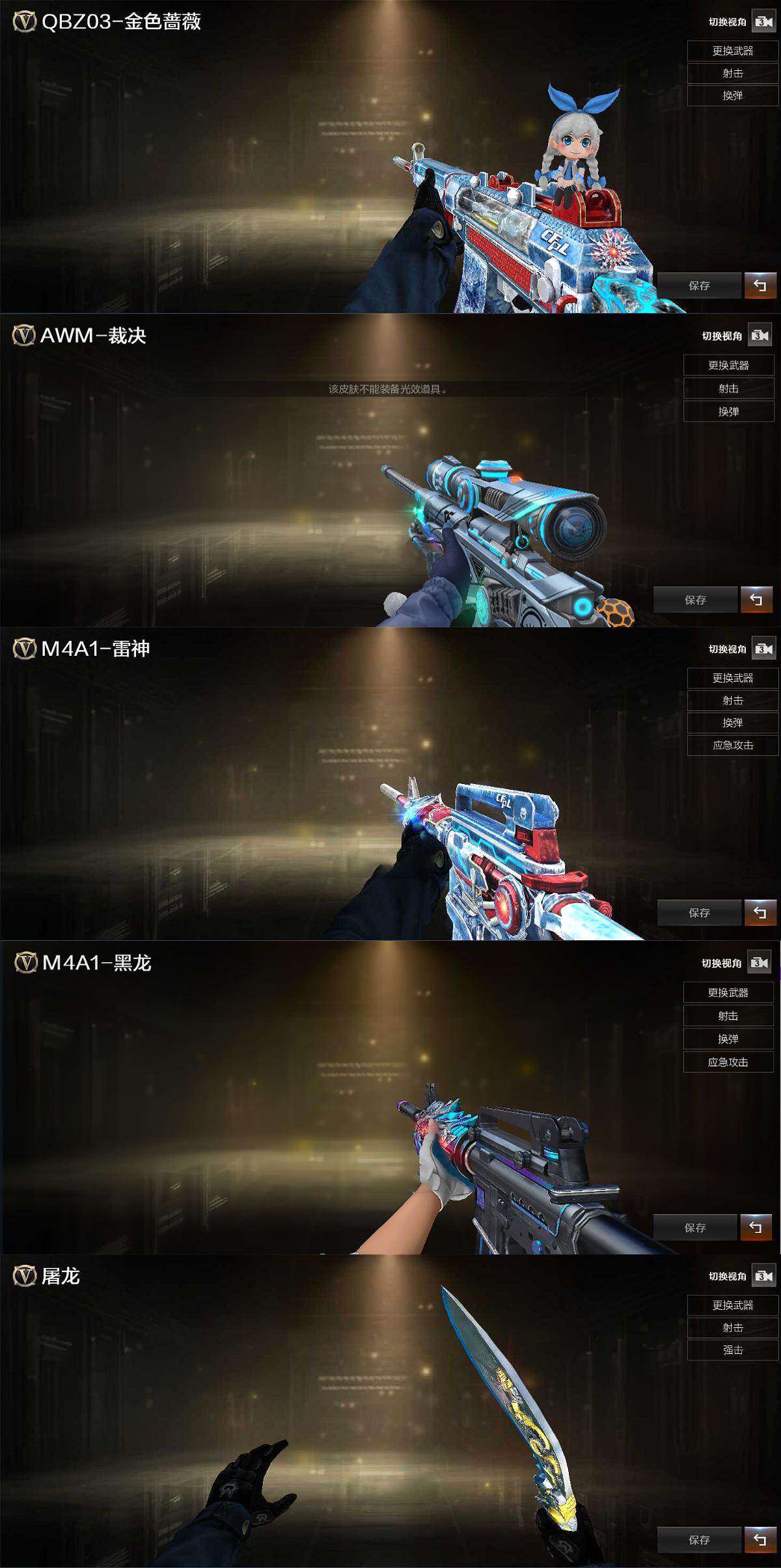【皮肤】:QBZ03-金色蔷薇-拼搏,裁决-星际旅行 皮肤,M4A1-雷神-拼搏,M4A1-黑龙-361,屠龙-荣耀之锋*2