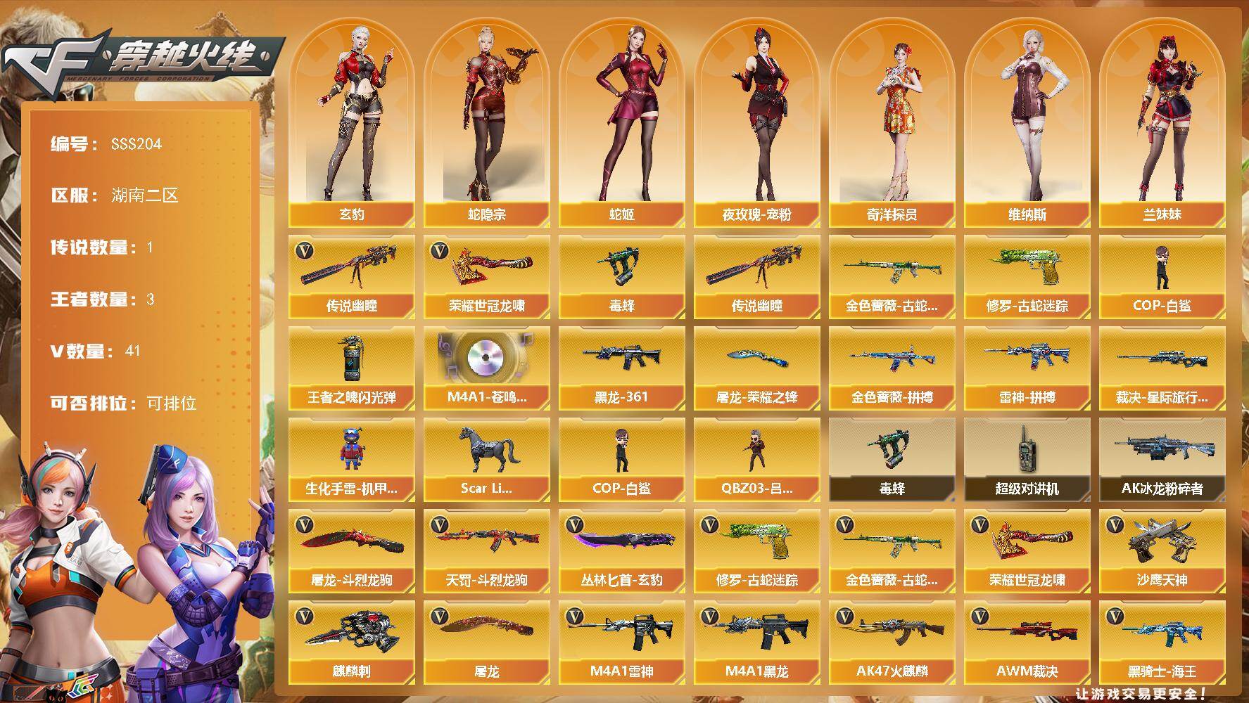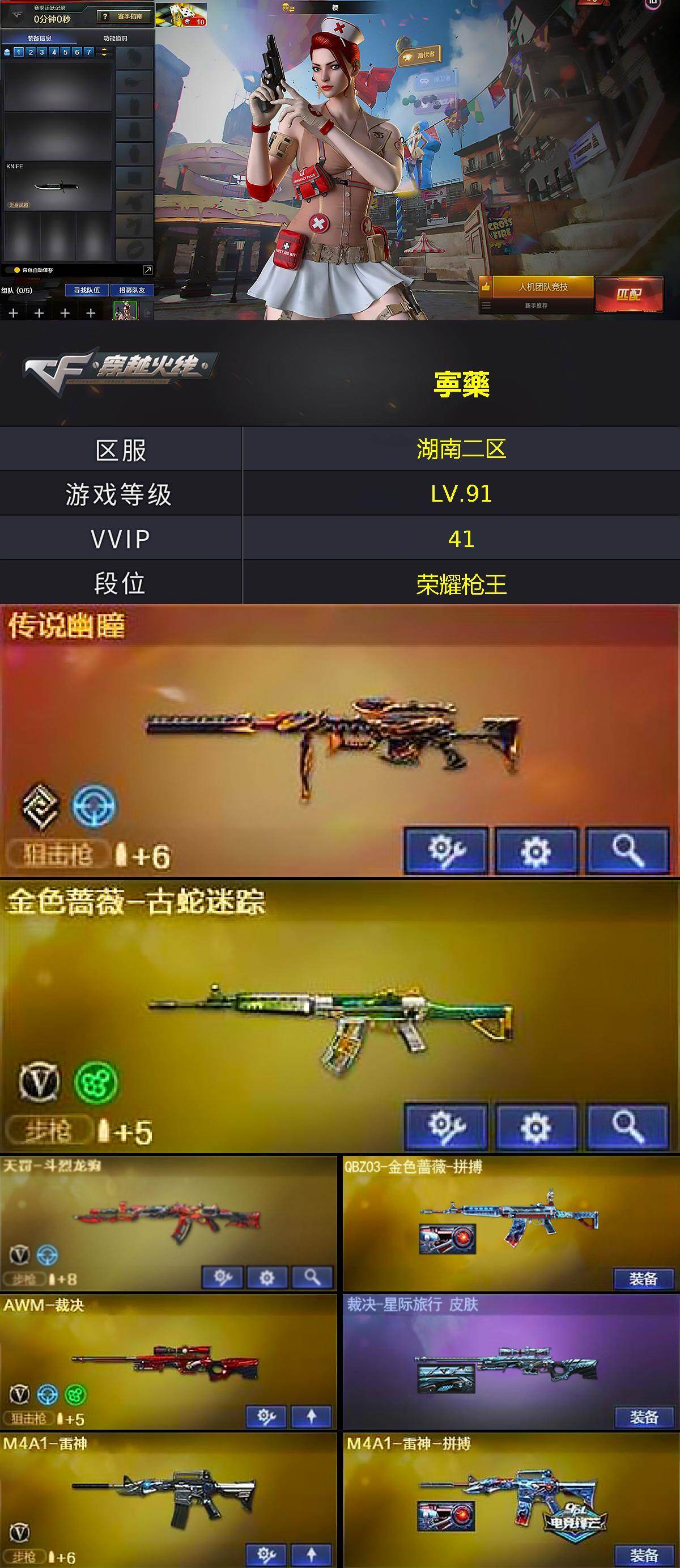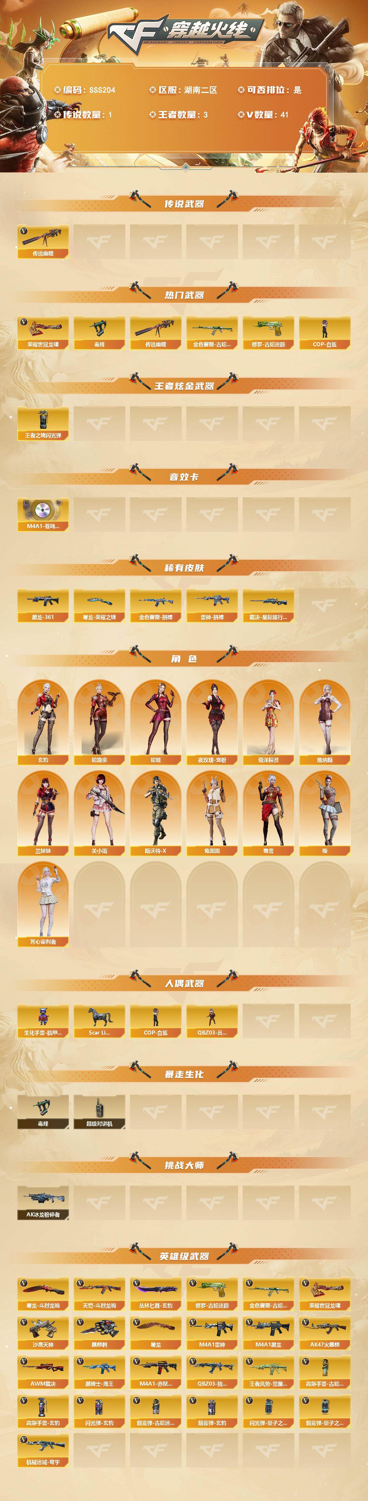 [17635204]湖南二区-39V-3王者武器数-0炫金武器数 【传说武器】:传说幽瞳 【热门武器】:传说幽瞳,金色蔷薇-古蛇迷踪,修罗-古蛇迷踪,毒蜂,COP-白鲨,荣耀世冠-龙啸 【王者炫金武器】:王者之魄闪光弹 【音效卡】:M4A1-苍鸣雷神音效卡 【皮肤】:QBZ03-金色蔷薇-拼搏,裁决-星际旅行 皮肤,M4A1-雷神-拼搏,M4A1-黑龙-361,屠龙-荣耀之锋*2 【角色】:樱,关小雨,玄豹,蛇隐宗,奇洋探员,芳心审判者,兰妹妹,蛇姬,斯沃特-X,蜀雪,兔囡囡,维纳斯,夜玫瑰-宠粉 【人偶武器】:COP-白鲨,Scar Light-马枪,QBZ03-吕布-刀锋,生化手雷-机甲核心 【暴走生化】:毒蜂,超级对讲机 【挑战大师】:AK47-冰龙粉碎者 【英雄级武器】:AK47-火麒麟,M4A1-黑龙*2,M4A1-雷神,金色蔷薇-古蛇迷踪,QBZ03-独角-III,黑骑士-海王,王者风势-觉醒版,机械迷城-穹宇,天罚-斗烈龙驹,AWM-裁决,沙鹰-天神*4,修罗-古蛇迷踪,屠龙*2,麒麟刺*3,荣耀世冠-龙啸,丛林匕首-玄豹,屠龙-斗烈龙驹,高爆手雷-古蛇迷踪,高爆手雷-玄豹*4,闪光弹-玄豹*2,闪光弹-量子之心,烟雾弹-古蛇迷踪,烟雾弹-玄豹*3,烟雾弹-量子之心,M4A1-赤狱骑士 【源级武器】:源·火麒麟,源·雷神,魂·M4A1-雷神-化蛇,魂·雷神-新春神龙*2,魂·雷神-萌柴*2,御·黑骑士·哪吒闹海,魂·黑武士-锋芒破茧,源·武圣*2,源·机械迷城,M4A1-青龙-掌上穿越火线,魂·HK417-朱雀-凤灵,源-金色蔷薇,魂·QBZ03-金色蔷薇-古蛇迷踪,魂·QBZ03-金色蔷薇-蛇姬,魂·9A91·烈火-电子连击,魂·英雄-湾区光枢,Barrett-极光-掌火,源·天龙,魂·裁决-羽掣,魂·毁灭-秦师,魂·毁灭-神秘黑洞,魂·Barrett-朱雀- 新春神龙*2,灵·Barrett-朱雀-炫光*2,魂·炼狱-电子连击,魂·炼狱-玩具枪*2,魂·炼狱-月,魂·修罗-现代金属,魂·天神-宇航兔兔,灵·天神-穹宇,源·武圣glock*2,魂·屠龙-惊鸿,魂·擎天-蒸汽钟表,源·擎天-萌杀,魂·龙啸-NICE,魂·龙啸-秦师,灵·麒麟刺-穹宇 【道具】:云山科技背包,亚洲杯纪念炫彩背包,冰冰企鹅背包-猛男专用,古蛇迷踪炫彩背包,奇洋探员-海龟背包,次元之矛-黄金背