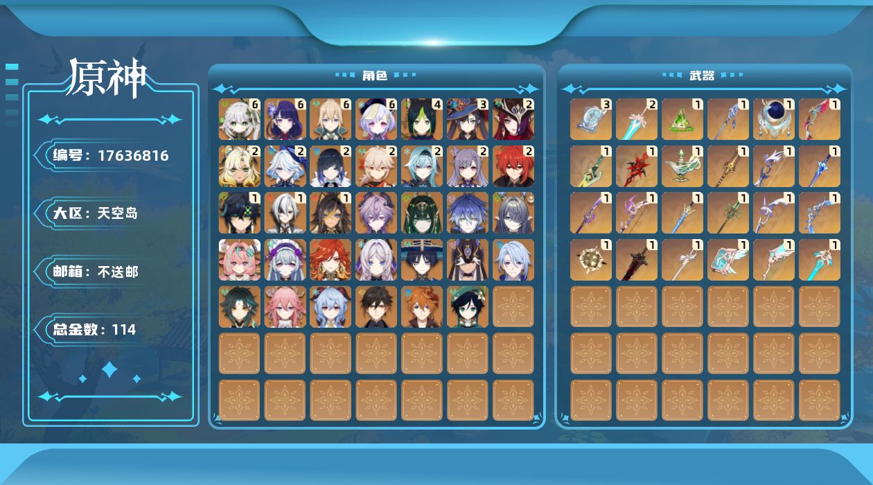 1命阿蕾奇诺,2命芙宁娜,1命迪希雅,0命流浪者,满命纳西妲,0命赛诺,4命提纳里,2命夜兰,0命神里绫人,0命八重神子,2命优菈,满命雷电将军,2命枫原万叶,0命钟离,0命甘雨,0命魈,0命温迪,0命达达利亚,2命刻晴,满命七七,满命琴,3命莫娜,2命迪卢克,1命基尼奇,2命希诺宁,2命恰斯卡,0命玛薇卡,0命茜特菈莉,0命梦见月瑞希,0命瓦雷莎,0命菈乌玛,0命菲林斯,0命奈芙尔,0命杜林,精1赤月之形,精1千夜浮梦,精1赤沙之杖,精1若水,精1波乱月白经津,精1冬极白星,精1薙草之稻光,精1飞雷之弦振,精1苍古自由之誓,精3四风原典,精1和璞鸢,精1天空之翼,精1阿莫斯之弓,精1天空之刃,精1天空之卷,精1尘世之锁,精1风鹰剑,精1狼的末路,精2天空之傲,精1山王长牙,精1星鹫赤羽,精1纺夜天镜,精1血染荒城,精1真语秘匣