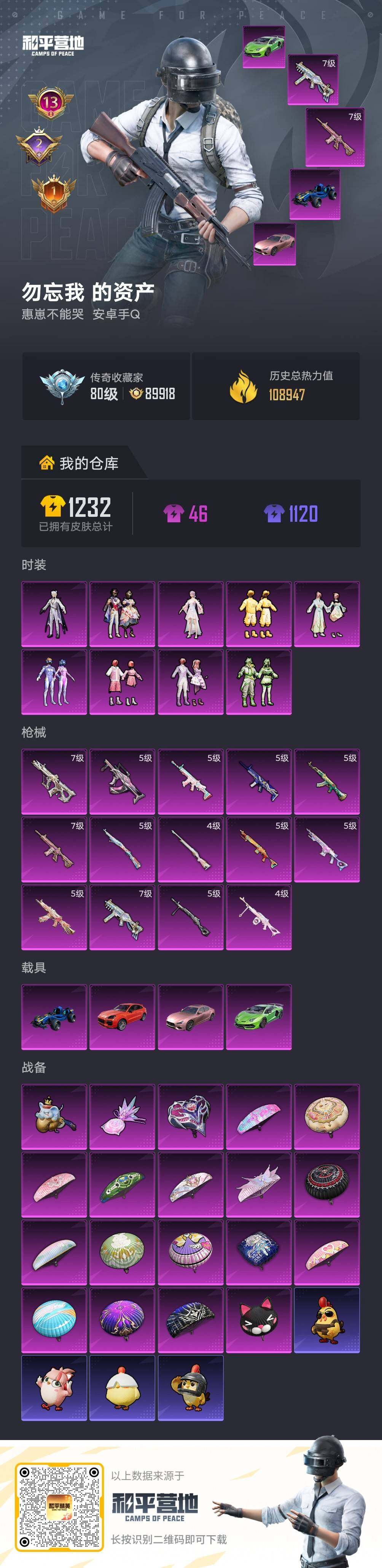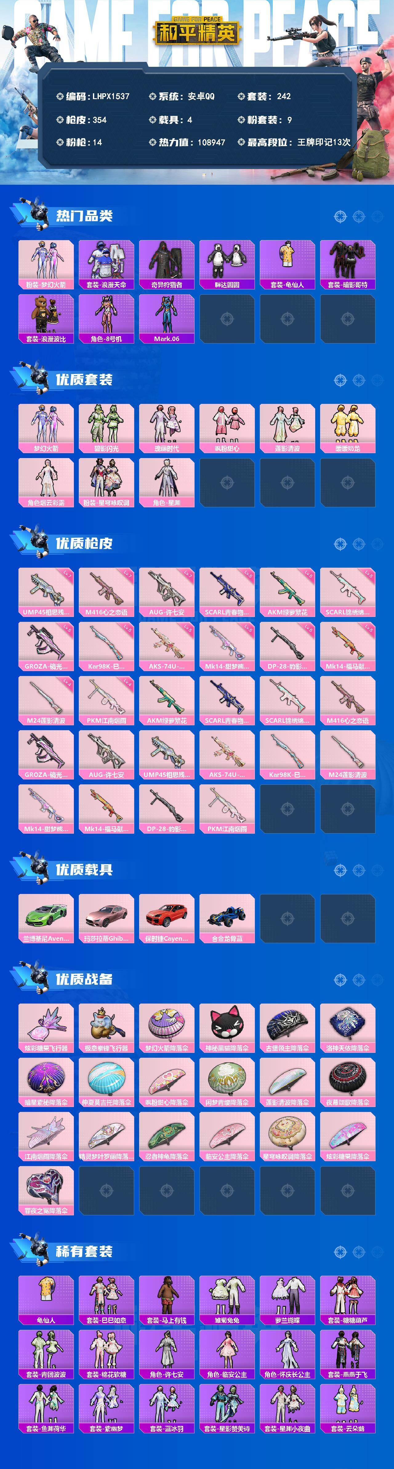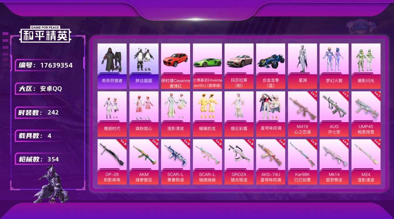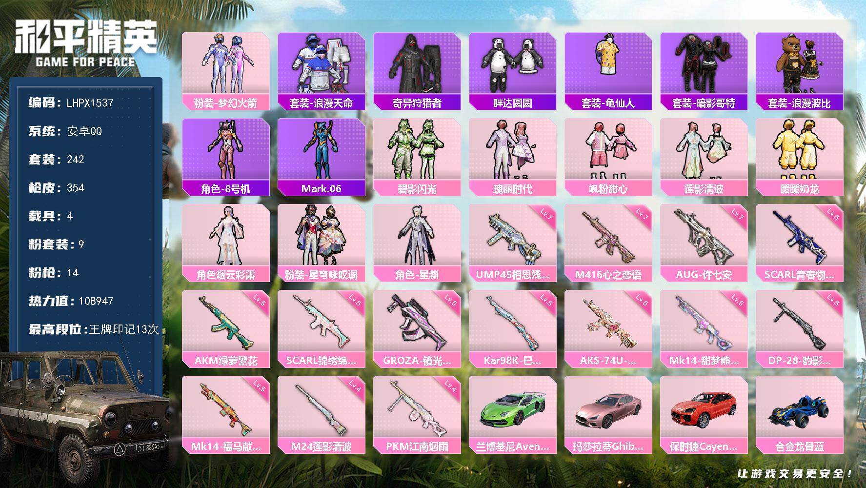 [17639354]可二次【特价出售/店主推荐】安卓 手Q-9粉装-14特效枪-4载具-2粉色飞行器-108947热力值-13王牌印记-242套装-354枪皮【热门品类】:粉装-梦幻火箭,套装-浪漫天命,套装-奇异狩猎者,套装-胖达圆圆,套装-龟仙人,套装-暗影哥特,套装-浪漫波比,角色-8号机,角色-Mark.06【粉色套装】:粉装-梦幻火箭,粉装-碧影闪光,粉装-瑰丽时代,粉装-飒粉甜心,粉装-莲影清波,粉装-暖暖奶龙,角色-烟云彩露,粉装-星穹咏叹调,角色-星渊【粉色枪皮等级】:AKM-绿萝繁花(五级),SCAR-L-青春物语(五级),SCAR-L-锦绣绵绵(五级),M416-心之恋语(七级),GROZA-镜光银凌(五级),AUG-许七安(七级),UMP45-相思残雪(七级),AKS-74U-星穹咏叹调(五级),Kar98K-巳巳如意(五级),M24-莲影清波(四级),Mk14-甜梦熊击(五级),Mk14-福马献瑞(五级),DP-28-豹影疾电(五级),PKM-江南烟雨(四级)【粉色载具】:兰博基尼Aventador SVJ(翡翠绿),玛莎拉蒂Ghibli(粉),保时捷Cayenne(激情红),合金龙骨(蓝)【粉色枪皮】:AKM-绿萝繁花,SCAR-L-青春物语,SCAR-L-锦绣绵绵,M416-心之恋语,GROZA-镜光银凌,AUG-许七安,UMP45-相思残雪,AKS-74U-星穹咏叹调,Kar98K-巳巳如意,M24-莲影清波,Mk14-甜梦熊击,Mk14-福马献瑞,DP-28-豹影疾电,PKM-江南烟雨【粉色飞行器】:炫彩糖果飞行器,极意拳锋飞行器