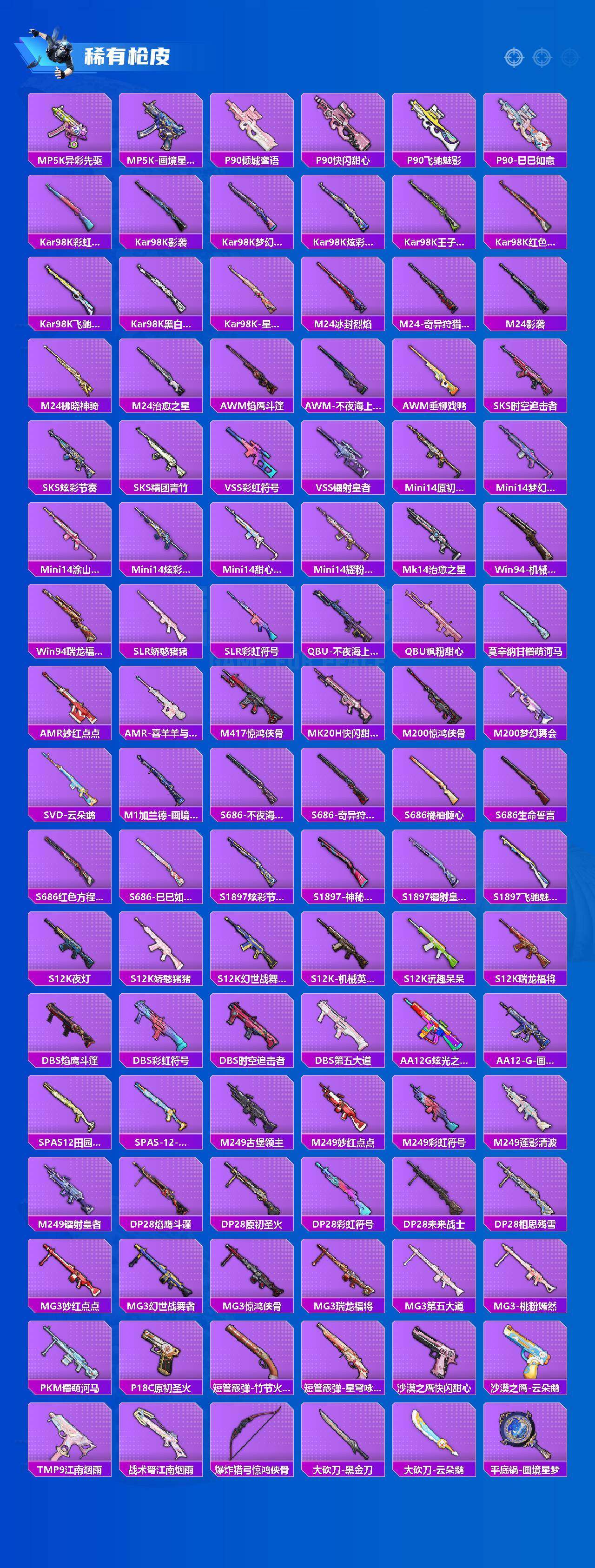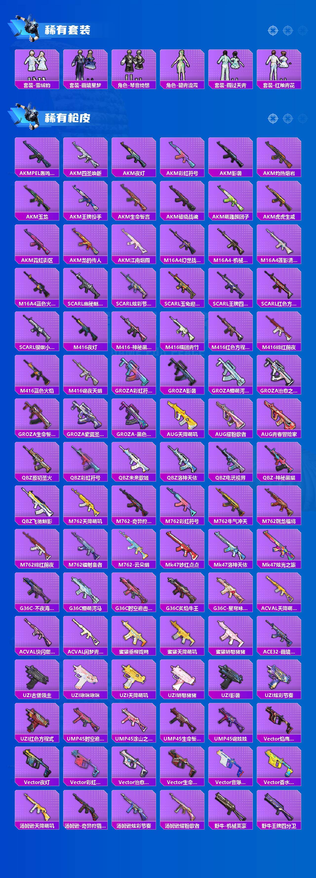 AKM-绿萝繁花,SCAR-L-青春物语,SCAR-L-锦绣绵绵,M416-心之恋语,GROZA-镜光银凌,AUG-许七安,UMP45-相思残雪,Kar98K-巳巳如意,M24-莲影清波,PKM-江南烟雨