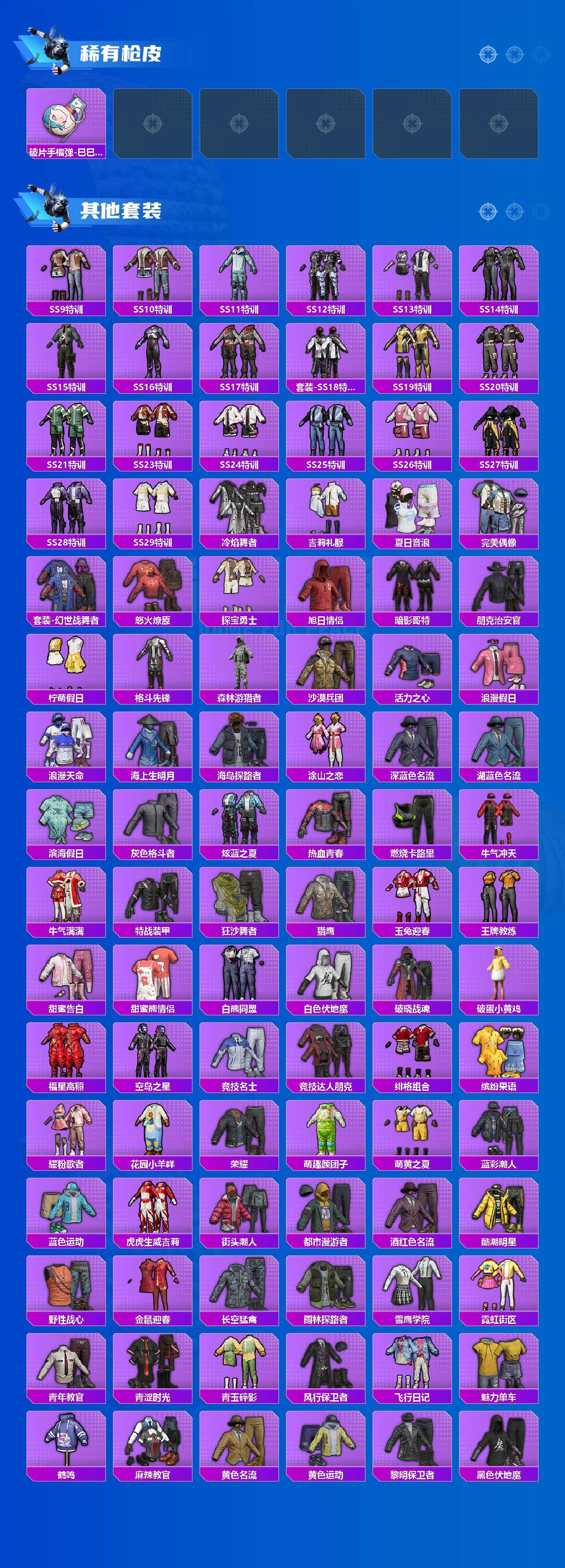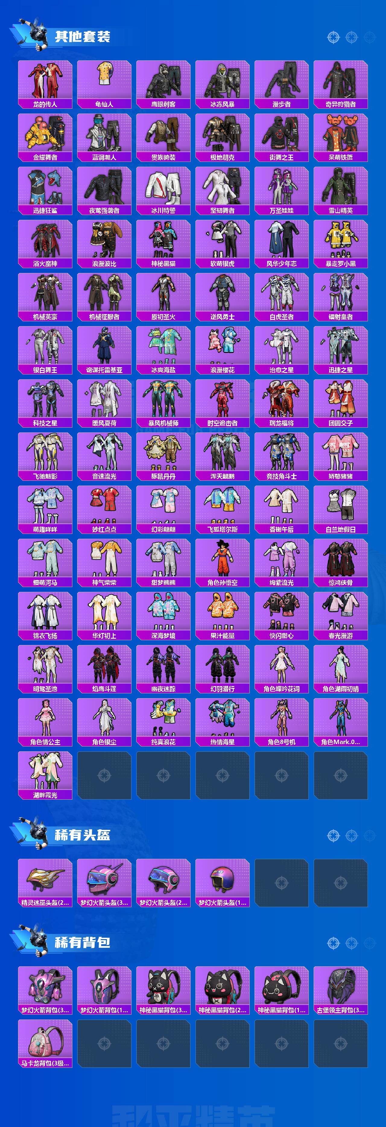 套装-梦幻火箭,套装-奇异狩猎者,套装-胖达圆圆,套装-浪漫波比,套装-碧影闪光,套装-瑰丽时代,套装-飒粉甜心,套装-莲影清波,套装-暖暖奶龙,角色-烟云彩露,套装-鹰眼刺客,套装-呆萌铁蟹,套装-迅捷狂鲨,套装-万圣娃娃,套装-神秘黑猫,套装-软萌银虎,套装-暴走罗小黑