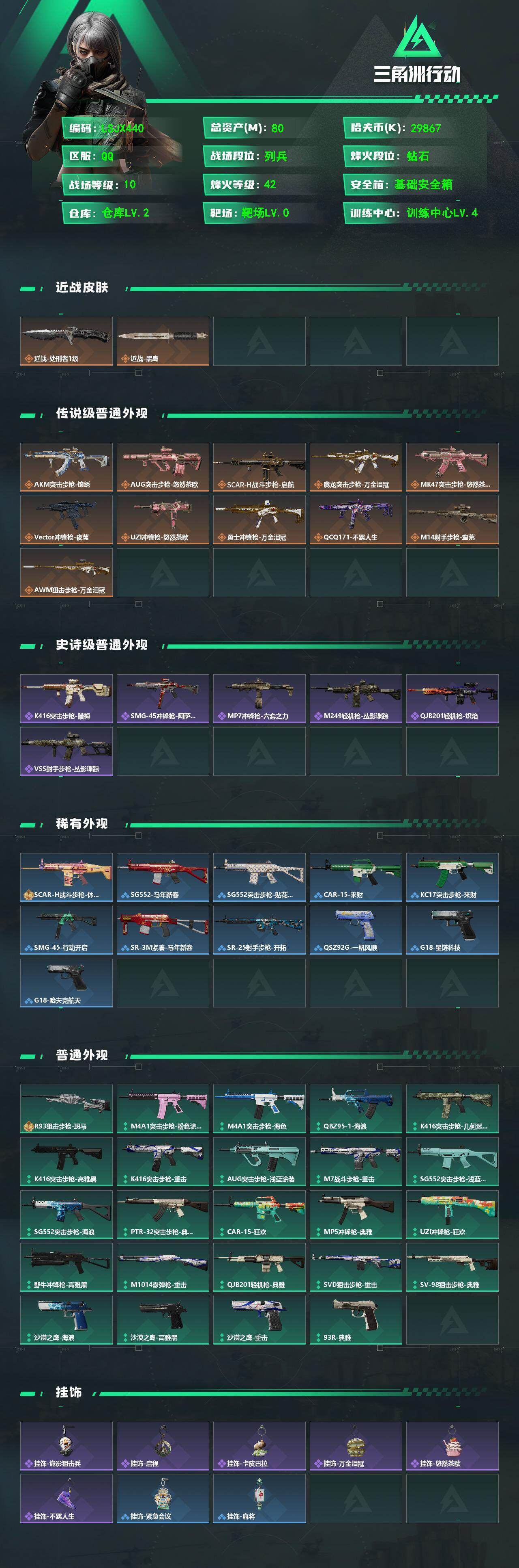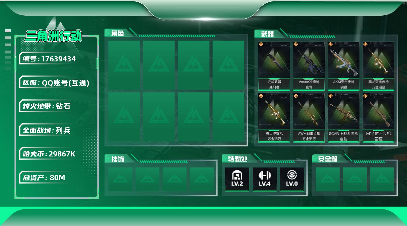 [17639434]【特价出售/店主推荐】80m总资产-29867k哈伏币-42烽火等级-钻石-10战场等级-列兵 【近战皮肤】:近战-处刑者1级,近战-黑鹰 【传说外观】:AKM突击步枪-锦绣,AUG突击步枪-悠然茶歇,SCAR-H战斗步枪-启航,腾龙突击步枪-万金泪冠,MK47突击步枪-悠然茶歇,Vector冲锋枪-夜莺,UZI冲锋枪-悠然茶歇,勇士冲锋枪-万金泪冠,QCQ171冲锋枪-不羁人生,M14射手步枪-蛮荒,AWM狙击步枪-万金泪冠 【史诗外观】:K416突击步枪-腊梅,SMG-45冲锋枪-阿萨拉特攻,MP7冲锋枪-六套之力,M249轻机枪-丛影谍踪,QJB201轻机枪-炽焰,VSS射手步枪-丛影谍踪 【稀有外观】:SCAR-H战斗步枪-休闲时光,SG552突击步枪-马年新春,SG552突击步枪-贴花艺术,CAR-15突击步枪-来财,KC17突击步枪-来财,SMG-45冲锋枪-行动开启,SR-3M紧凑突击步枪-马年新春,SR-25射手步枪-开拓,QSZ92G-一帆风顺,G18-星链科技,G18-哈夫克航天 【普通外观】:R93狙击步枪-斑马,M4A1突击步枪-粉色涂装,M4A1突击步枪-海色,QBZ95-1突击步枪-海浪,K416突击步枪-几何迷彩,K416突击步枪-高雅黑,K416突击步枪-重击,AUG突击步枪-浅蓝涂装,M7战斗步枪-重击,SG552突击步枪-浅蓝涂装,SG552突击步枪-海浪,PTR-32突击步枪-典雅,CAR-15突击步枪-狂欢,MP5冲锋枪-典雅,UZI冲锋枪-狂欢,野牛冲锋枪-高雅黑,M1014霰弹枪-重击,QJB201轻机枪-典雅,SVD狙击步枪-重击,SV-98狙击步枪-典雅,沙漠之鹰-海浪,沙漠之鹰-高雅黑,沙漠之鹰-重击,93R-典雅 【挂饰】:挂饰-诡影狙击兵,挂饰-启程,挂饰-卡皮巴拉,挂饰-万金泪冠,挂饰-悠然茶歇,挂饰-不羁人生,挂饰-紧急会议*9,挂饰-麻将*13