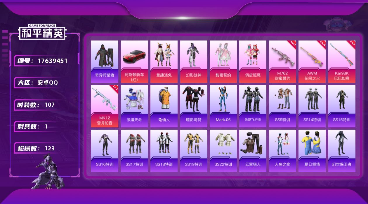 [17639451]安卓 手Q-4粉装-7特效枪-1载具-2粉色飞行器-45870热力值-10王牌印记-107套装-123枪皮