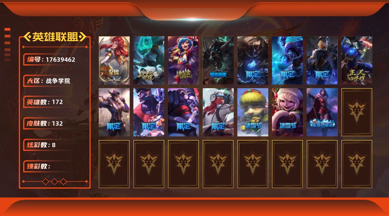 [17639462]黄金段位-172英雄-132皮肤-8炫彩-0终极-3神话-18限定-15传说-44史诗