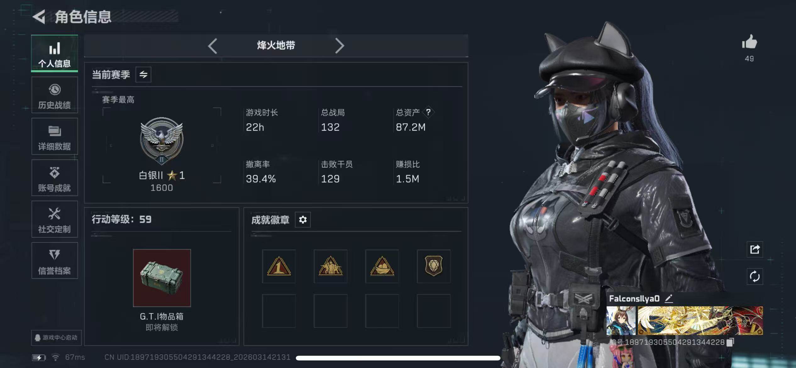 [17639467]【特价出售/店主推荐】87m总资产-20285k哈伏币-59烽火等级-白银-30战场等级-上等兵