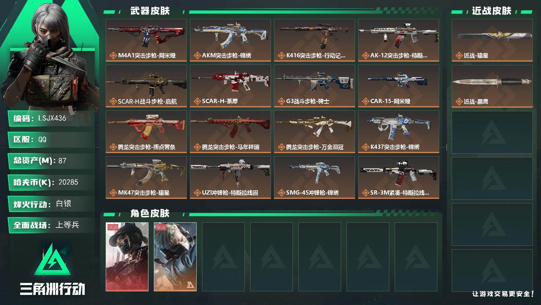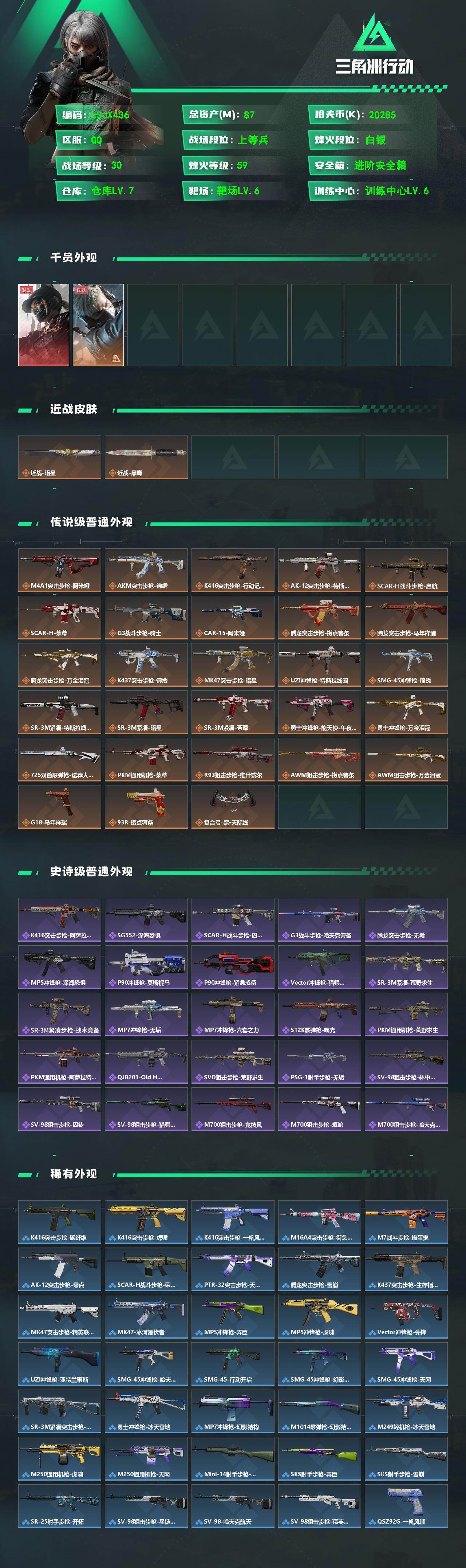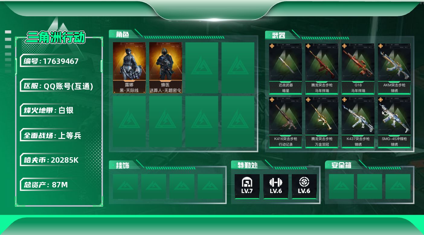 [17639467]【特价出售/店主推荐】87m总资产-20285k哈伏币-59烽火等级-白银-30战场等级-上等兵 【干员外观】:露娜-黑·天际线,蜂医-送葬人·无题密令 【近战皮肤】:近战-暗星,近战-黑鹰 【传说外观】:M4A1突击步枪-阿米娅,AKM突击步枪-锦绣,K416突击步枪-行动记录,AK-12突击步枪-特斯拉线圈,SCAR-H战斗步枪-启航,SCAR-H战斗步枪-荼蘼,G3战斗步枪-骑士,CAR-15突击步枪-阿米娅,腾龙突击步枪-捞点薯条,腾龙突击步枪-马年祥瑞,腾龙突击步枪-万金泪冠,K437突击步枪-锦绣,MK47突击步枪-暗星,UZI冲锋枪-特斯拉线圈,SMG-45冲锋枪-锦绣,SR-3M紧凑突击步枪-特斯拉线圈,SR-3M紧凑突击步枪-暗星,SR-3M紧凑突击步枪-荼蘼,勇士冲锋枪-能天使-午夜邮差,勇士冲锋枪-万金泪冠,725双管霰弹枪-送葬人-无题密令,PKM通用机枪-荼蘼,R93狙击步枪-维什戴尔,AWM狙击步枪-捞点薯条,AWM狙击步枪-万金泪冠,G18-马年祥瑞,93R-捞点薯条,复合弓-黑·天际线 【史诗外观】:K416突击步枪-阿萨拉特攻,SG552突击步枪-深海恐惧,SCAR-H战斗步枪-囚徒,G3战斗步枪-哈夫克警备,腾龙突击步枪-无垢,MP5冲锋枪-深海恐惧,P90冲锋枪-莫斯提马,P90冲锋枪-紧急戒备,Vector冲锋枪-猎鳄行动,SR-3M紧凑突击步枪-荒野求生,SR-3M紧凑突击步枪-战术竞备,MP7冲锋枪-无垢,MP7冲锋枪-六套之力,S12K霰弹枪-曙光,PKM通用机枪-荒野求生,PKM通用机枪-阿萨拉特攻,QJB201轻机枪-Old Habits,SVD狙击步枪-荒野求生,PSG-1射手步枪-无垢,SV-98狙击步枪-林中猎手,SV-98狙击步枪-囚徒,SV-98狙击步枪-猎鳄行动,M700狙击步枪-竞技风,M700狙击步枪-蝮蛇,M700狙击步枪-哈夫克警备 【稀有外观】:K416突击步枪-碳纤维,K416突击步枪-虎啸,K416突击步枪-一帆风顺,M16A4突击步枪-街头涂鸦,M7战斗步枪-捣蛋鬼,AK-12突击步枪-零点,SCAR-H战斗步枪-荣耀列队,PTR-32突击步枪-天网,腾龙突击步枪-雪崩,K437突击步枪-生存指令,MK47突击步枪-精英联盟,MK47突击步枪-冰河潜伏者,MP5冲锋枪-弄臣,MP5冲锋枪