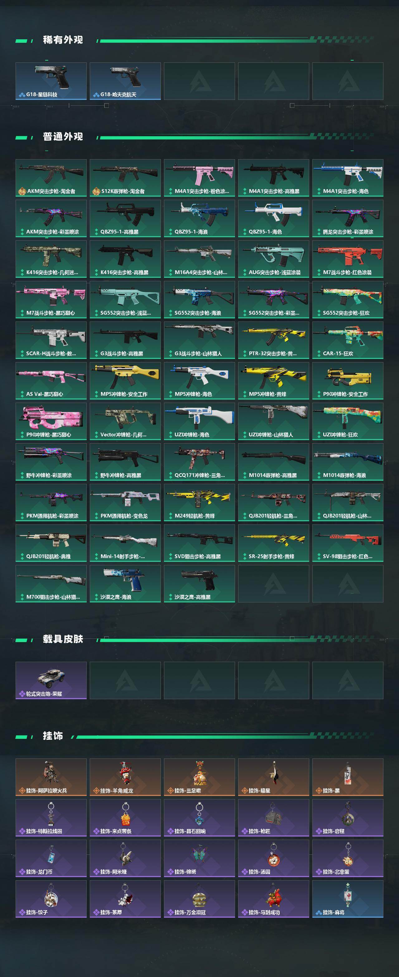 【稀有外观】:K416突击步枪-碳纤维,K416突击步枪-虎啸,K416突击步枪-一帆风顺,M16A4突击步枪-街头涂鸦,M7战斗步枪-捣蛋鬼,AK-12突击步枪-零点,SCAR-H战斗步枪-荣耀列队,PTR-32突击步枪-天网,腾龙突击步枪-雪崩,K437突击步枪-生存指令,MK47突击步枪-精英联盟,MK47突击步枪-冰河潜伏者,MP5冲锋枪-弄臣,MP5冲锋枪