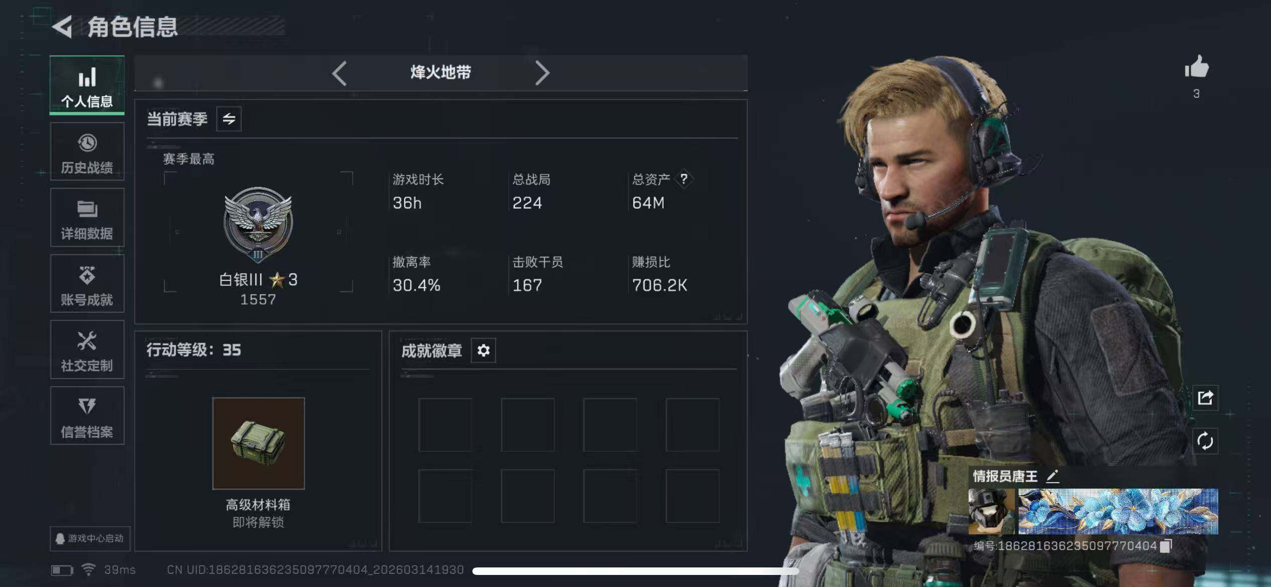 [17639491]可二次【特价出售/店主推荐】63m总资产-508k哈伏币-35烽火等级-白银-1战场等级-无军衔
