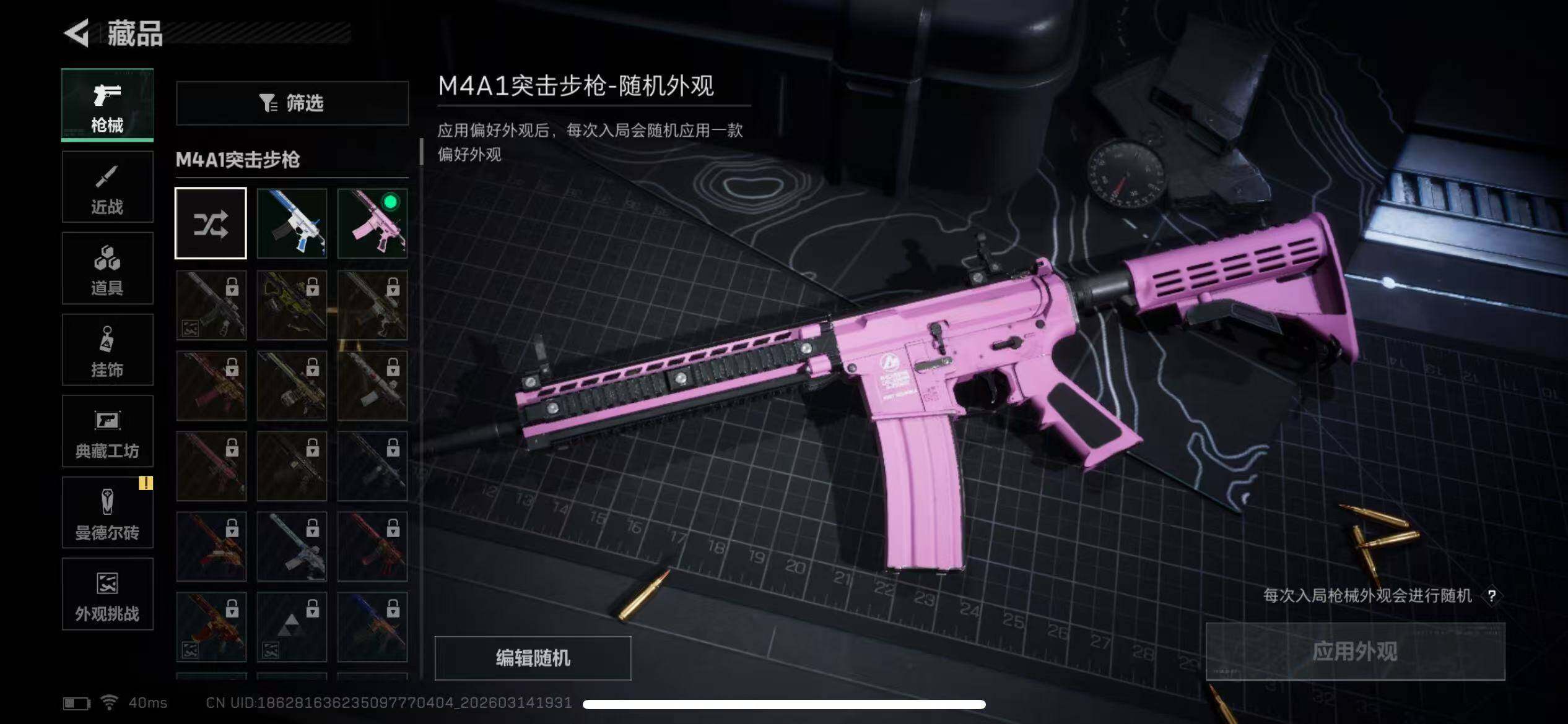 【普通外观】:M4A1突击步枪-粉色涂装,M4A1突击步枪-海色,QBZ95-1突击步枪-海浪,K416突击步枪-高雅黑,M16A4突击步枪-高雅黑,M7战斗步枪-红色涂装,SG552突击步枪-浅蓝涂装,SG552突击步枪-狂欢,SCAR-H战斗步枪-数码迷彩,PTR-32突击步枪-黄蜂,CAR-15突击步枪-狂欢,UZI冲锋枪-海色,QJB201轻机枪-三角洲力量,QJB201轻机枪-典雅