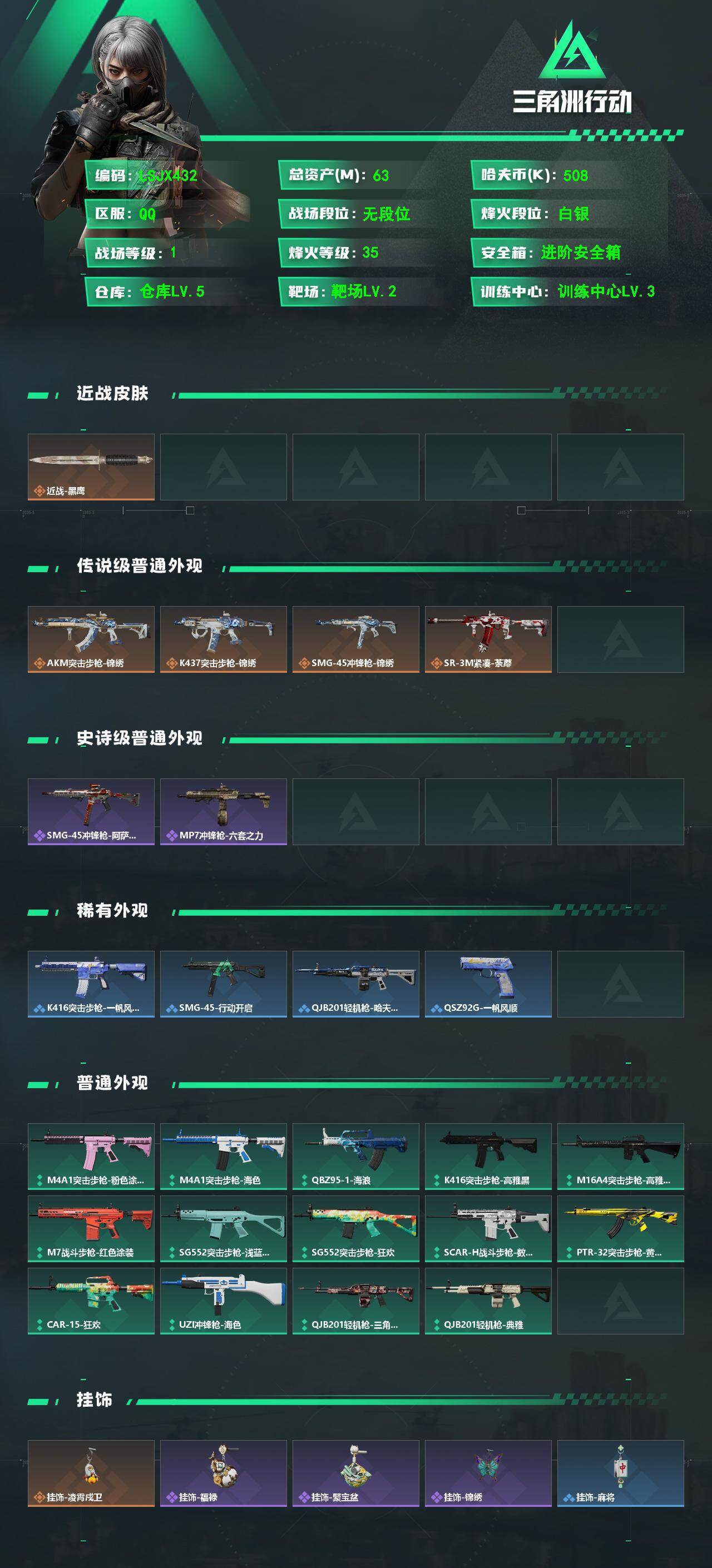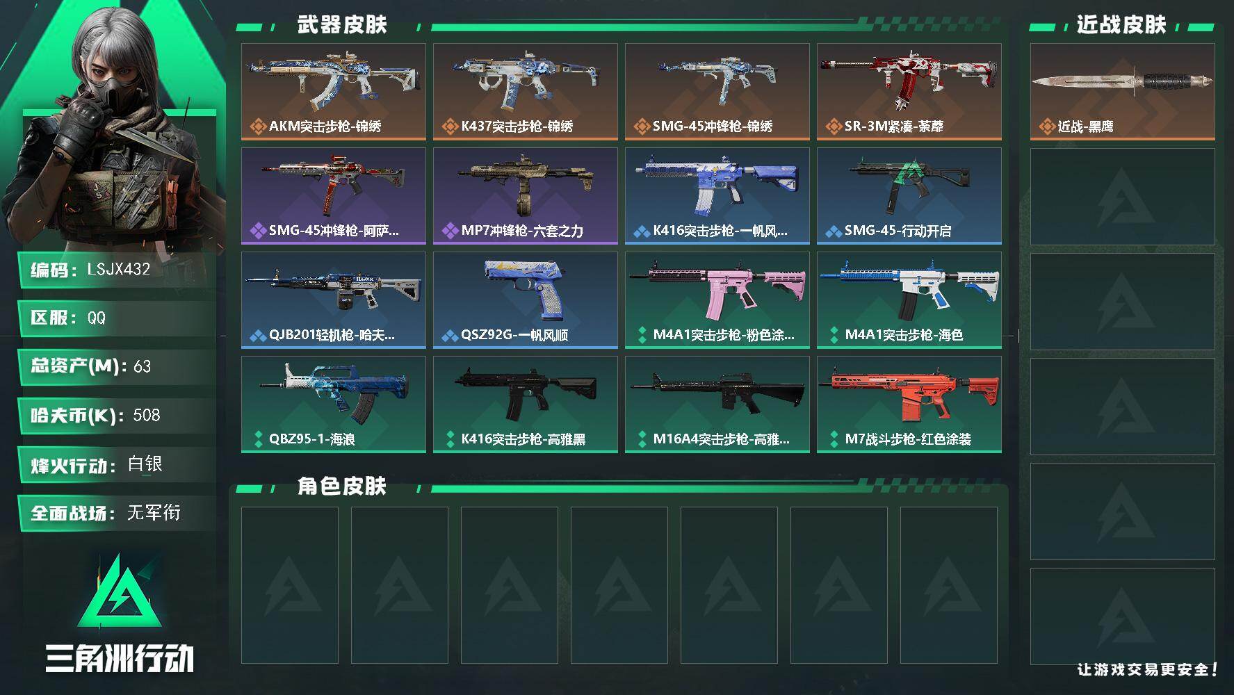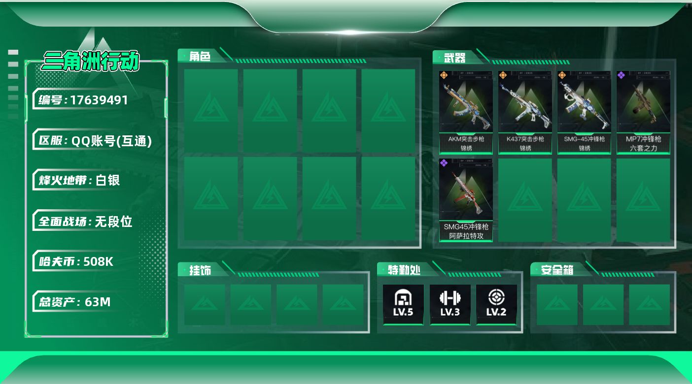 [17639491]可二次【特价出售/店主推荐】63m总资产-508k哈伏币-35烽火等级-白银-1战场等级-无军衔 【近战皮肤】:近战-黑鹰 【传说外观】:AKM突击步枪-锦绣,K437突击步枪-锦绣,SMG-45冲锋枪-锦绣,SR-3M紧凑突击步枪-荼蘼 【史诗外观】:SMG-45冲锋枪-阿萨拉特攻,MP7冲锋枪-六套之力 【稀有外观】:K416突击步枪-一帆风顺,SMG-45冲锋枪-行动开启,QJB201轻机枪-哈夫克卫队,QSZ92G-一帆风顺 【普通外观】:M4A1突击步枪-粉色涂装,M4A1突击步枪-海色,QBZ95-1突击步枪-海浪,K416突击步枪-高雅黑,M16A4突击步枪-高雅黑,M7战斗步枪-红色涂装,SG552突击步枪-浅蓝涂装,SG552突击步枪-狂欢,SCAR-H战斗步枪-数码迷彩,PTR-32突击步枪-黄蜂,CAR-15突击步枪-狂欢,UZI冲锋枪-海色,QJB201轻机枪-三角洲力量,QJB201轻机枪-典雅 【挂饰】:挂饰-凌霄戍卫,挂饰-福禄*2,挂饰-聚宝盆,挂饰-锦绣,挂饰-麻将*7