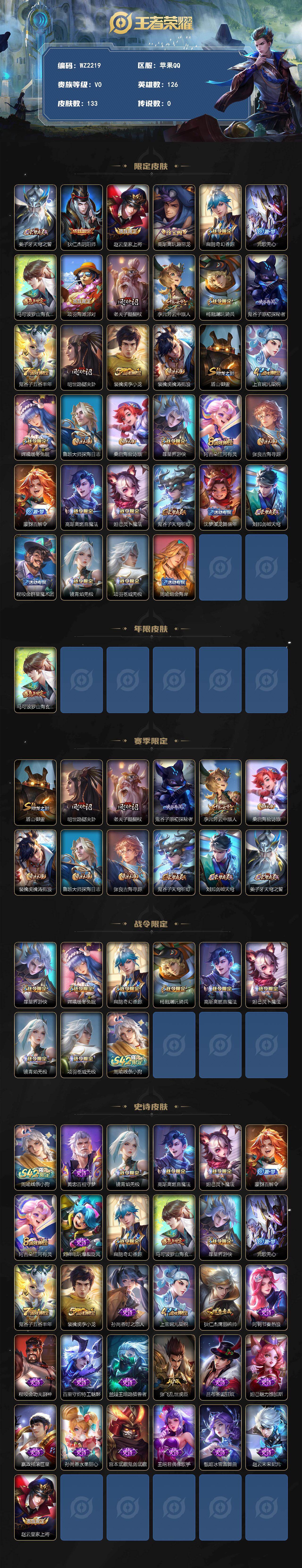 - [10657200]V5 1典藏 3传说 124英雄 205皮肤 可修改实名 荣耀水晶:杀手不太冷 传说皮:冠军飞将,久胜战神 珍宝阁皮:妄想食味,蔷薇恋人 限定皮:逐霄战戟,鸣野蒿,高山流水,五谷丰年,冰锋战神,奔雷神使(牛魔年限),李小龙,逐梦之光,猪悟能 史诗皮:化蝶舞,鸭鸭历险记-刘禅,龙之律动,蒙犽顽岩魄,紫霞仙子,电玩小子(小书包),电玩·爆裂旋风,江河有灵,雪夜绮愿(周瑜),百解令(蒙犽),偶像歌手,末日机甲-吕布,猫狗日记-大乔,乱世虎臣,节奏热浪,女仆咖啡,水果甜心,天才门将,星夜王子,功夫厨神,德古拉伯爵,暗隐猎兽者,幽灵船长,鬼剑武藏,心灵战警,舞动绿茵,地狱岩魂,纤云弄巧,拒霜思,缤纷独角兽,乘风破浪,逐浪之夏,水晶猎龙者,金属风暴,原初追逐者,圣诞狂欢,圣诞恋歌,鹰眼统帅,魅力维加斯,无心,未来纪元-赵云