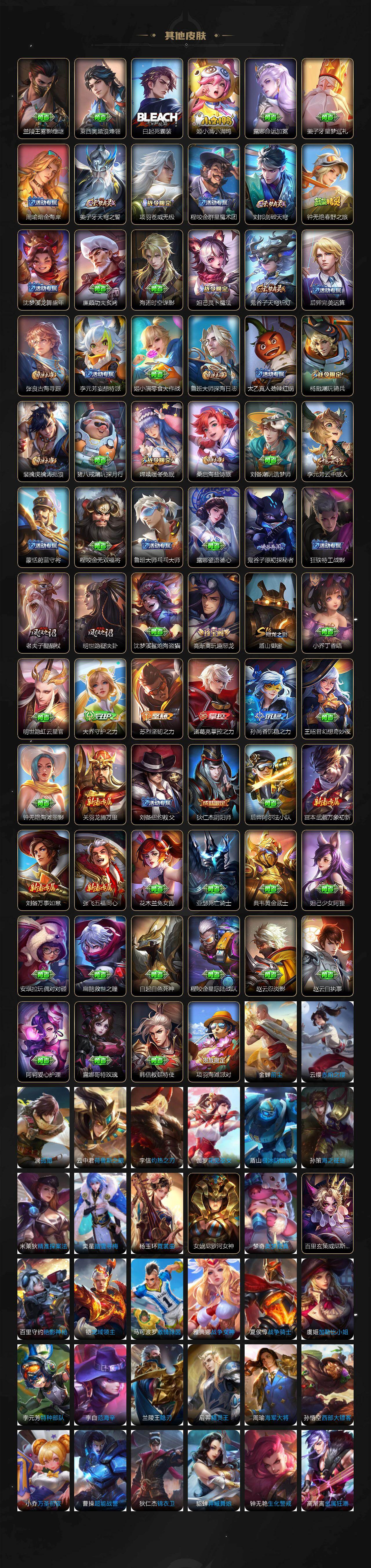 【其他皮肤】:兰陵王雾影缉谜,莱西奥踏浪烽翎,白起死霸装,姬小满小满鸭,露娜命运加冕,姜子牙星梦巡礼,周瑜熔金海岸,姜子牙天穹之誓,项羽苍威无极,程咬金群星魔术团,刘邦剑破天穹,钟无艳春野之旅,沈梦溪龙舞盛年,廉颇功夫炙烤,海诺时空谍影,妲己灵卜魔法,鬼谷子天穹祈灯,后羿完美运算,张良古海寻踪,李元芳妄想特派,姬小满零食大作战,鲁班大师探海日志,太乙真人劲辣红锅,杨戬潮玩骑兵,裴擒虎擒涛扼浪,猪八戒潮玩探月行,嫦娥暖冬兔眠,桑启海盐诗旅,刘备潮玩造梦师,李元芳云中旅人,蒙恬蔚蓝守将,程咬金无双福将,鲁班大师乓乓大师,露娜瓷语鉴心,鬼谷子原初探秘者,狂铁特工战影,老夫子醍醐杖,明世隐疑决卦,沈梦溪鲨炮海盗